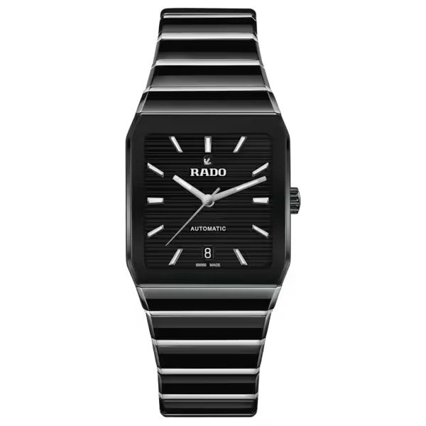 Seit ihrem Debüt im Jahr 1983 ist die Rado Anatom ein Symbol für bahnbrechendes Design und ultimativen Tragekomfort. Ihr charakteristisches Merkmal ist das zylindrische, metallisierte Saphirglas mit facettierten Kanten auf beiden Seiten, das nahtlos in ein Armband aus Hightech-Keramik übergeht und so eine glatte, durchgehende Form schafft, die Gehäuse und Armband zu einer geschlossenen Einheit verschmelzen lässt. Das aus polierter schwarzer Hightech-Keramik und polierten Edelstahl-Mittelgliedern gefertigte Armband wird durch eine Dreifachschliesse aus gebürstetem Edelstahl sorgfältig gesichert. Unter dem markanten Glas liegt ein schwarz lackiertes Zifferblatt, das ein attraktives Muster aus horizontalen Linien aufweist. Die mit weissem Super-LumiNova® versehenen rhodiumfarbenen Zeiger und Indizes bilden einen raffinierten Kontrast, der dem Zifferblatt zusätzlich Tiefe verleiht. Gekrönt wird das Zifferblatt mit dem ikonischen beweglichen Anker bei 12 Uhr, ergänzt durch ein diskretes Datumsfenster bei 6 Uhr. Herzstück der Uhr ist das Automatikwerk vom Kaliber R766 mit 21 Steinen, das durch den Gehäuseboden aus Saphirglas zu sehen ist. Das in fünf Lagen fein justierte Uhrwerk ist mit einer Nivachron™ Spiralfeder ausgestattet und bietet eine hohe Ganggenauigkeit sowie eine robuste Gangreserve von 72 Stunden.