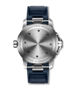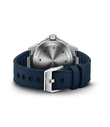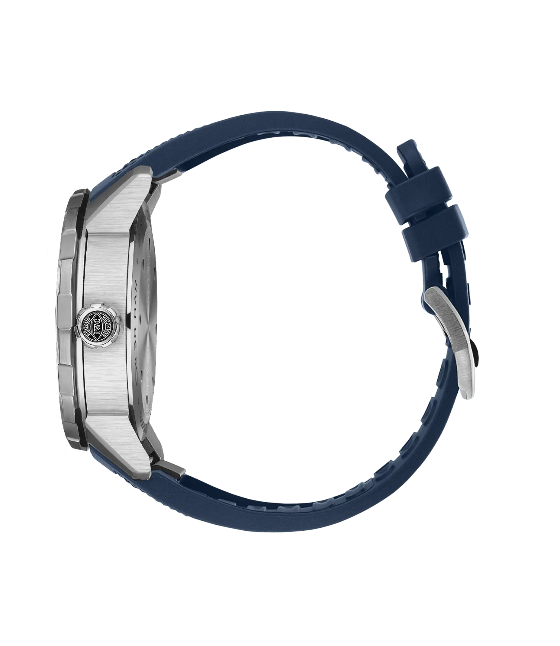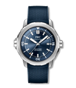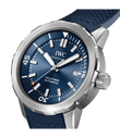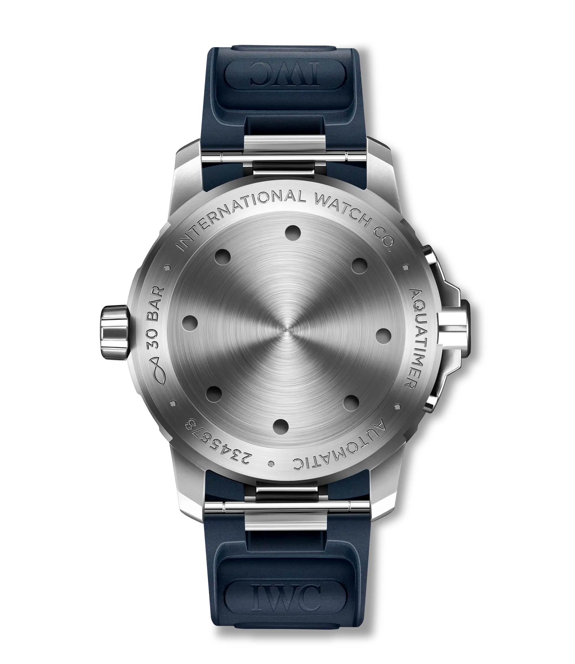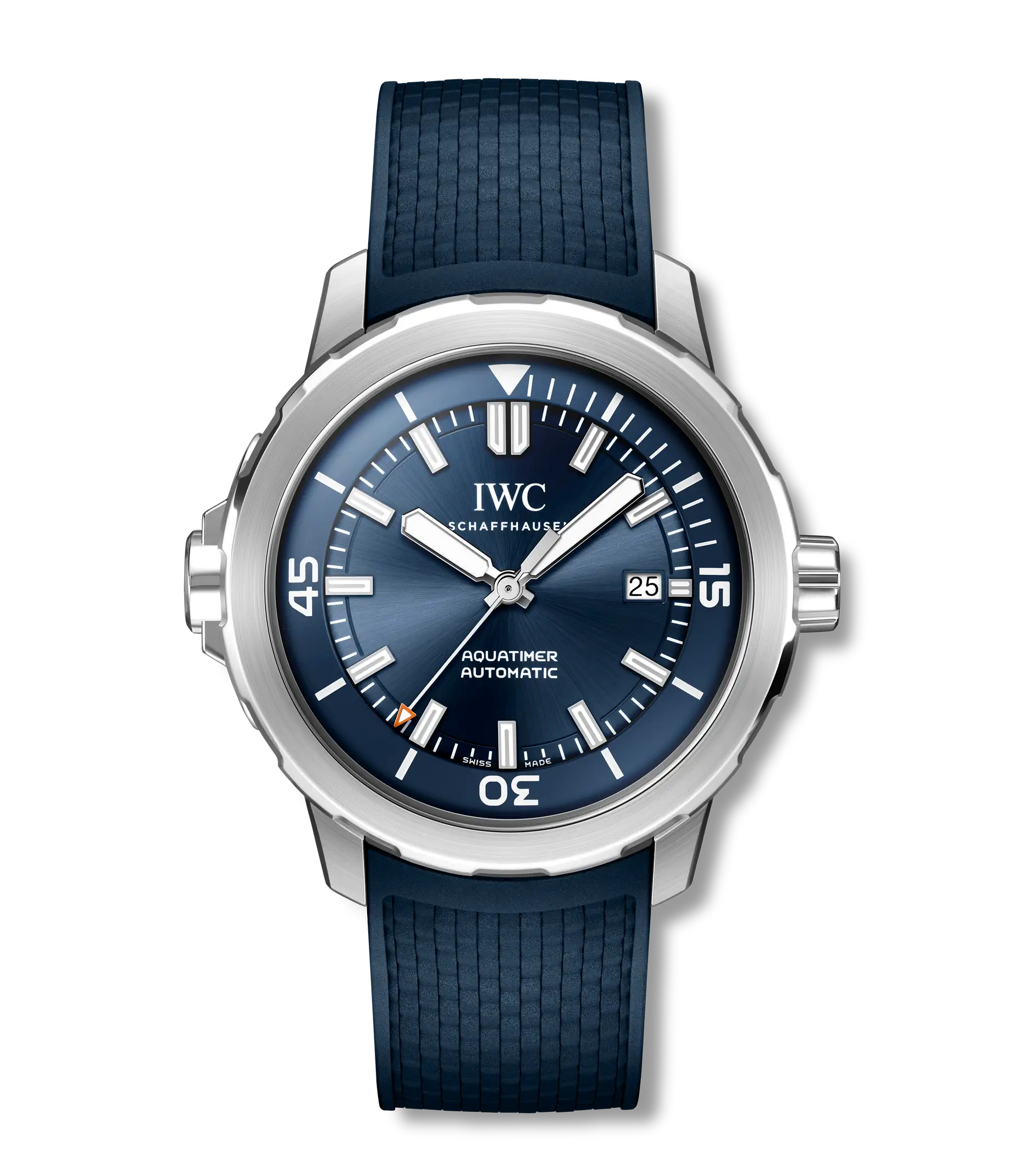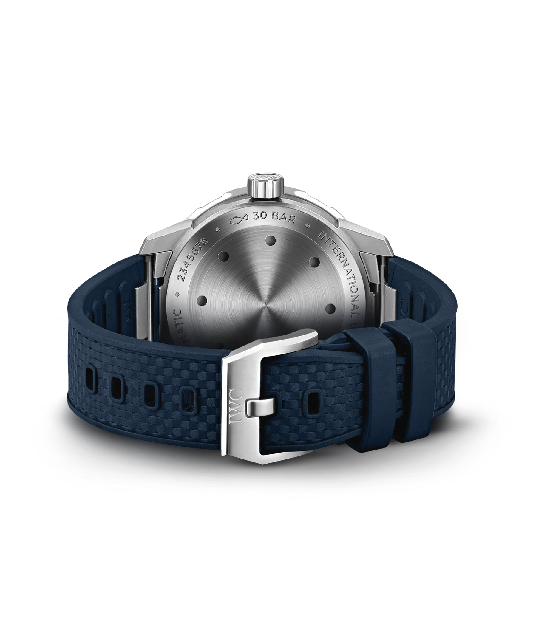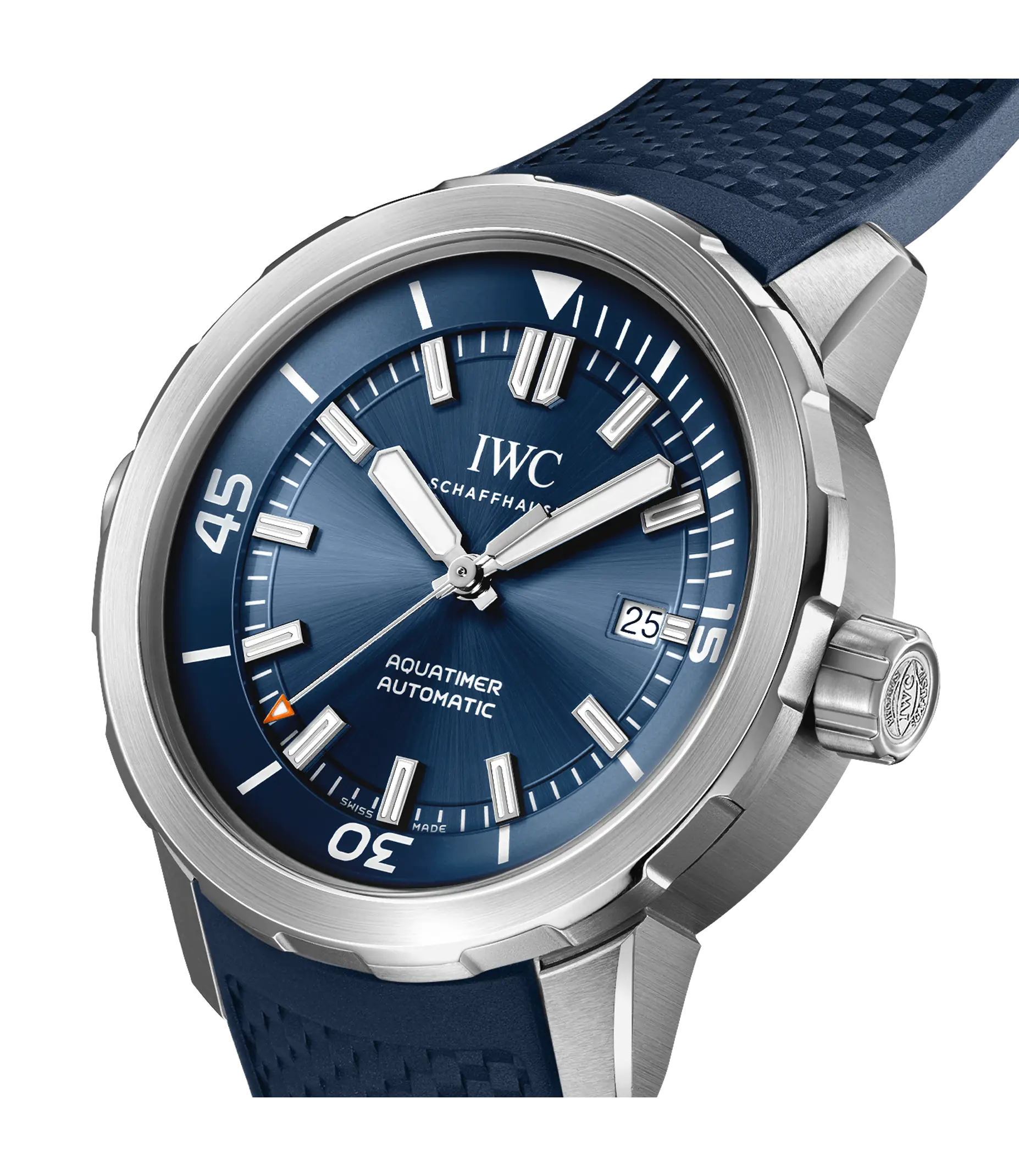 Die Aquatimer Automatic mit dem IWC-Manufakturkaliber 32111 verfügt über ein Edestahlgehäuse, ein blaues Zifferblatt und ein blaues Kautschukarmband. Eine robuste Konstruktion, hohe Druckfestigkeit, einfache Ablesbarkeit und innovative technische Funktionalität: Das sind die wichtigsten Merkmale der Aquatimer-Taucheruhren, die IWC seit 1967 entwickelt und die sowohl von professionellen als auch von Sporttauchern genutzt werden. Die Aquatimer Automatic ist eine bis 30 bar wasserdichte Taucheruhr in einem 42mm-Gehäuse aus korrosionsbeständigem Edelstahl. Die tauchrelevanten Anzeigen auf dem blauen Zifferblatt sind mit Leuchtmasse beschichtet, um eine optimale Ablesbarkeit unter Wasser zu gewährleisten. Im Inneren arbeitet das IWC-Manufakturkaliber 32111, das über einen automatischen Aufzug verfügt und eine Gangreserve von 120 Stunden speichert. Der innovative Außen-Innen-Drehring kombiniert Bedienfreundlichkeit mit Sicherheit. Die Bewegung der äußeren Lünette wird über ein Kupplungssystem auf den inneren Drehring übertragen. Das SafeDive-System stellt sicher, dass sich der innere Ring mit der Tauchzeitskala immer im Gegenuhrzeigersinn dreht. Selbst bei einem unbeabsichtigten Verstellen kann deshalb die Tauchzeit niemals verlängert werden und die Sicherheit des Tauchers ist stets gewährleistet. Dank des integrierten IWC-Schnellwechselsystem lässt sich das blaue Kautschukband mühelos gegen ein anderes Armband austauschen.