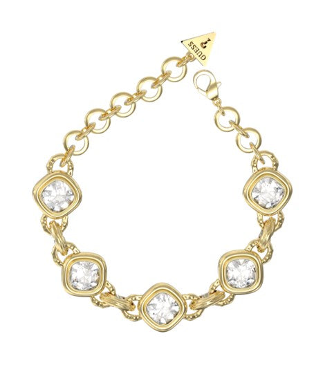 Armband aus Edelstahl, vier große Kristall-Charms. Guess Logo mittig.