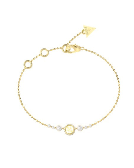 Armband aus Edelstahl , Guess- Logo mittig, synthetische Perlen in weiß.