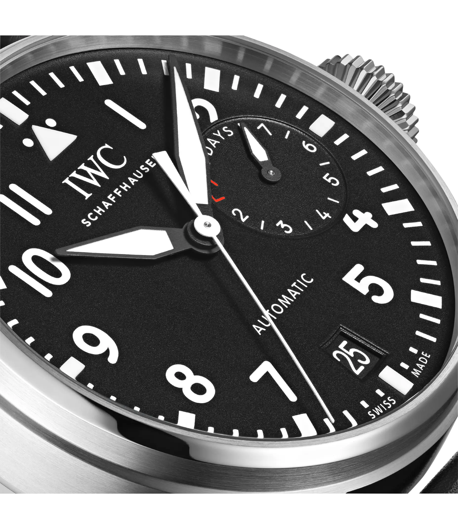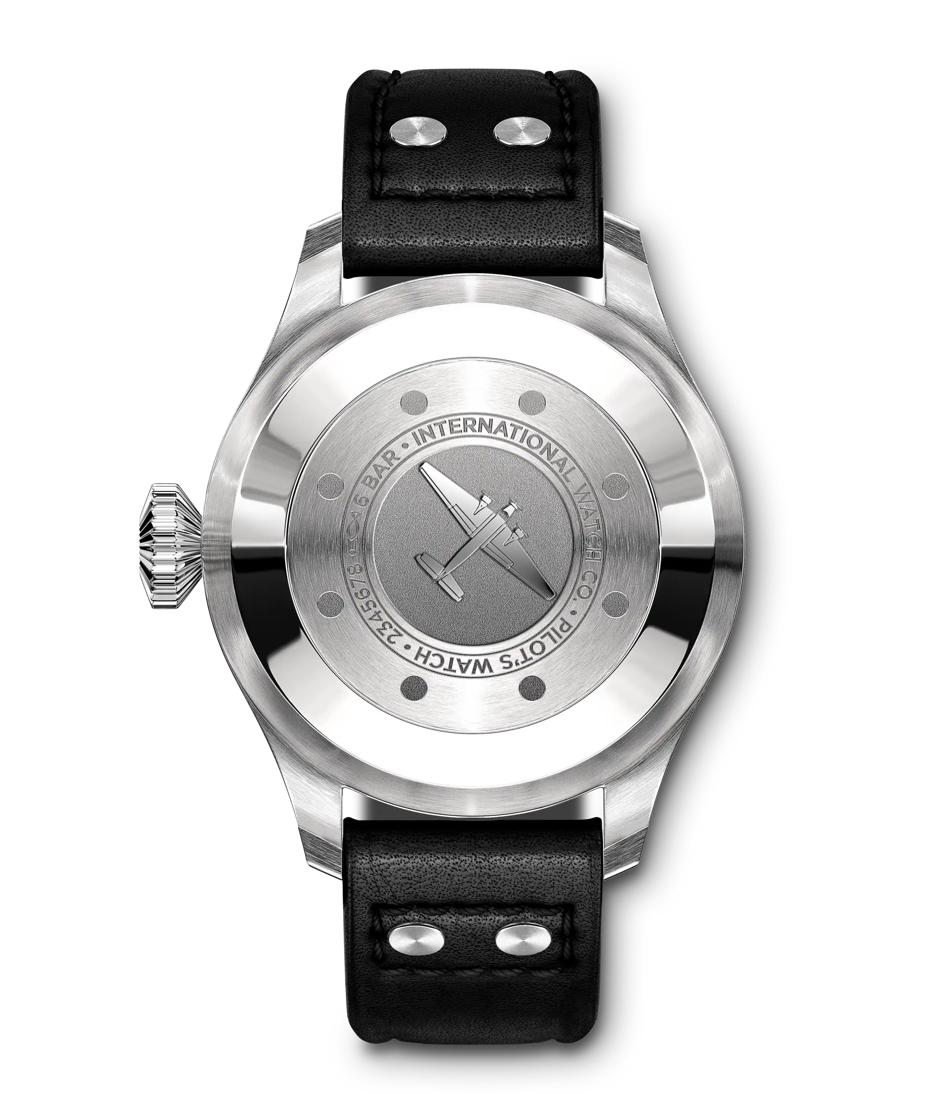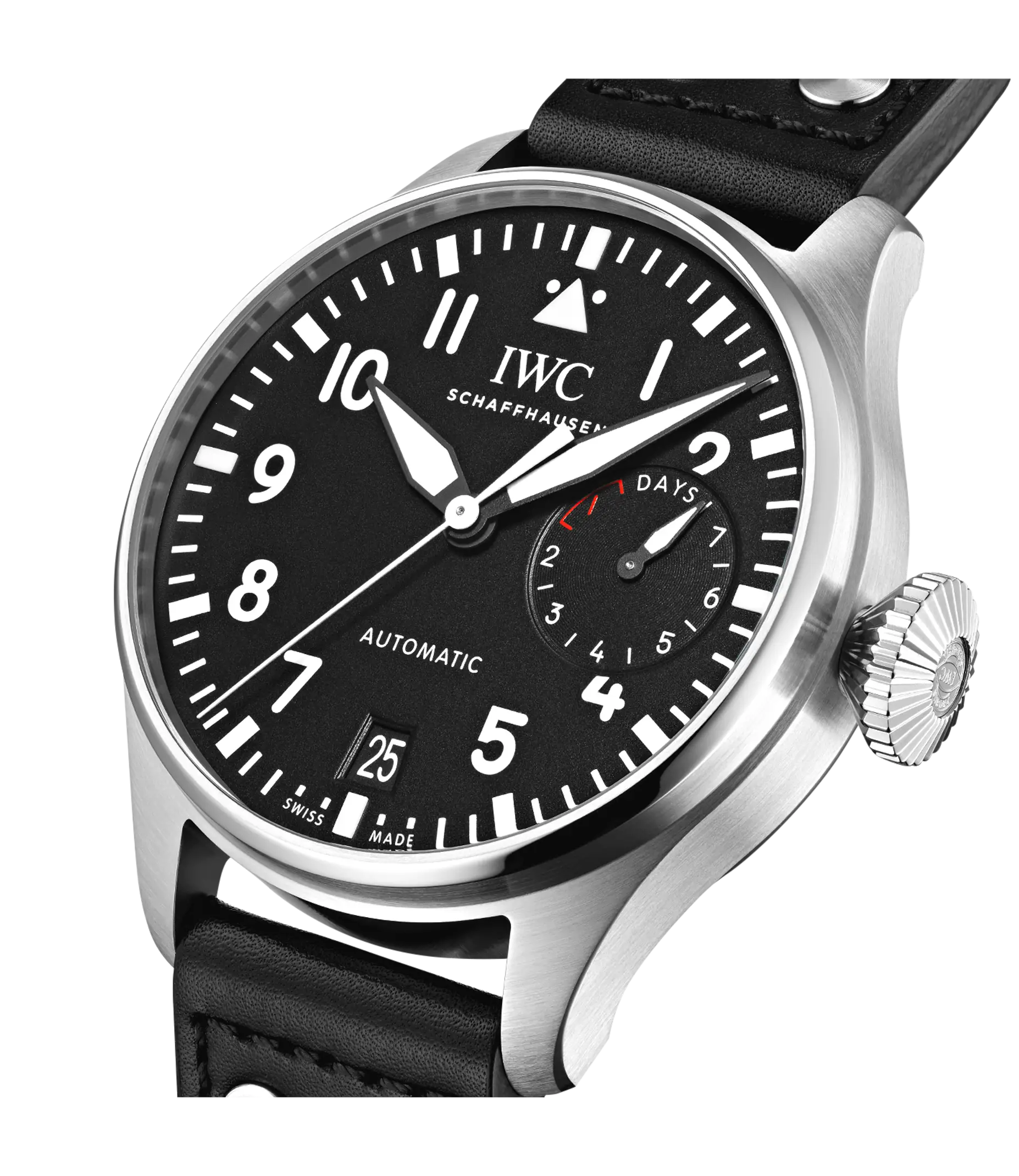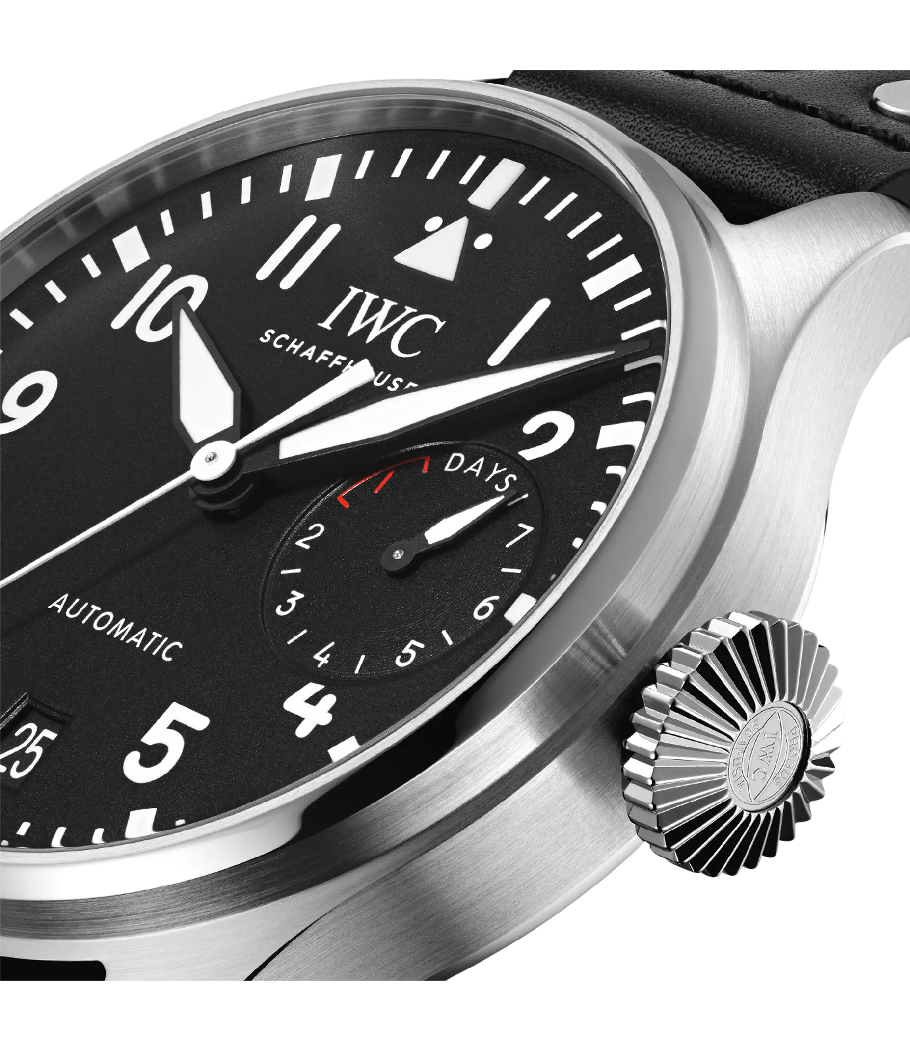 Eine Legende zollt ihrer Vergangenheit Tribut: Die Große Fliegeruhr von IWC ist die kompromissloseste Verkörperung des historischen Navigationsinstruments für Flieger. IWC kehrt ein Stück zu den Wurzeln der Großen Fliegeruhr zurück und spendiert der Big Pilot´s Watch eine behutsame optische Auffrischung. Das IWC-Manufakturkaliber 52110 versammelt Meisterwerke der Uhrmacherkunst. Es verfügt über einen effizienten Pellaton-Automatikaufzug mit Teilen aus schwarzer und weißer Keramik. Er baut in zwei Federhäusen eine Gangreserve von sieben Tagen auf. Die Anzeige bei "3 Uhr" informiert über die verbleibende Laufzeit bis zum Stillstand des Uhrwerks. Die Big Pilot´s Watch besitzt eine Datumsanzeige bei "6 Uhr" und die für den fliegerischen Gebrauch unabdingbare Zentrumsekunde. Das 6 bar wasserdichte 46mm-Gehäuse umfasst einen Weicheisen-Innenkäfig zum Schutz des Uhrwerks vor Magnetfeldern. Die Uhr ist außerdem mit einer markanten Kegelkrone ausgestattet. Der legendäre Flieger Junkers Ju 52 ziert als Gravur den Uhrenboden der Big Pilot´s Watch. Das Armband ist aus schwarzem Kalbsleder gefertigt, das der Uhr hervorragend zu Gesicht steht.
