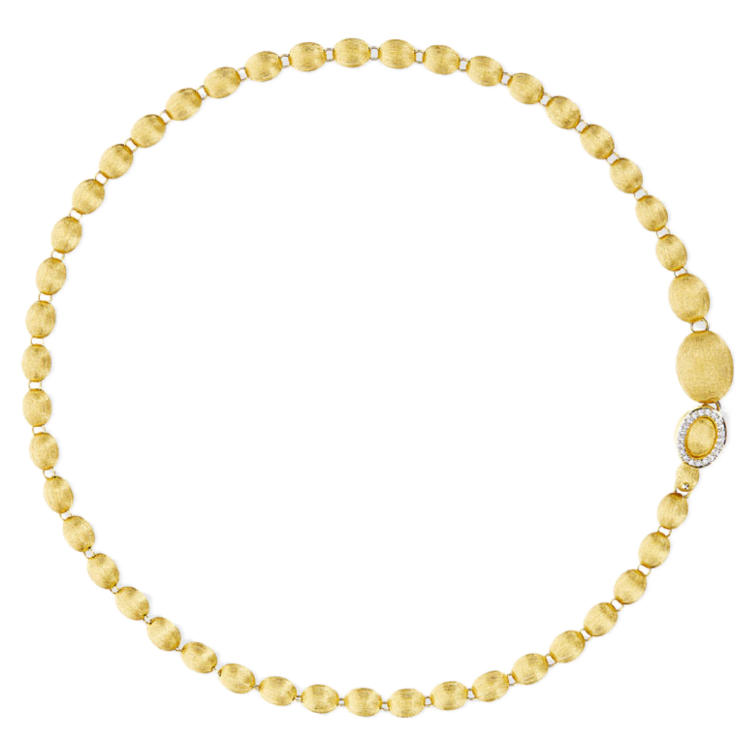 Hier die klassische „Perlenkette“, von unserer Designerin Laura neu interpretiert: Sie besteht aus unseren legendären Kugeln aus 18kt Gold, stundenlang von Hand mit der antiken Stichel-Technik graviert, bis sie leicht und weich wie Seide sind. Ein Schmuckstück, das einen umfängt, und durch seinen Diamanten-Verschluss noch hervorgehoben wird, welcher an jeder einzelnen Kugel befestigt werden kann.