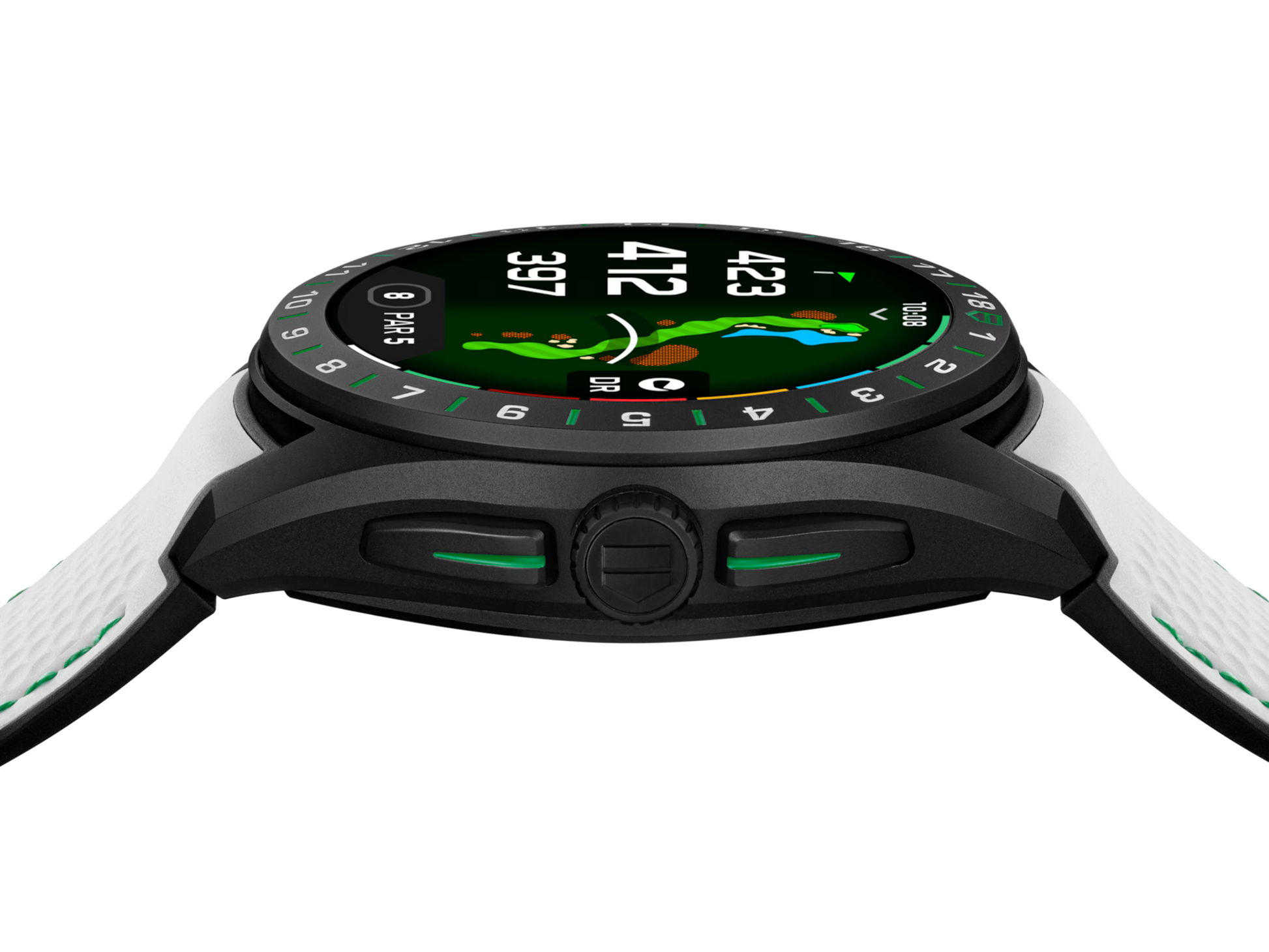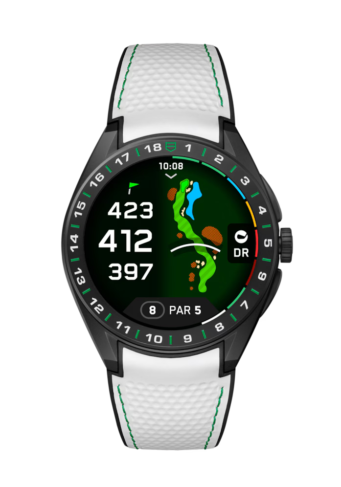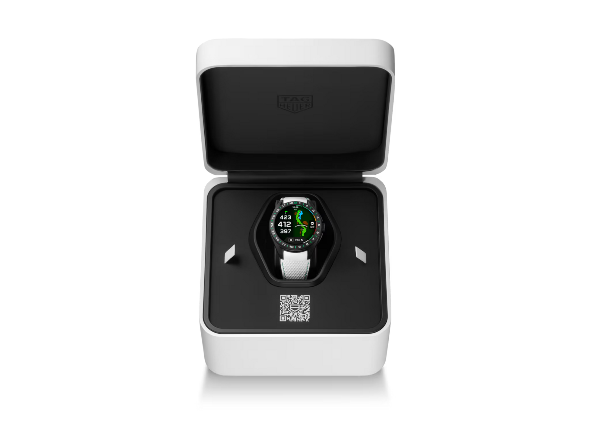 Die TAG Heuer Connected Calibre E5 Golf Edition (45mm) wurde für Golfenthusiasten entwickelt und verbindet Stil mit sportlicher Präzision. Mit ihrem schwarzen, sandgestrahlten Titangehäuse mit 18-Loch-Gravur auf der Lünette und der speziellen Golf-App erweist sie sich auf dem Golfplatz als verlässliche Partnerin. Dieses Modell optimiert das Spielerlebnis mit detailliertem Tracking und speziellen TAG Heuer-Funktionen. Die 18-Loch-Gravur auf der Lünette, die weißen und grünen Akzente und das Armband mit Golfballmuster führen Design und Sport zusammen und versprechen einen Stil, der auf und neben dem Platz auffällt. Mit Unterstützung durch das TAG Heuer OS, eine komplett selbst entwickelte Benutzeroberfläche, integriert diese Smartwatch fortschrittliche Sensoren, GPS und eine Golf-App, die automatisches Scoring, ein neues vollständiges Lochlayout mit automatischem Zoom und detaillierte Spielstatistiken für ein optimiertes Spiel bietet und Ihnen hilft, Ihre Grenzen zu überschreiten. Das robuste und dennoch leichte Gehäuse aus sandgestrahltem Titan mit schwarzer DLC-Beschichtung und die ergonomischen Drücker vereinen robusten Komfort mit einem eleganten Design. Auswechselbare Armbänder erhöhen die Vielseitigkeit und damit den Übergang vom Golfplatz zum Clubhaus. Profitieren Sie von einer Akkulaufzeit von bis zu 3 Tagen im Energiesparmodus und einer Schnellladefunktion, die in nur 30 Minuten einen ganzen Tag Nutzung verspricht. Die neue Golf Edition wurde speziell für anspruchsvolle Golfer entwickelt. Ihre neue weiße Verpackung ist ebenso verheißungsvoll wie die Uhr selbst. Mit dem zusätzlichen schwarzen Armband, das Ihren Look für jede Gelegenheit vervollständigt, sorgen Sie auf und neben dem Platz für Hingucker.