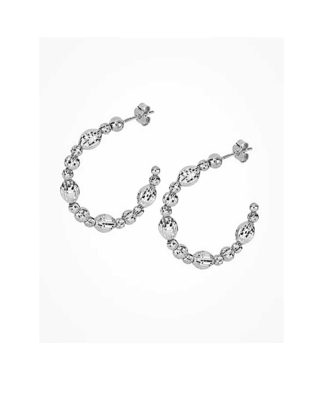 Silberne Creolen mit handmontierter Perlenkette. Die drei diamantgeschliffenen Elemente haben unterschiedliche Formen, um einen dynamischen Glanzeffekt zu erzeugen.