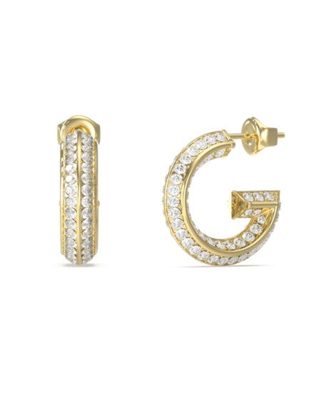 Armband aus plattiertem Edelstahl mit breitgliedriger Struktur. Mittiger G-Logo-Charm mit Pavé-Verzierung. 2 Charms mit Kristallbesatz. Karabinerverschluß....
