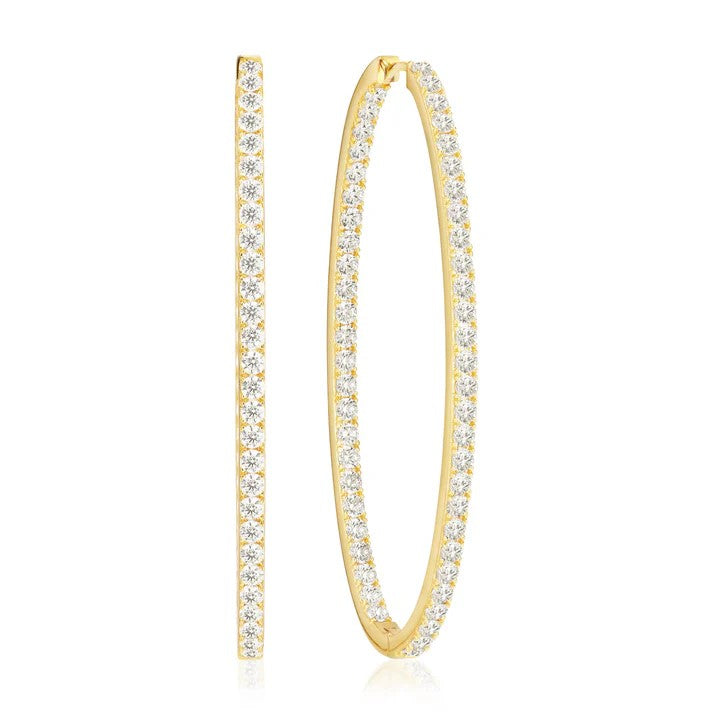 Creolen aus 18 karätig vergoldetem 925er Sterlingsilber, mit polierter Oberfläche und handbesetzt mit weißen Zirkonia im Facettenschliff.