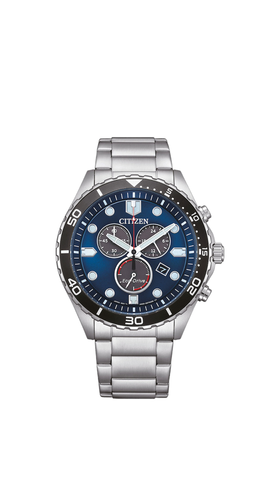 Durchmesser 43mm, Eco-Drive, Gangreserve ca. 240 Tage, Datumsanzeige, Saphirglas, Edelstahl-Gehäuse, Edelstahl-Uhrband, Wasserdicht bis 10 Bar