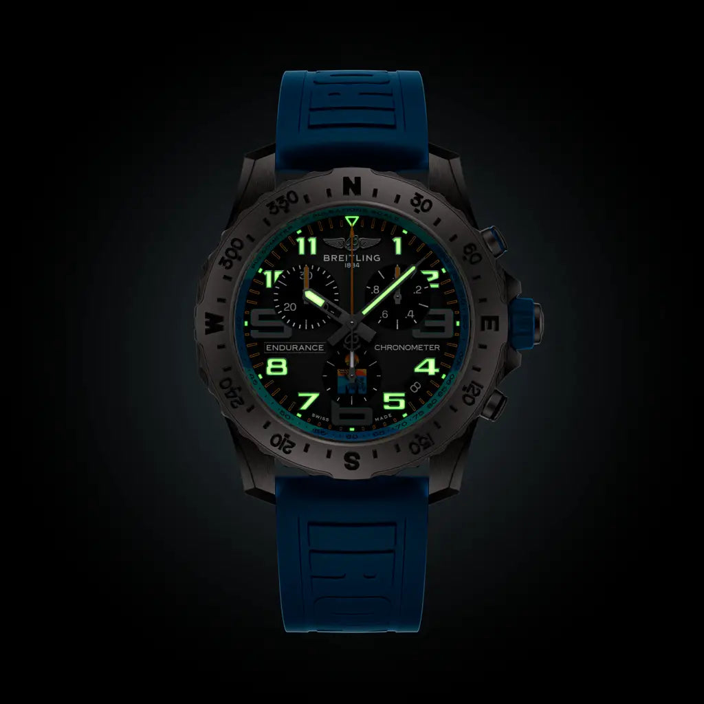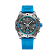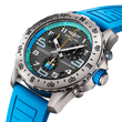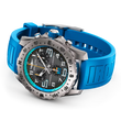 Titan-Gehäuse, hellblaues Kautschukband mit Dornschließe, thermokompensiertes SuperQuartz™-Werk Kaliber Breitling 82, Chronograph, Datumsanzeige, Saphirglas, Durchmesser 44mm, wasserdicht bis 100m, Spezialedition, zwei Jahre Garantie