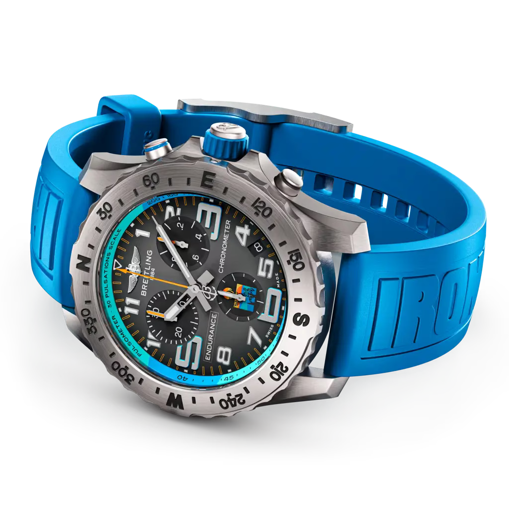Die Breitling Endurance Pro Ironman® World Championship 2025 ist sowohl als Wettkampfuhr, als auch als lässiger Sportchronograph für jeden Tag konzipiert. Sie repräsentiert die perfekte Verschmelzung von höchster Präzision, innovativer Technologie und frischem, farbenfrohem Design. Sie ist die ultimative Athleisure-Uhr. In ihrem Titan-Gehäuse mit 44mm Durchmesser verbirgt sie ein thermokompensiertes SuperQuartz™-Uhrwerk, dessen Ganggenauigkeit zehnmal so hoch ist wie die eines herkömmlichen Quarzuhrwerks. Bei diesem Modell handelt es sich um eine seltene Spezialedition.