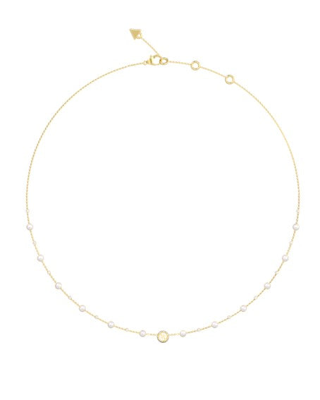 Halskette aus Edelstahl, vergoldet, mittiges Guess Logo, Kristallbesatz und Perlmutt-Charms.