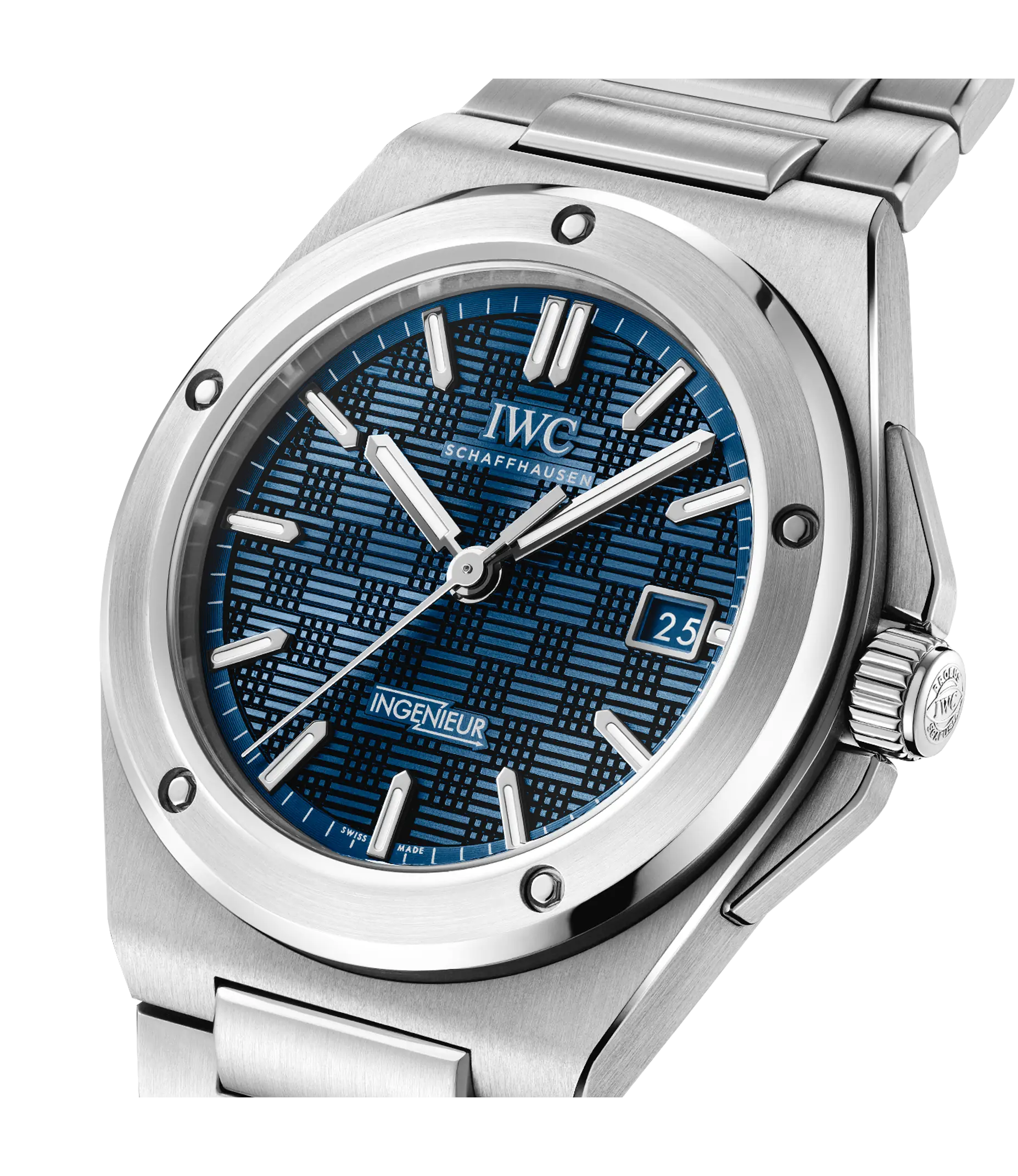 Mit der Ingenieur Automatic 40 greift IWC Schaffhausen das kraftvolle Design von Gérald Gentas ikonischer Ingenieur SL aus den 1970-er Jahren wieder auf. Obwohl IWC die Ingenieur 1955 lancierte, wird der Name dieser Uhr meistens in einem Atemzug mit Gérald Genta genannt. In den 1970-er Jahren schuf der legendäre Genfer Uhrendesigner die Ingenieur SL, Referenz 1832, und verwirklichte damit seine künstlerische Vision einer Luxus-Sportuhr aus Edelstahl mit integriertem Armband. Die Ingenieur Automatic 40 widerspiegelt die starken ästhetischen Codes von Gentas ikonischem Ingenieur-Design und erfüllt dabei gleichzeitig die höchsten Anforderungen hinsichtlich Ergonomie, Verarbeitung und Technik. Diese Version verfügt über ein Gehäuse, eine Lünette sowie ein integriertes Armband mit H-Gliedern und Butterfly-Faltschließe aus Edelstahl, alles aufwändig mit polierten und satinierten Oberflächen veredelt. Die Ergonomie des Gehäuses und des Armbands wurden sorgfältig überarbeitet und bis ins kleinste Detail verbessert. Das 40mm-Gehäuse und die neu entwickelte Befestigung für das Mittelglied sorgen für einen hohen Tragekomfort, auch an schmalen Handgelenken. Die charakteristische Lünette wird mit fünf polygonalen Schrauben auf dem Gehäusering fixiert. Das blaue Zifferblatt weist die markante «Grid»-Struktur auf, die aus zueinander um 90 Grad versetzten, kleinen Linien besteht. Rhodinierte Zeiger und Appliken mit Leuchtmasse sorgen für eine einfache Ablesbarkeit. Im Inneren des Gehäuses arbeitet das Manufakturkaliber 32111, dessen Sperrklinkenaufzug eine Gangreserve von fünf Tagen aufbaut. Im Einklang mit dem technischen Erbe der Ingenieur schützt ein Innengehäuse aus Weicheisen das Uhrwerk vor den Einflüssen von Magnetfeldern. Das bis 10 bar wasserdichte Gehäuse und der neu entwickelte Kronenschutz machen die Ingenieur Automatic 40 zu einer enorm vielseitigen Luxus-Sportuhr für das 21. Jahrhundert.