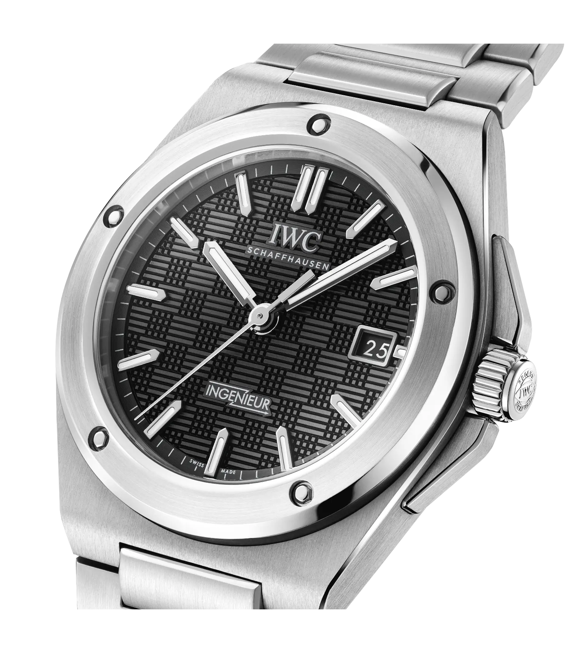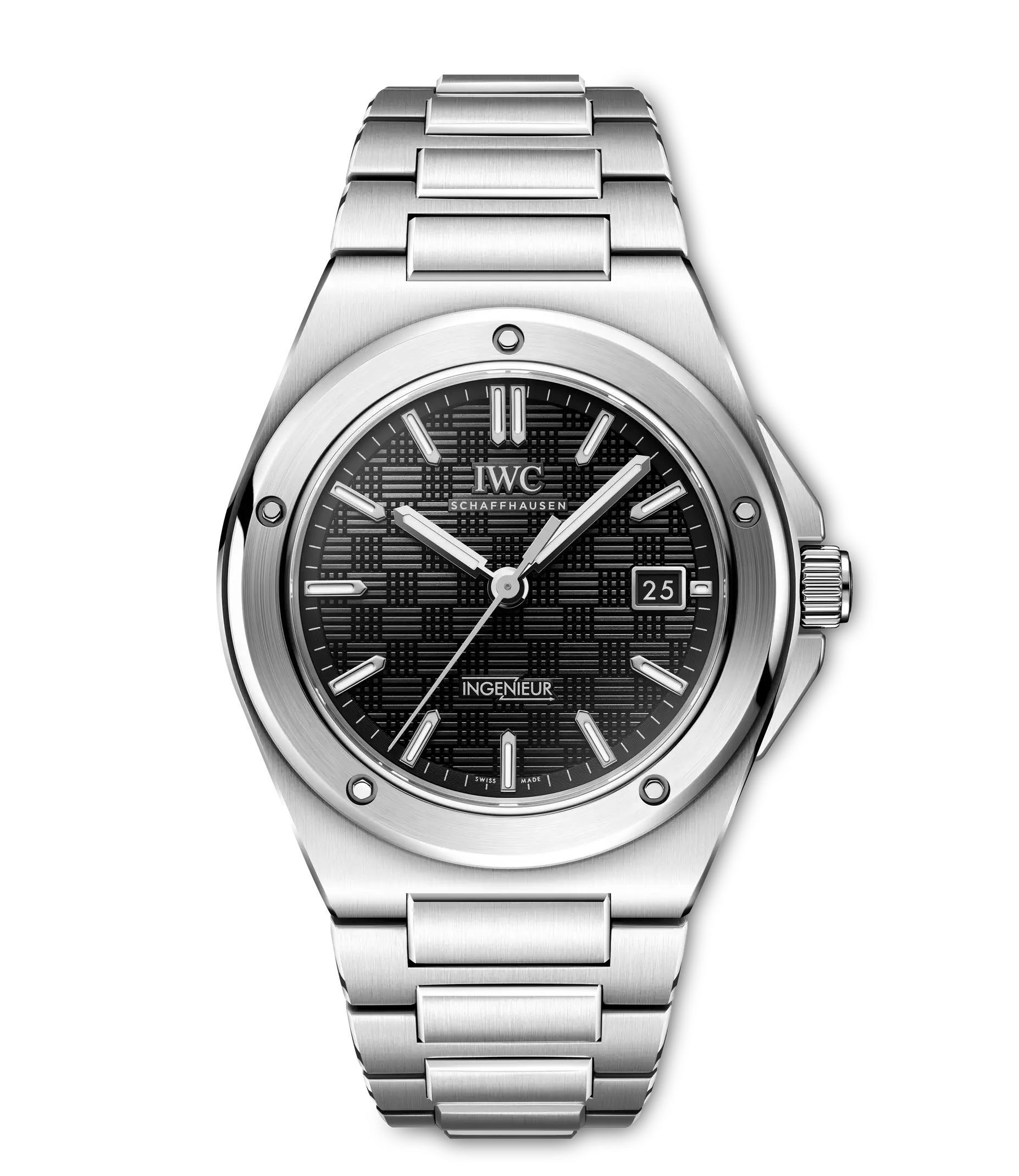 Mit der Ingenieur Automatic 40 greift IWC Schaffhausen das kraftvolle Design von Gérald Gentas ikonischer Ingenieur SL aus den 1970-er Jahren wieder auf. Obwohl IWC die Ingenieur 1955 lancierte, wird der Name dieser Uhr meistens in einem Atemzug mit Gérald Genta genannt. In den 1970-er Jahren schuf der legendäre Genfer Uhrendesigner die Ingenieur SL, Referenz 1832, und verwirklichte damit seine künstlerische Vision einer Luxus-Sportuhr aus Edelstahl mit integriertem Armband. Die Ingenieur Automatic 40 widerspiegelt die starken ästhetischen Codes von Gentas ikonischem Ingenieur-Design und erfüllt dabei gleichzeitig die höchsten Anforderungen hinsichtlich Ergonomie, Verarbeitung und Technik. Diese Version verfügt über ein Gehäuse, eine Lünette sowie ein integriertes Armband mit H-Gliedern und Butterfly-Faltschließe aus Edelstahl, alles aufwändig mit polierten und satinierten Oberflächen veredelt. Die Ergonomie des Gehäuses und des Armbands wurden sorgfältig überarbeitet und bis ins kleinste Detail verbessert. Das 40mm-Gehäuse und die neu entwickelte Befestigung für das Mittelglied sorgen für einen hohen Tragekomfort, auch an schmalen Handgelenken. Die charakteristische Lünette wird mit fünf polygonalen Schrauben auf dem Gehäusering fixiert. Das schwarze Zifferblatt weist die markante «Grid»-Struktur auf, die aus zueinander um 90 Grad versetzten, kleinen Linien besteht. Rhodinierte Zeiger und Appliken mit Leuchtmasse sorgen für eine einfache Ablesbarkeit. Im Inneren des Gehäuses arbeitet das Manufakturkaliber 32111, dessen Sperrklinkenaufzug eine Gangreserve von fünf Tagen aufbaut. Im Einklang mit dem technischen Erbe der Ingenieur schützt ein Innengehäuse aus Weicheisen das Uhrwerk vor den Einflüssen von Magnetfeldern. Das bis 100m wasserdichte Gehäuse und der neu entwickelte Kronenschutz machen die Ingenieur Automatic 40 zu einer enorm vielseitigen Luxus-Sportuhr für das 21. Jahrhundert.