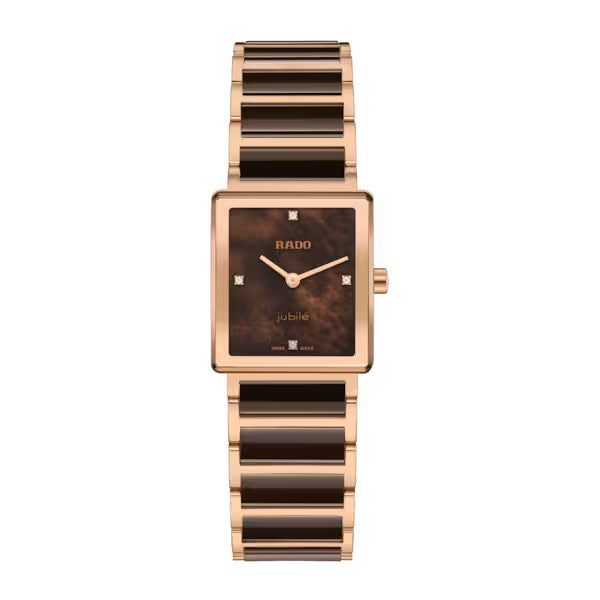 Schon auf den ersten Blick überzeugen das Rado Zifferblatt mit vier Diamanten, die roségoldene Farbgebung und die Glieder aus Hightech-Keramik. Bei genauerem Betrachten des Zifferblatts zeigt sich das sanfte Schimmern von braunem Perlmutt. Das Edelstahlgehäuse mit poliertem roségoldfarbenem PVD-Finish wird von einem Edelstahlarmband mit roségoldfarbener PVD-Beschichtung und polierten braunen Hightech-Keramikgliedern ergänzt. Eine roségoldfarbene Metallisierung rahmt das entspiegelte, facettierte Saphirglas, das sich sanft über das darunter liegende glänzende Perlmuttzifferblatt wölbt. Angetrieben wird das minimalistische, charakteristische Rado Design durch das Quarzwerk. Das Saphirglas und die Glieder aus Hightech-Keramik tragen zum hohen Tragekomfort bei.