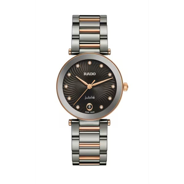 Die LaCoupole ist eine Hommage an die Ikonen von gestern, neu gestaltet für die anspruchsvolle Uhrenträgerin von heute. Ein Ausdruck von raffiniertem Glamour, entwickelt mit der Präzision und Innovationskraft, für die Rado steht. Das 31 mm grosse Monobloc-Gehäuse aus polierter Plasma Hightech-Keramik wird von einem gewölbten Saphirglas mit metallisiertem Rand in Grau und Roségold gekrönt. Das bis 5 bar (50 Meter) wasserdichte Gehäuse verbindet Alltagstauglichkeit mit unvergänglicher Eleganz. Das Wellenmuster des silbernen Zifferblatts ist geprägt und mit Lack gefüllt, wodurch ein opulenter, dreidimensionaler Effekt entsteht. Als Stundenmarkierungen dienen elf Top-Wesselton-Diamanten im Brillantschliff, die dem Zifferblatt einen dezenten Glanz verleihen. Ein Datumsfenster bei 6 Uhr sorgt für eine raffinierte Funktionalität. Herzstück der Uhr ist das mit 8 Steinen versehene Quarzwerk Kaliber R218, das dank PreciDrive™-Technologie eine aussergewöhnliche Präzision aufweist. Das Armband aus polierter Plasma Hightech-Keramik wird durch Elemente und eine Schliesse mit roségoldfarbener PVD-Beschichtung veredelt.