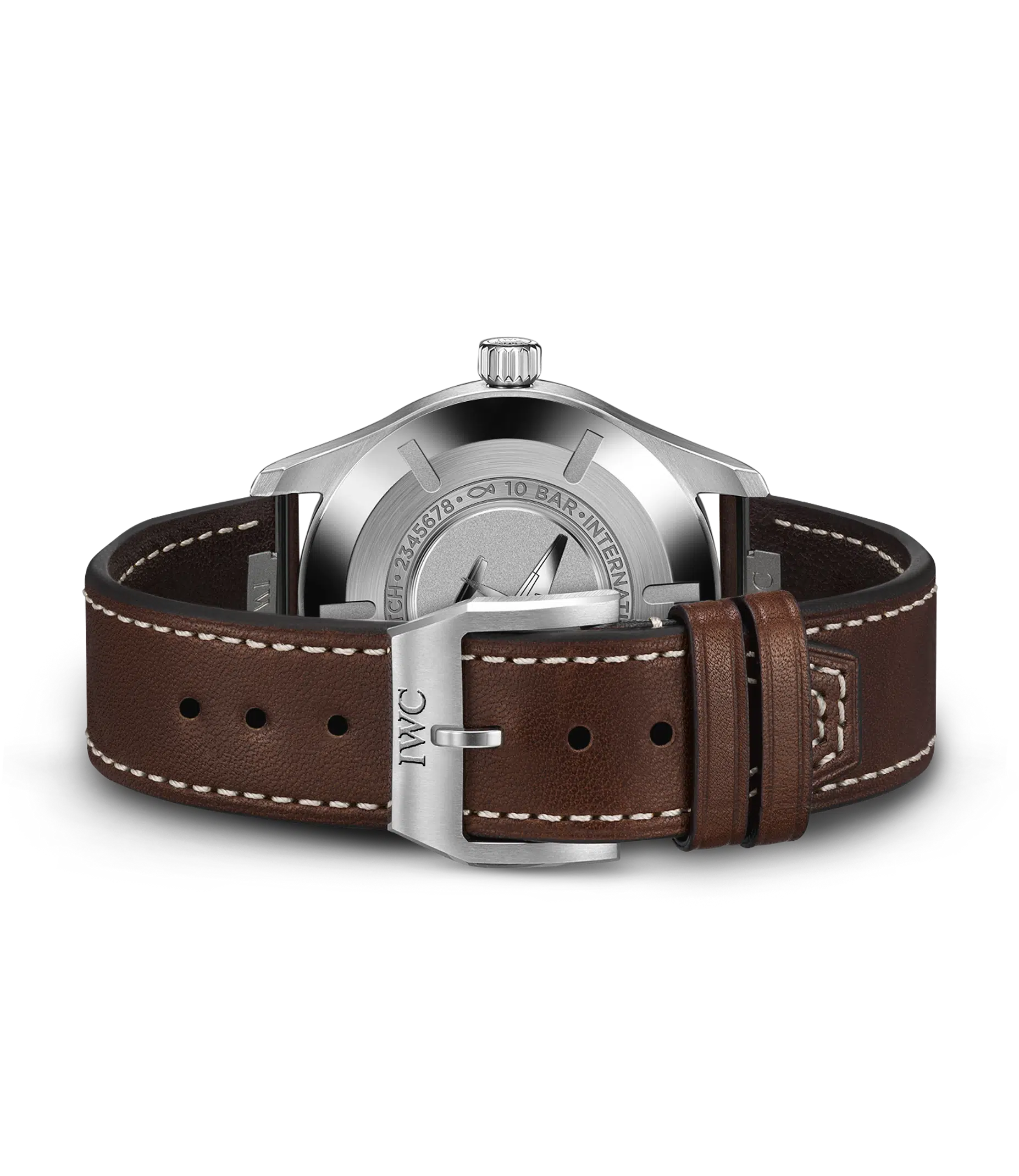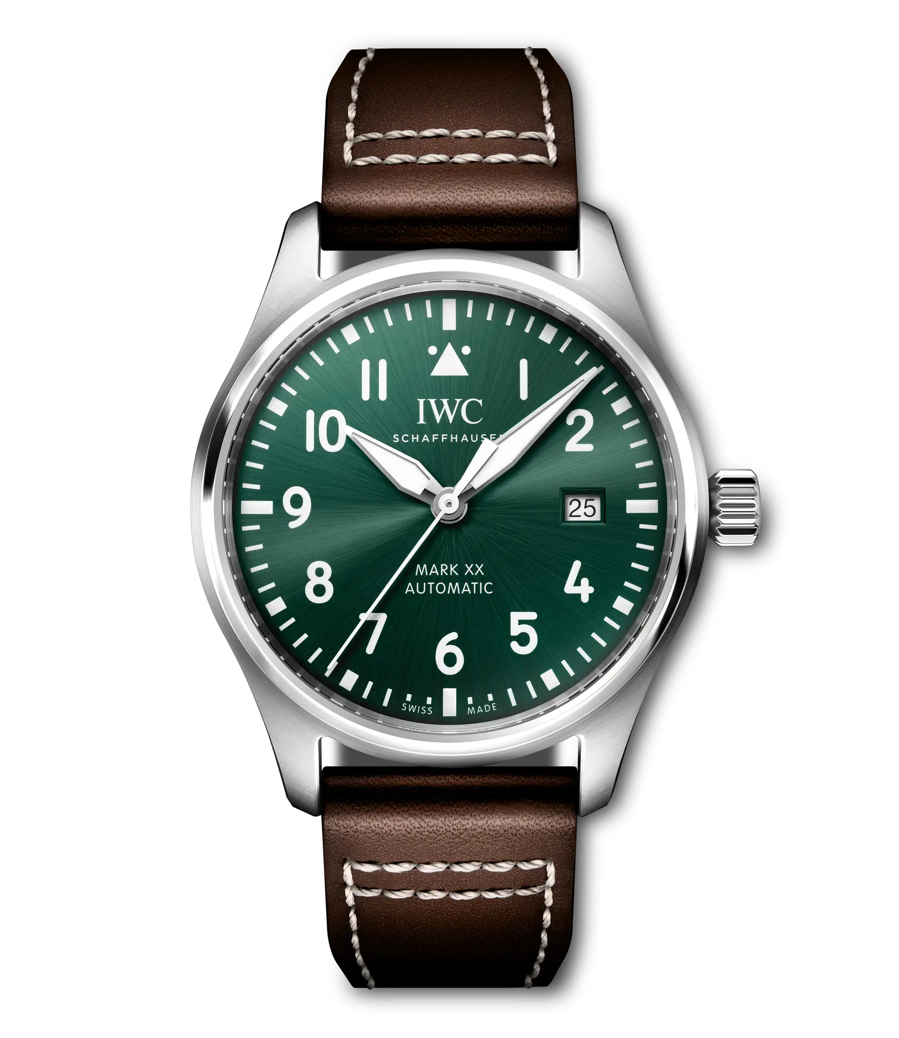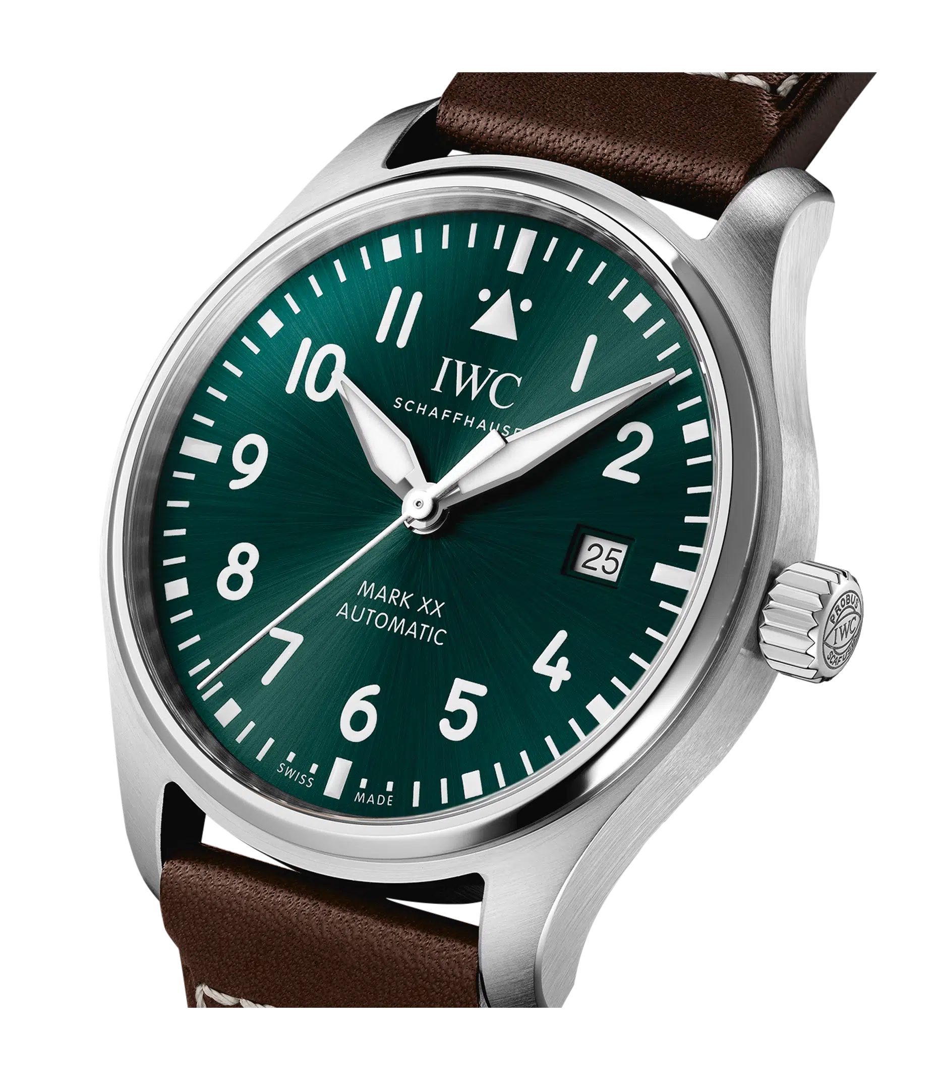 Die Pilot´s Watch Mark XX besticht mit ihrem utilitaristischen Tool-Watch-Design und dem IWC-Manufakturkaliber 32111. Weniger ist mehr: Die Mark XX reduziert das Design und die technische Funktionalität einer Fliegeruhr auf die pure Essenz. Sie ist die Nachfolgerin der legendären Mark 11, einer präzisen amagnetischen Instrumentenuhr, die IWC im Jahr 1948 für die Navigatoren und Piloten der British Royal Air Force entwickelt hat. Diese Variante verfügt über ein robustes und korrosionsbeständiges Gehäuse aus Edelstahl in einem Durchmesser von 40mm, ein grünes Zifferblatt sowie rhodinierte Zeiger. Das kontrastreiche Zifferblatt mit weißen Zahlen und Indizes, dem Markierungsdreieck bei 12 Uhr und Leuchtelementen ist bei allen Lichtverhältnissen einfach ablesbar. Für Präzision sorgt das IWC-Manufakturkaliber 32111 mit Automatikaufzug und einer Gangreserve von 120 Stunden. Das Saphirglas ist speziell gesichert, damit es sich bei einem plötzlichen Druckabfall nicht von seinem Platz lösen kann. Die Pilot´s Watch Mark XX ist bis 10 bar wasserdicht und wird an einem dunkelbraunen Armband aus Kalbsleder mit Dornschließe getragen. Dank des integrierten EasX-CHANGE® Systems lässt sich das Armband einfach und ohne zusätzliches Werkzeug gegen ein anderes wechseln.
