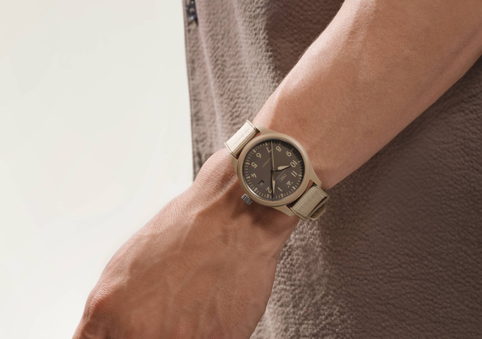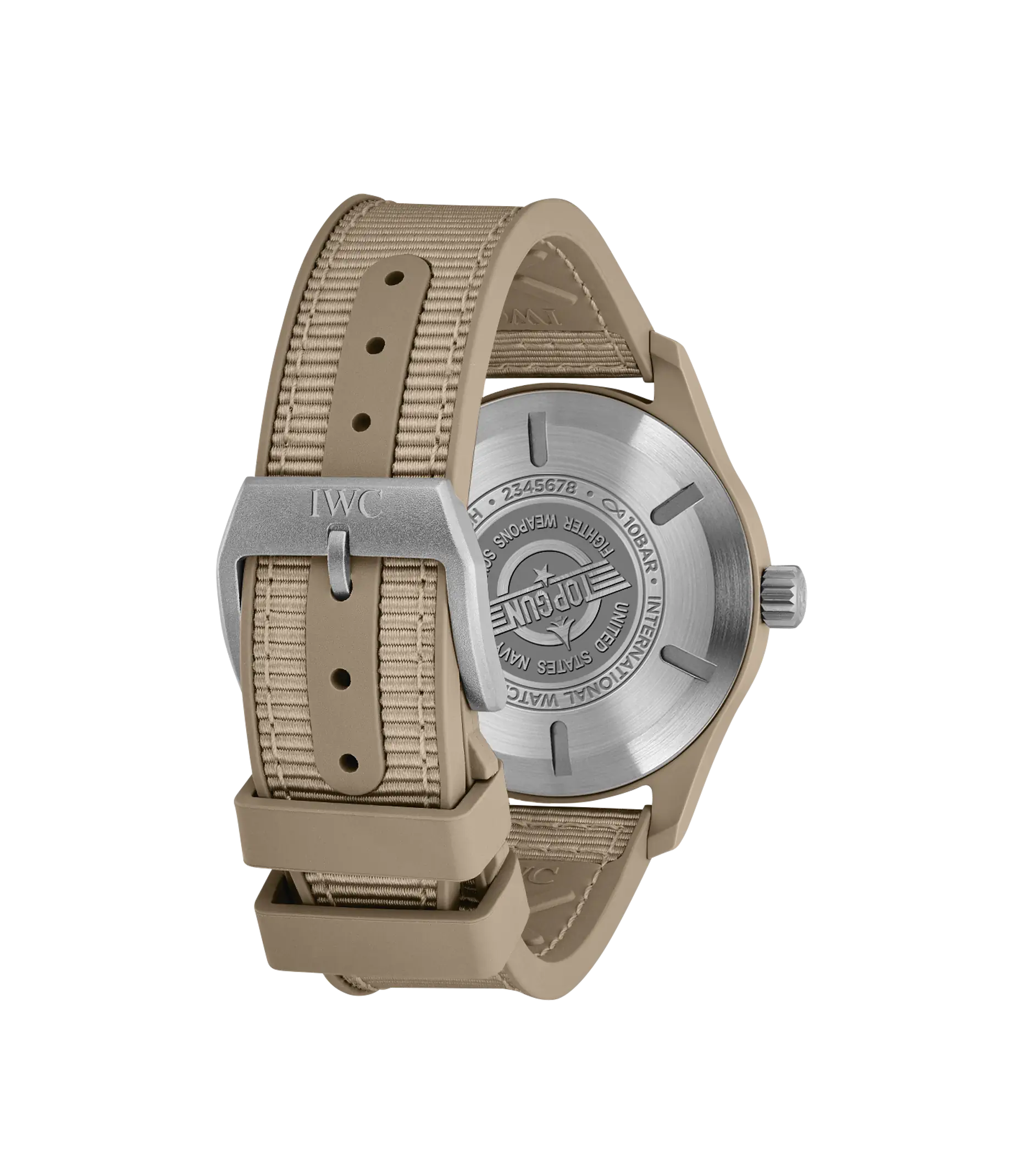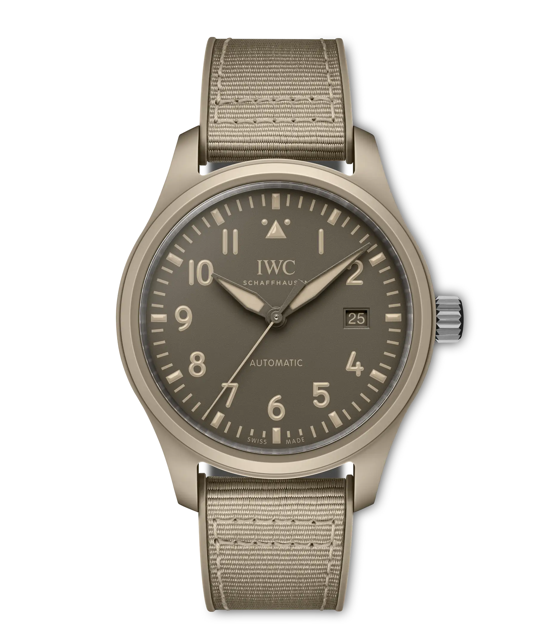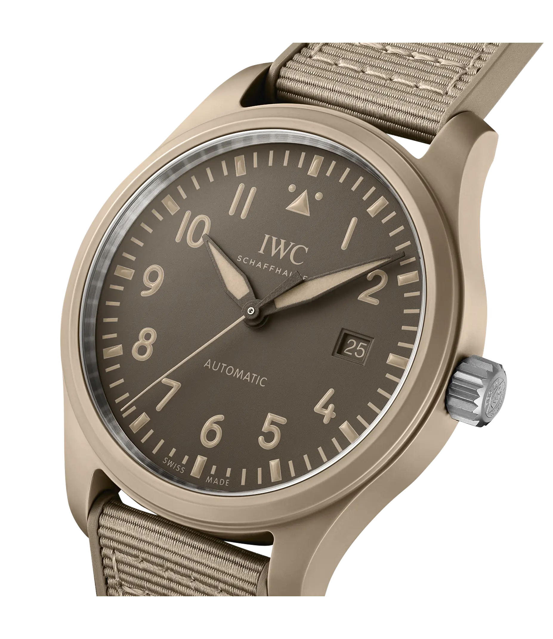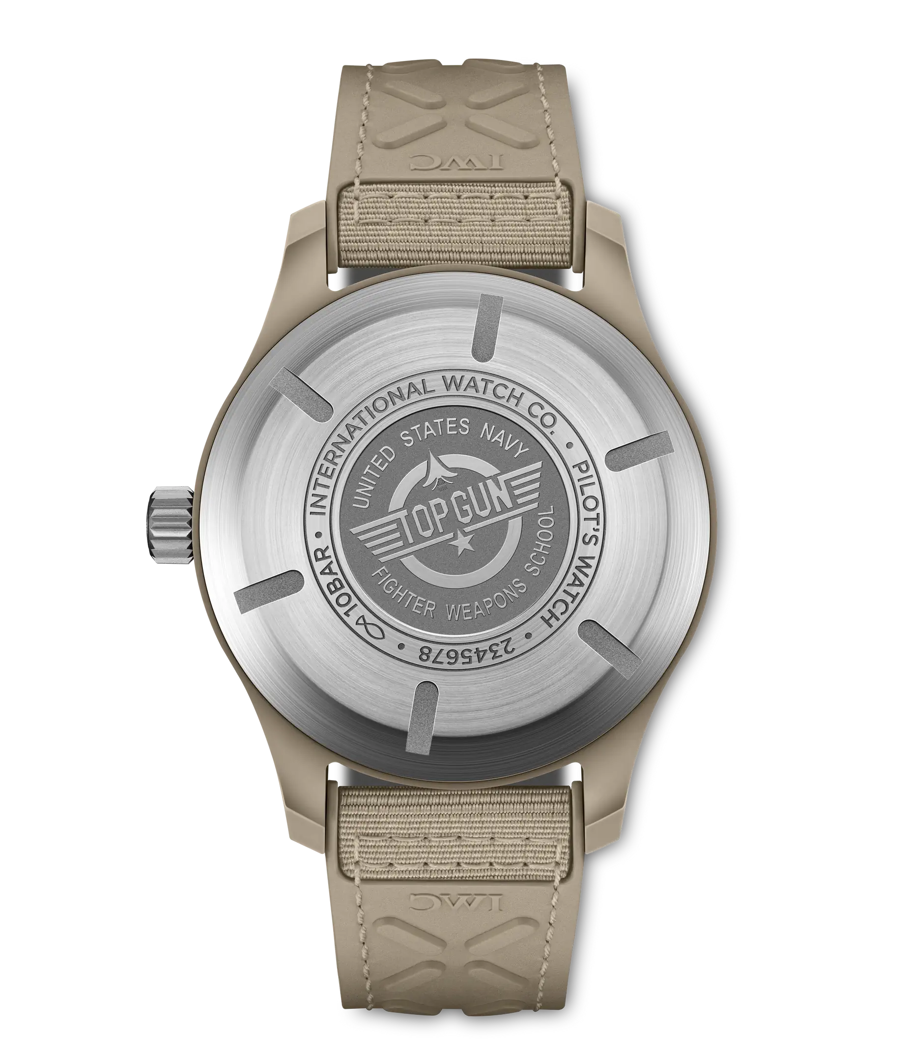 Die Pilot´s Watch Automatic 41 Top Gun Mojave Desert verfügt über ein sorgfältig gefertigtes 41mm-Gehäuse aus sandfarbener Keramik. Die Keramikfarbe „Mojave Desert“ ist von den Fluganzügen der Navy-Piloten und der Wüstenlandschaft rund um die Naval Air Weapons Station China Lake inspiriert, wo einige der erfahrensten Piloten der Navy stationiert sind. Technische Keramik durchläuft einen komplexen und hochentwickelten Herstellungsprozess. Zunächst werden pulverförmige Rohstoffe zu einer Vorform, dem sogenannten „Green Body“, geformt und anschließend maschinell näher an die endgültige Geometrie gebracht. Im nächsten Schritt wird das Gehäuse in einem Brennofen bei hohen Temperaturen gesintert. Durch diesen Wärmeprozess erhält die Keramik ihre einzigartigen Eigenschaften wie extreme Härte und Kratzfestigkeit. Der charakteristische erdige Khaki-Farbton wird durch die Mischung von Zirkonoxid mit anderen Metalloxiden in einem genau definierten Verhältnis erzielt. Das dezente braune Zifferblatt verfügt über eine Minutenskala und Ziffern in einem gedämpften Farbton, die alle mit Super-LumiNova® beschichtet sind, um eine perfekte Ablesbarkeit bei schlechten Lichtverhältnissen zu gewährleisten. Die Pilot´s Watch Automatic 41 Top Gun Mojave Desert wird vom IWC-Manufakturkaliber 32112 angetrieben, einem robusten und präzisen Automatikwerk mit einer Gangreserve von 120 Stunden. Die Uhr ist mit einem beigen Kautschukarmband mit Textileinlage und einer Dornschließe aus Titan ausgestattet. Der Gehäuseboden ist aus Titan gefertigt und mit dem ikonischen „Top Gun“-Logo graviert.