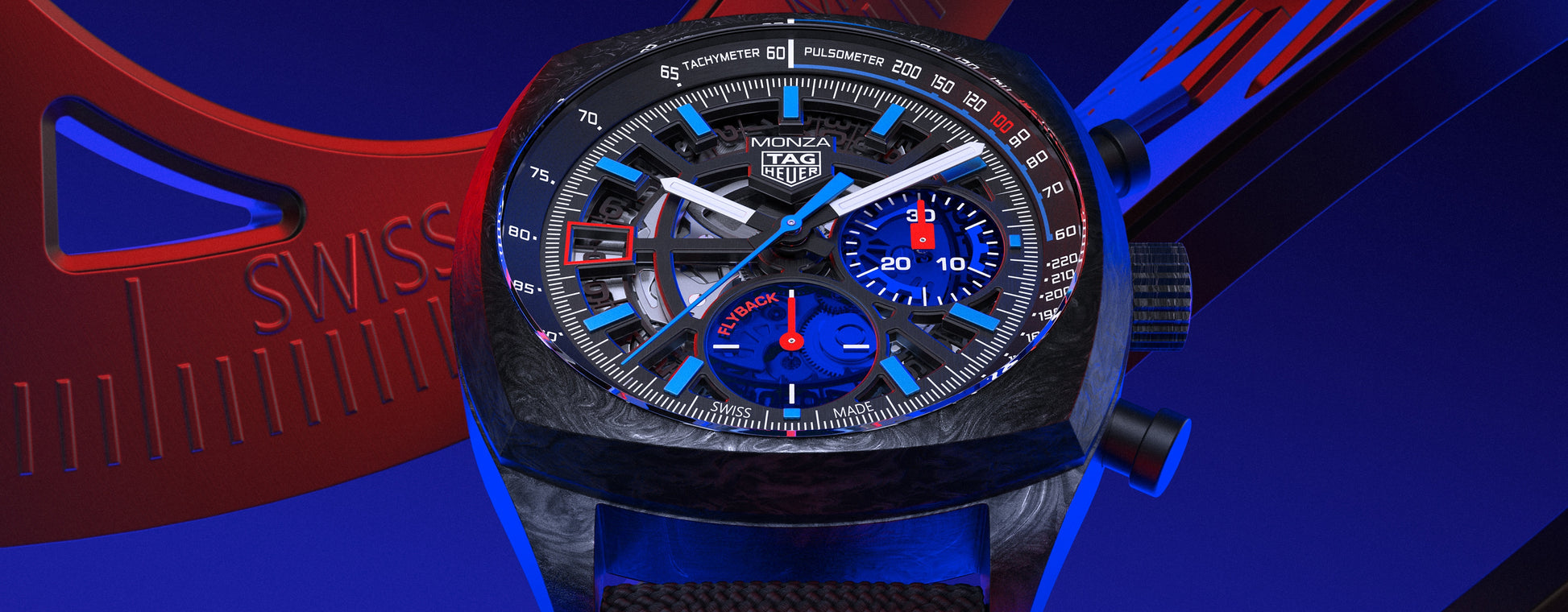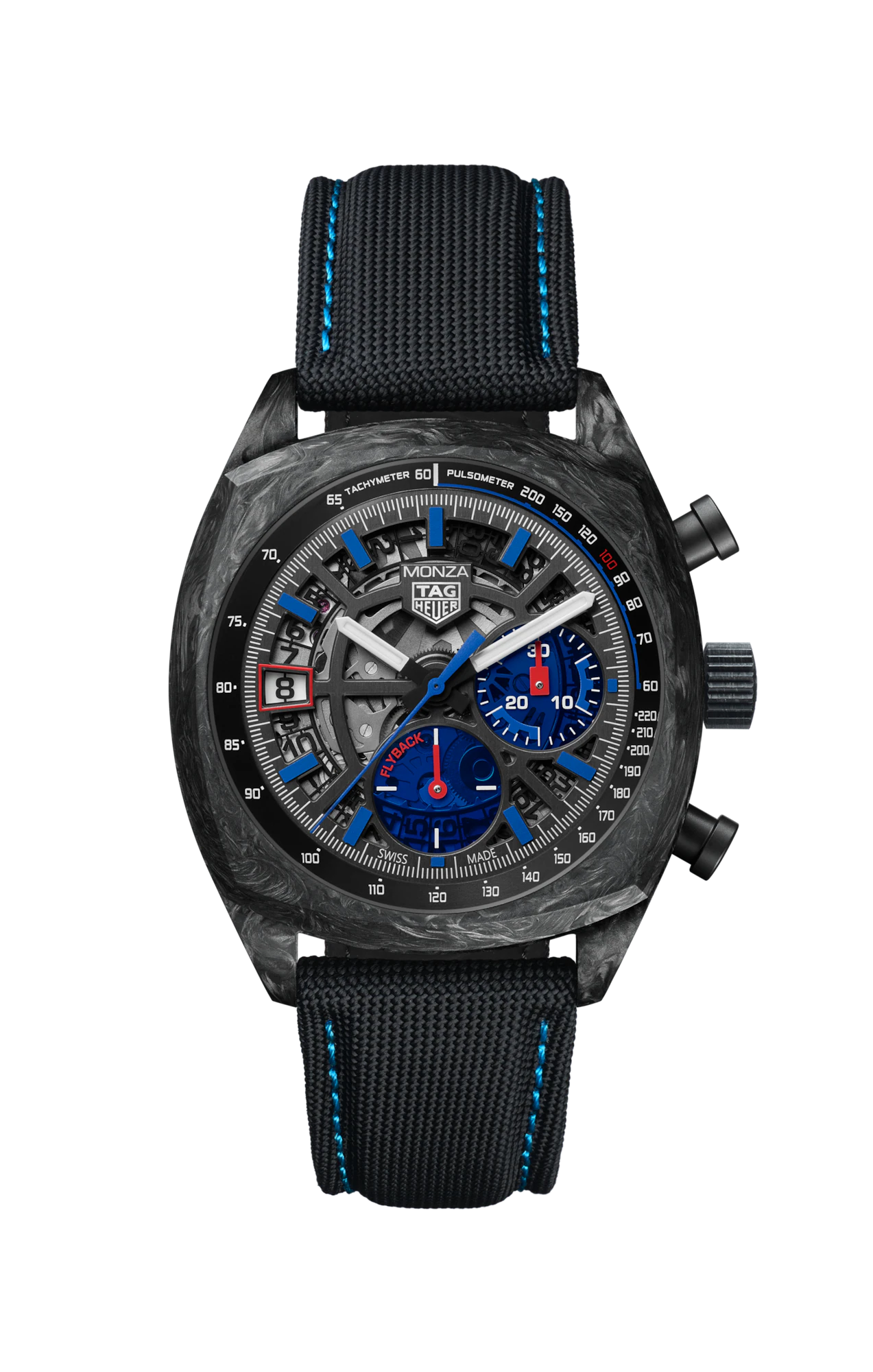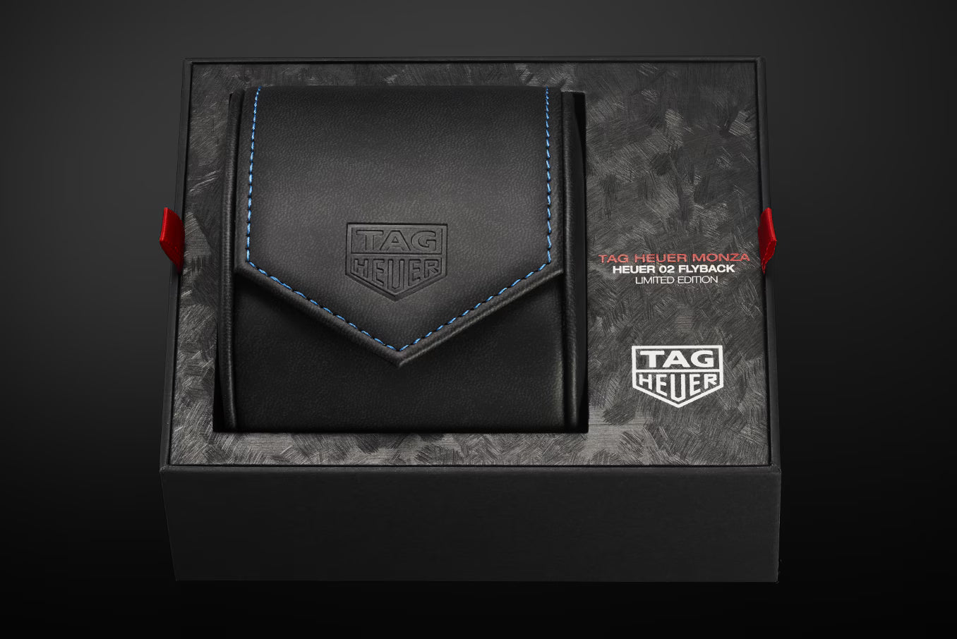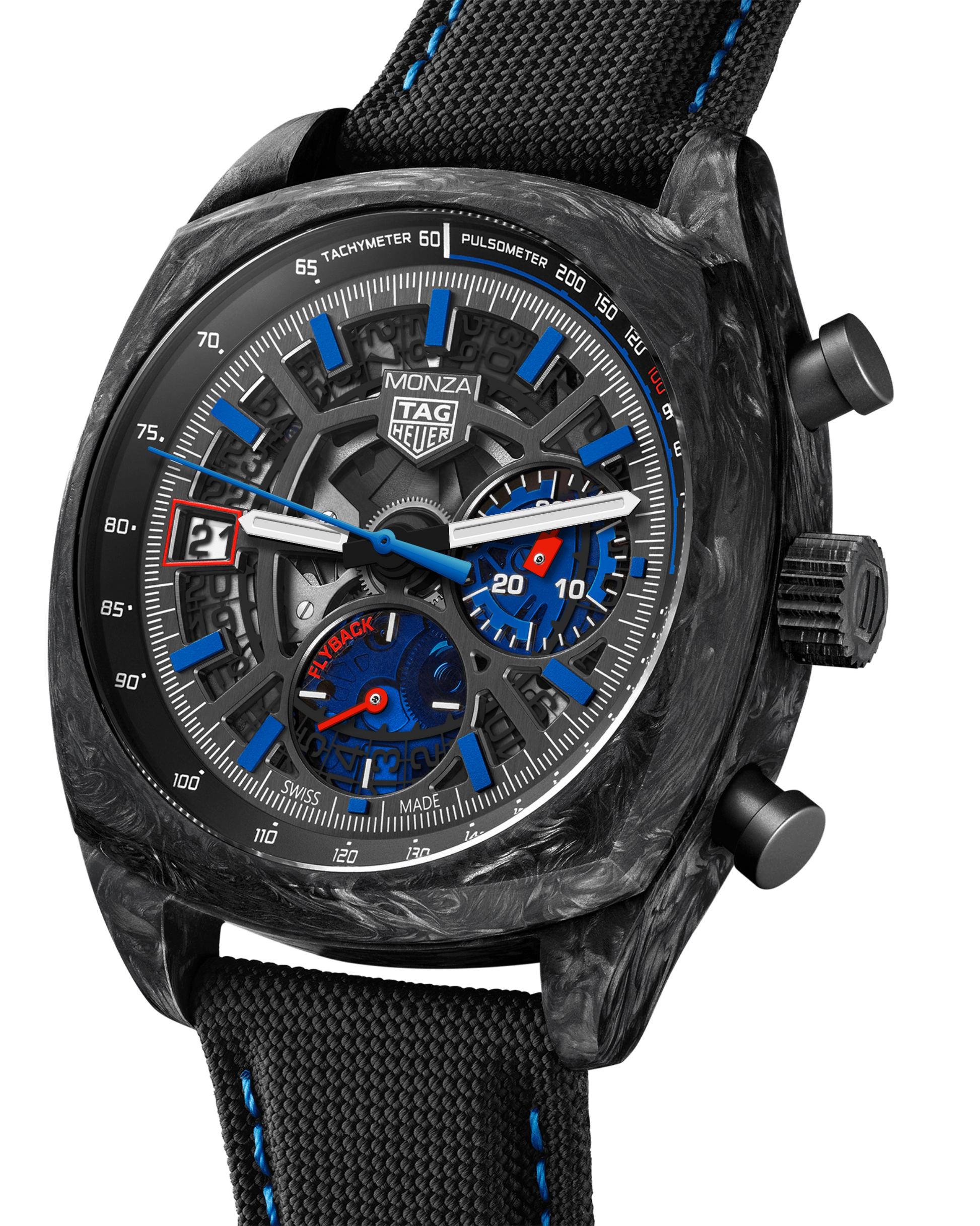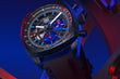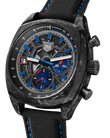 Die Monza ist eine zeitgenössische Hommage an die unauflösliche Verbindung zwischen TAG Heuer und dem Motorsport: Diese auffällige Version aus Carbon im Extremsport-Look verkörpert die Essenz der Maison. Das 42-mm-Gehäuse aus ultraleichtem und widerstandsfähigem Carbon wird von dem Manufakturwerk Calibre TH20-12 Flyback angetrieben, einem Chronographenwerk mit COSC-Zertifizierung. Ein uhrmacherisches Statement. Unter dem gewölbten Saphirglas kommt das skelettierte, kissenförmige schwarze Zifferblatt mit kontrastierenden roten und blauen Akzenten zur Geltung. Es weist durchscheinende blaue Hilfszifferblätter aus Saphirglas bei 3 Uhr und, für die permanente Sekunde, bei 6 Uhr auf. Ein zeitgenössisches Kunstwerk. Angetrieben von dem hochpräzisen, COSC-zertifizierten Calibre TH20-12 Flyback, geht diese vom Motorsport inspirierte Uhr bis an die Grenzen der modernen Zeitmessung. Der bemerkenswerte Vorteil der Flyback-Funktion ist die Möglichkeit, den Chronographen zurückzusetzen, ohne ihn anzuhalten: Das ermöglicht eine schnellere und präzisere Zeitmessung. Die spezielle, blau gefütterte schwarze Box und das dazugehörige Etui erinnern an das sportliche schwarze Textilarmband mit blauer Absteppung. Die für ein Meisterstück gemachte Box im Carbon-Look spiegelt das ultraleichte und widerstandsfähige Carbongehäuse der Uhr wider.