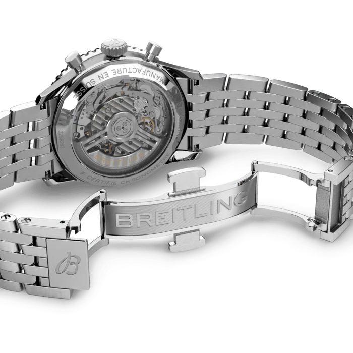 Edelstahl, Edelstahlband mit Doppel-Faltschließe, Automatikwerk Manufakturkaliber Breitling 01, Gangreserve ca. 70 Stunden, Chronograph, Datumsanzeige, Saphirglas, Saphirglas-Sichtboden, Durchmesser 41mm, spritzwassergeschützt, fünf Jahre Garantie