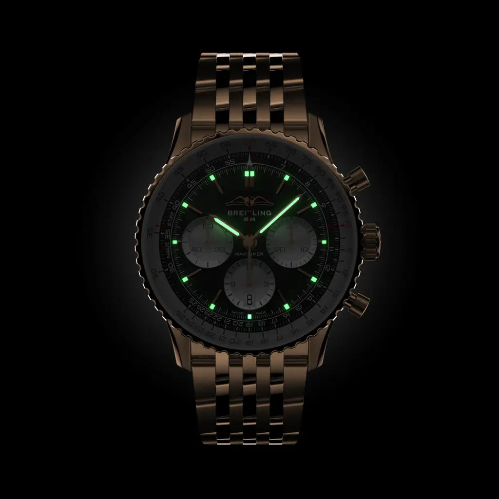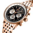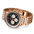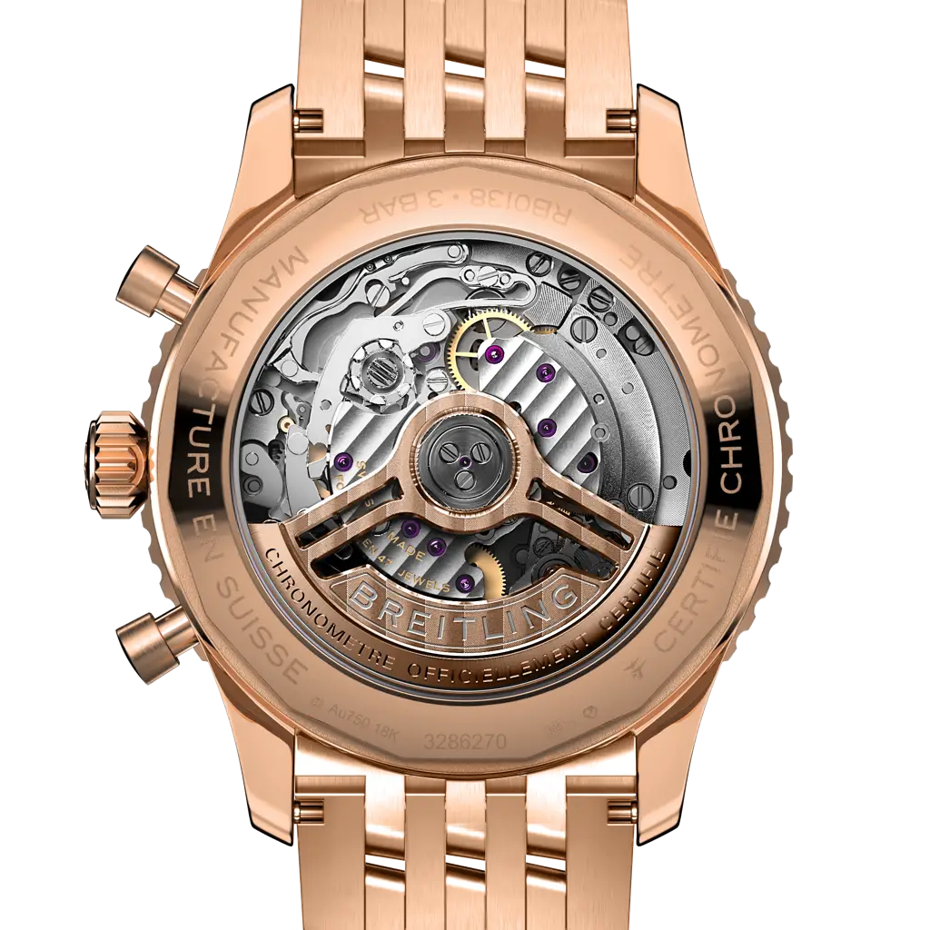 Rotgold 18kt, Rotgoldband 18kt mit Doppel-Faltschließe, Automatikwerk Manufakturkaliber Breitling 01, Gangreserve ca. 70 Stunden, Chronograph, Datumsanzeige, Saphirglas, Saphirglas-Sichtboden, Durchmesser 43mm, spritzwassergeschützt, fünf Jahre Garantie