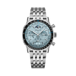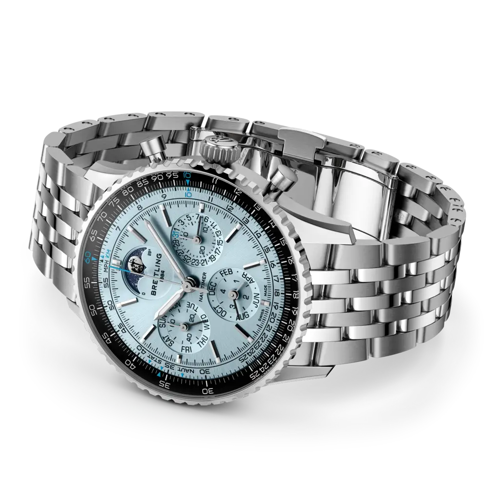Zu unserem 140-jährigen Jubiläum stellen wir das Kaliber B19 vor – das erste exklusive Chronographenwerk mit ewigem Kalender von Breitling. Diese Pionierleistung bildet nun den Antrieb dieser Sonderedition der Navitimer, einer Uhr mit eigener legendärer Geschichte. Die erste Navitimer wurde 1952 für die AOPA (Aircraft Owners and Pilots Association) entwickelt und kombinierte einen Chronographen mit dem von Breitling patentierten kreisförmigen Rechenschieber für präzise Flugberechnungen im Cockpit. Nicht nur Piloten waren von den Funktionen des Flugcomputers begeistert, sondern bald auch Sportler, Musiker und sogar Astronauten. 1962 war sie dann die erste Schweizer Armbanduhr im Weltraum. Diese Edition verbindet die Vergangenheit mit der Zukunft: ein Gehäuse aus Stahl, eine Lünette aus Platin, ein eisblaues Zifferblatt und das eindrucksvolle Kaliber B19 – ein automatischer Chronograph mit ewigem Kalender. Eine Uhr mit Tradition, gemacht für die Gegenwart.