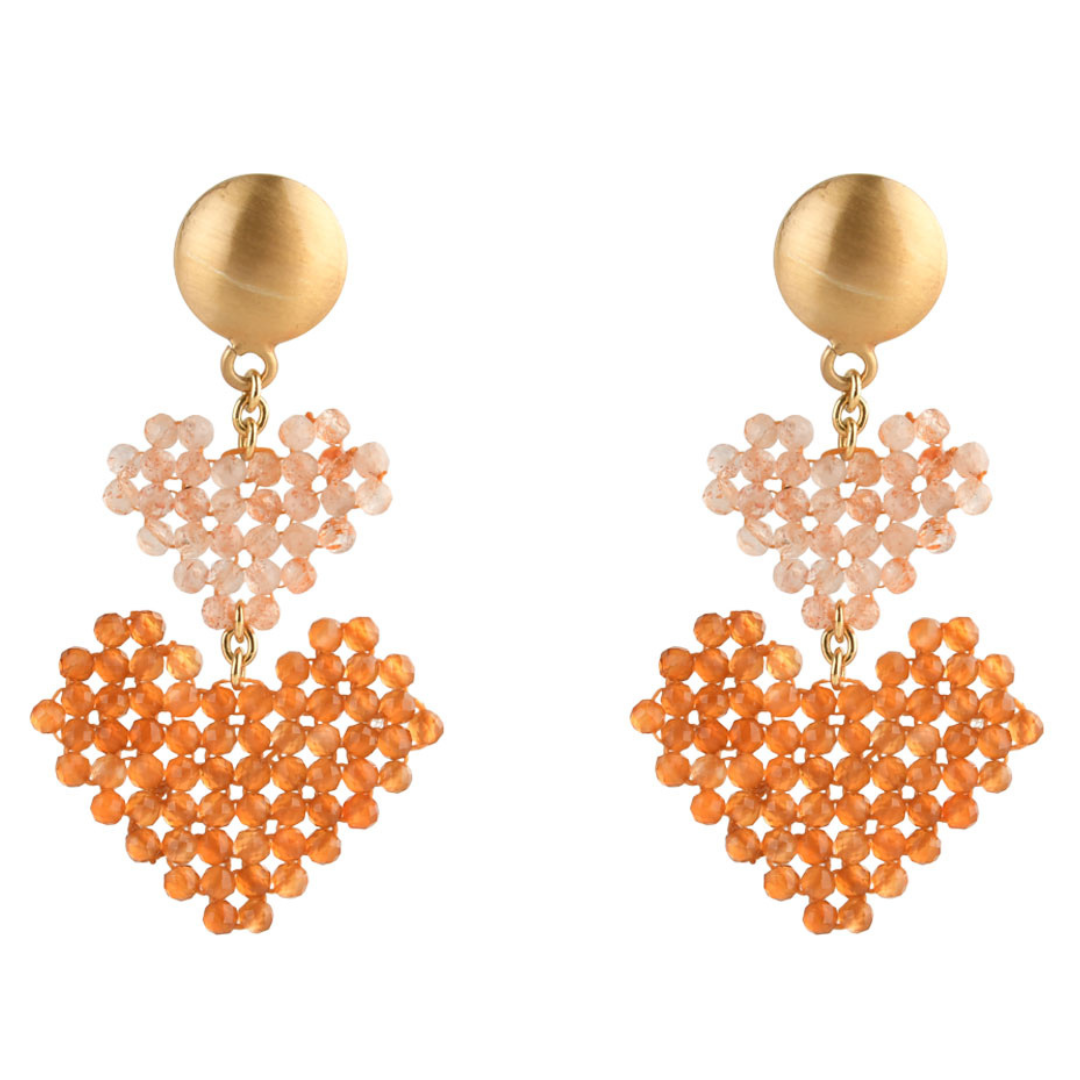 Ohrstecker Silber vergoldet mit Achat rot gef., Sonnenstein in Herzform. Handgefertigt in Österreich.