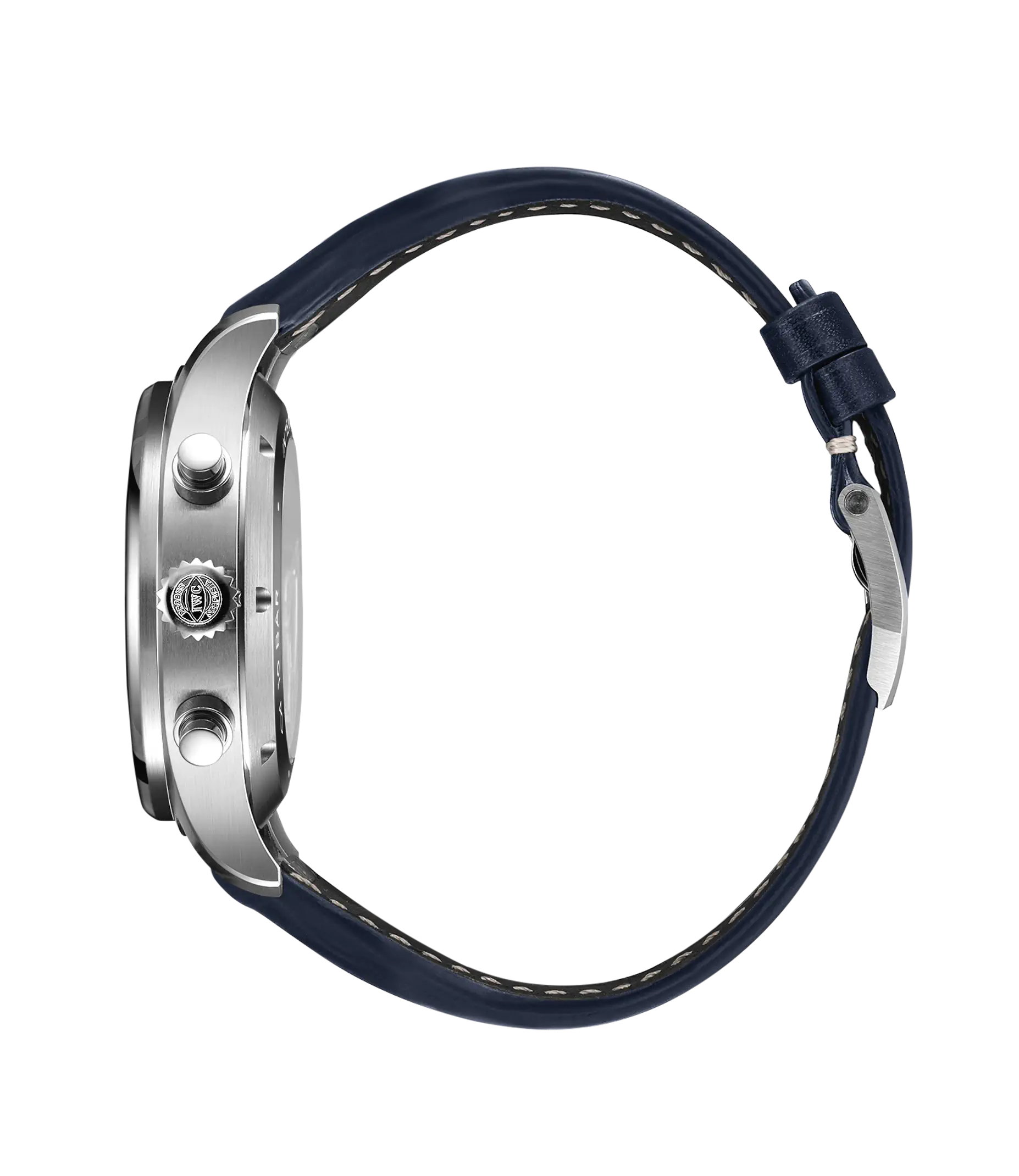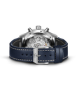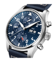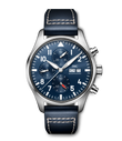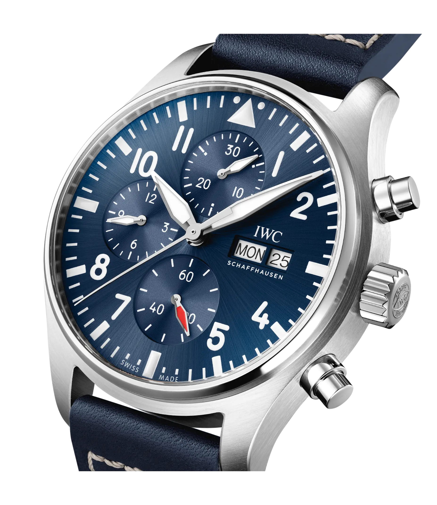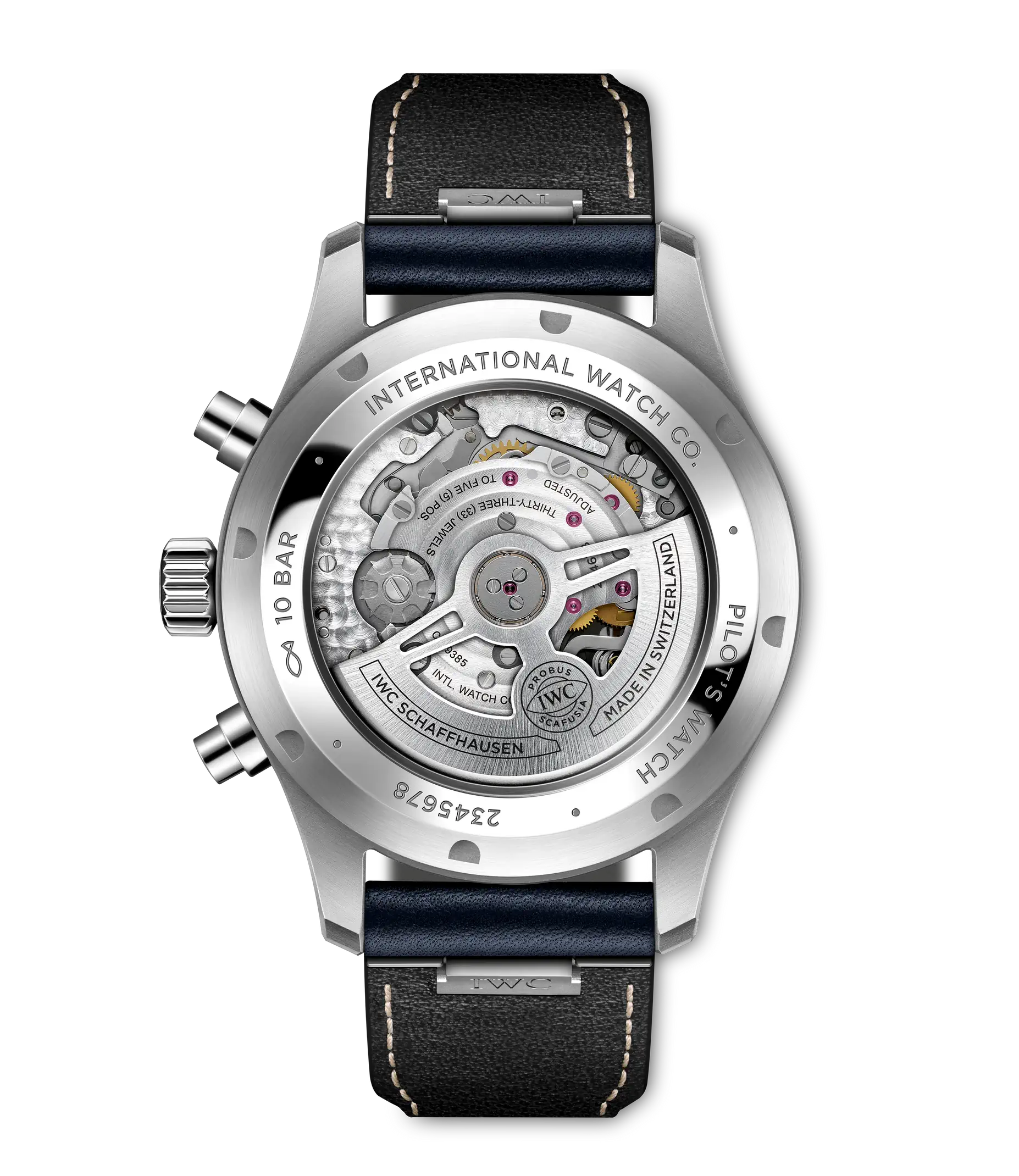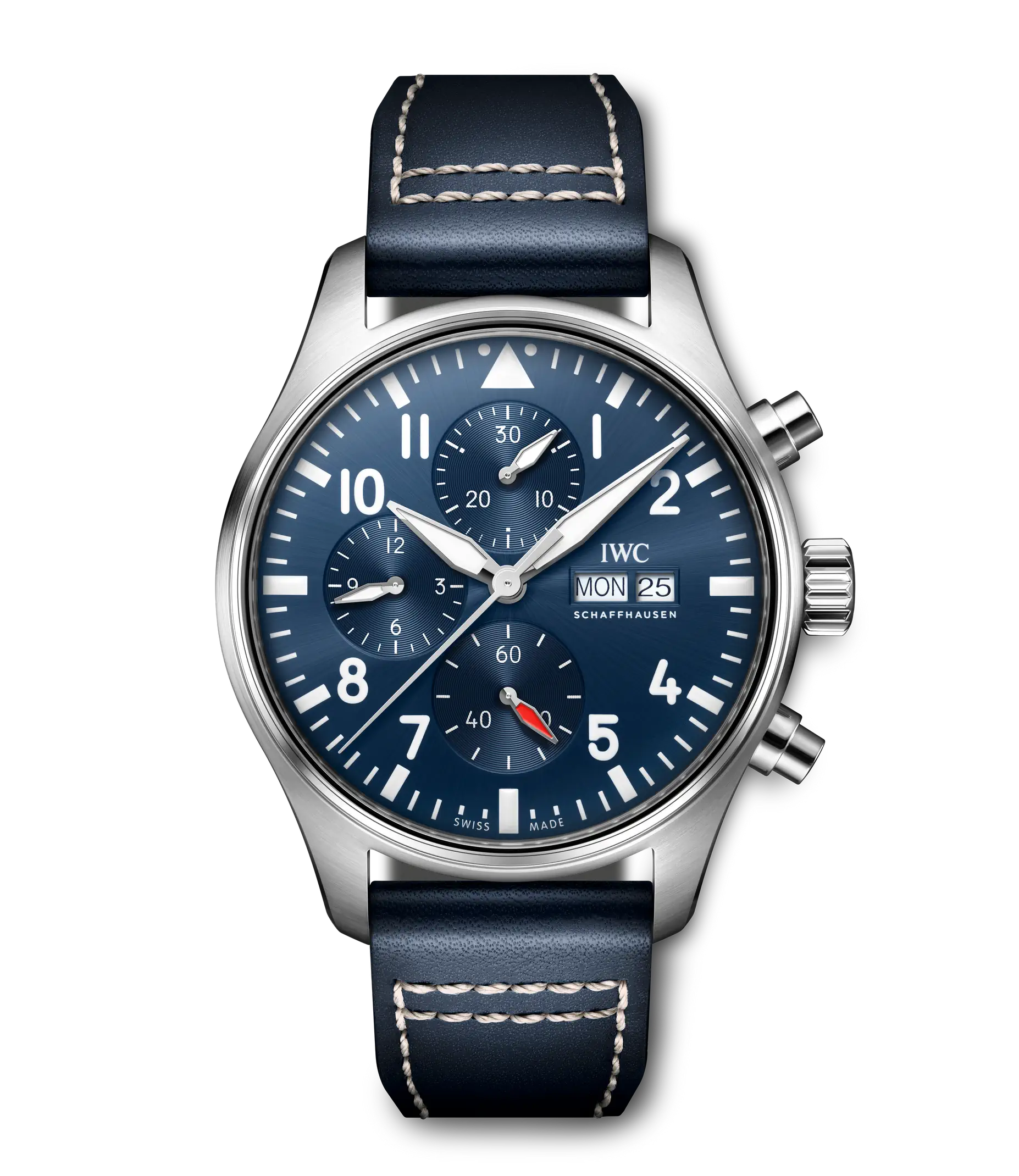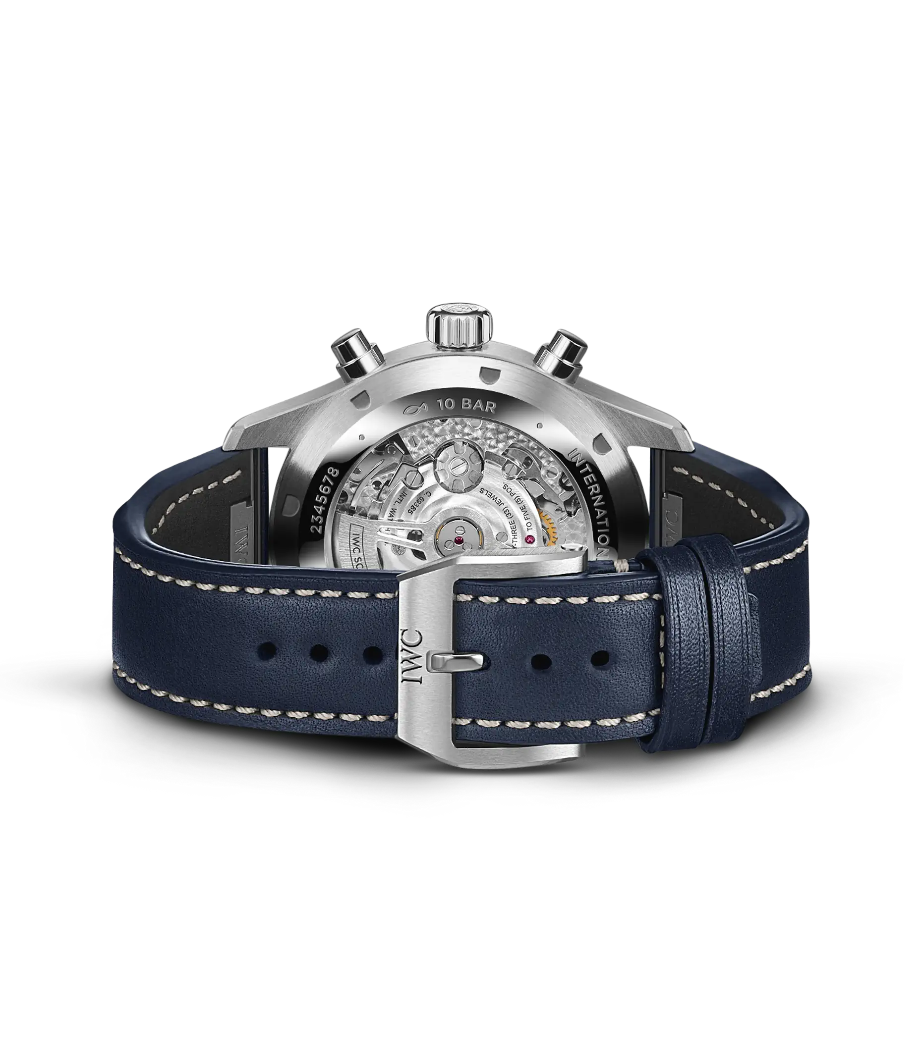 Der Pilot´s Watch Chronograph ist der Inbegriff einer vielseitigen Sportuhr und ein ausgezeichneter Begleiter in allen Lebenslagen. Chronographen bilden seit 1994 einen integralen Bestandteil der Pilot´s-Watch-Kollektion von IWC Schaffhausen. Dieser Pilot´s Watch Chronograph verfügt über ein Gehäuse aus Edelstahl mit einem Durchmesser von 43mm, ein blaues Zifferblatt sowie rhodinierte Zeiger. Das kontrastreiche Zifferblatt mit den großen arabischen Zahlen und dem Markierungsdreieck bei 12 Uhr ist im Stil eines einfach ablesbaren Cockpit-Instruments gestaltet. Dank Leuchtelementen lässt sich die Zeit auch in der Nacht oder bei schwierigen Sichtverhältnissen auf einen Blick ablesen. Das IWC-Manufakturkaliber 69385, ein präzises und robustes Chronographenwerk in klassischer Kolonnenradbauweise, ermöglicht die Messung von Stopp- oder Additionszeiten bis zu 12 Stunden. Die gemessenen Stunden werden auf dem Zähler bei 9 Uhr und die Minuten bei 12 Uhr angezeigt, während sich die kleine Sekunde mit einem roten Zeiger bei 6 Uhr befindet. Das dekorierte Uhrwerk mit Automatikaufzug und einer Gangreserve von 46 Stunden ist durch den Saphirglasboden sichtbar. Der bis 10 bar wasserdichte Chronograph wird an einem blauen Armband aus Kalbsleder mit Dornschliesse getragen. Dank des integrierten EasX-CHANGE® Systems lässt sich das Armband einfach und ohne zusätzliches Werkzeug wechseln.