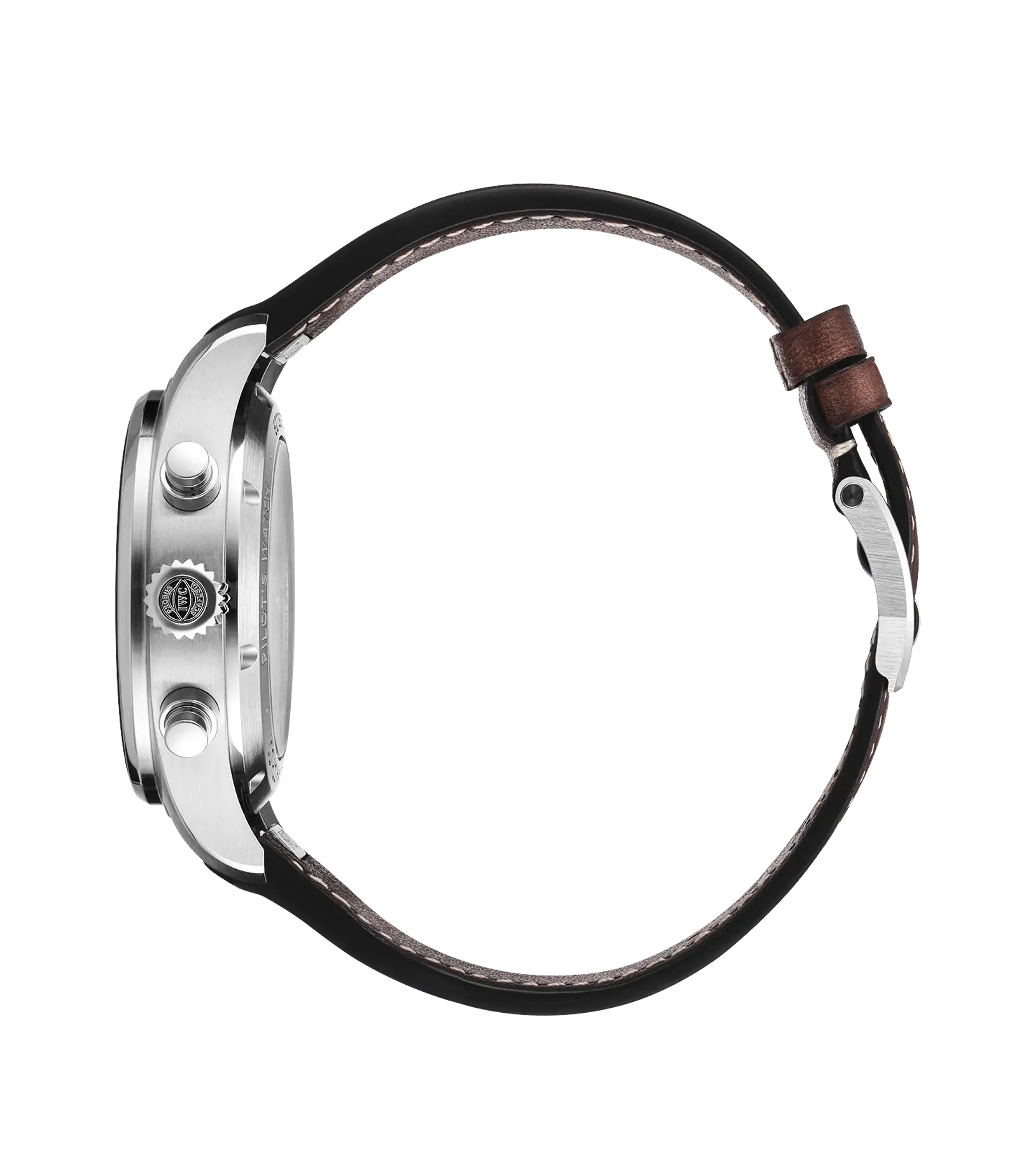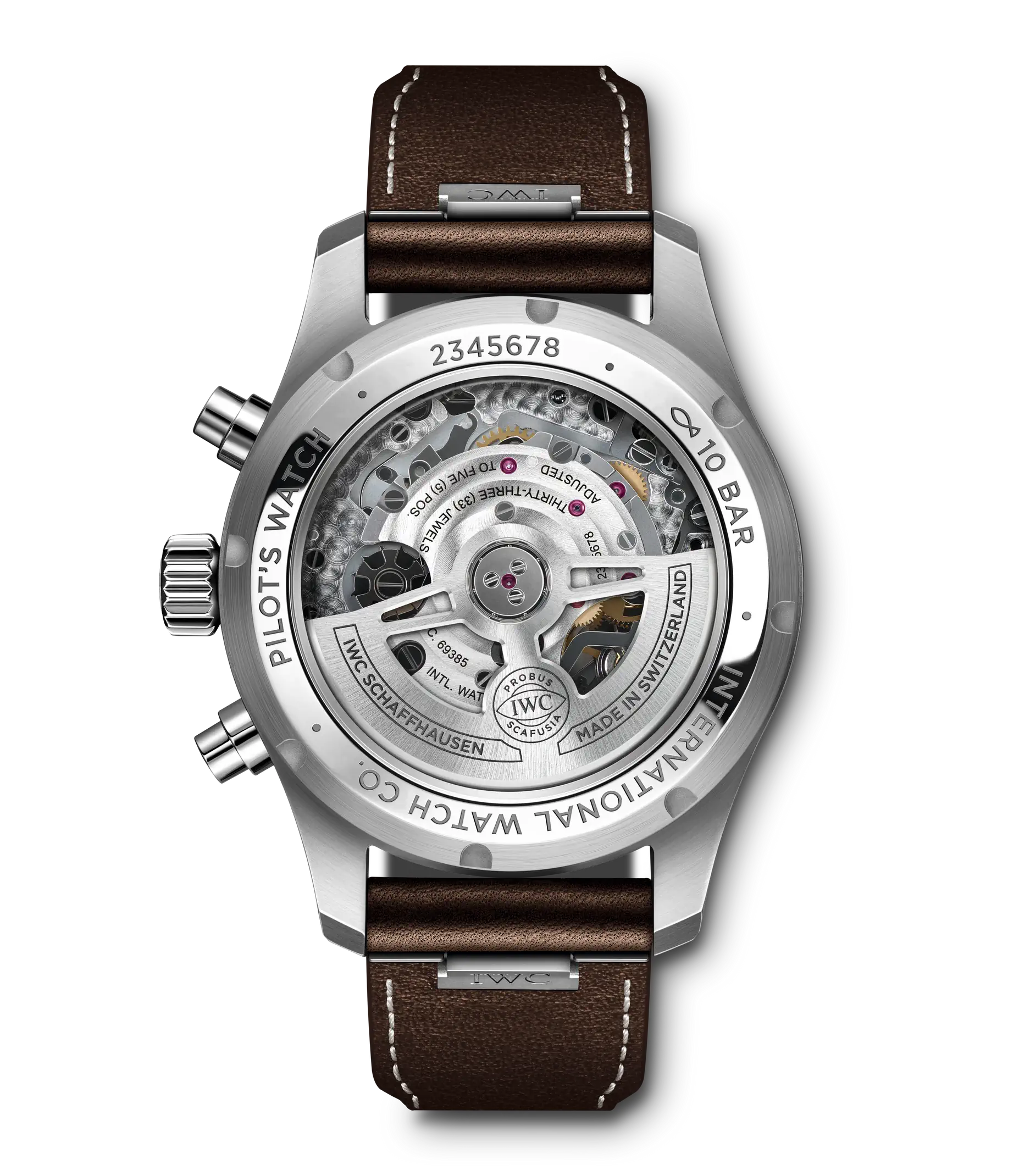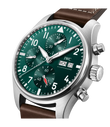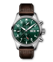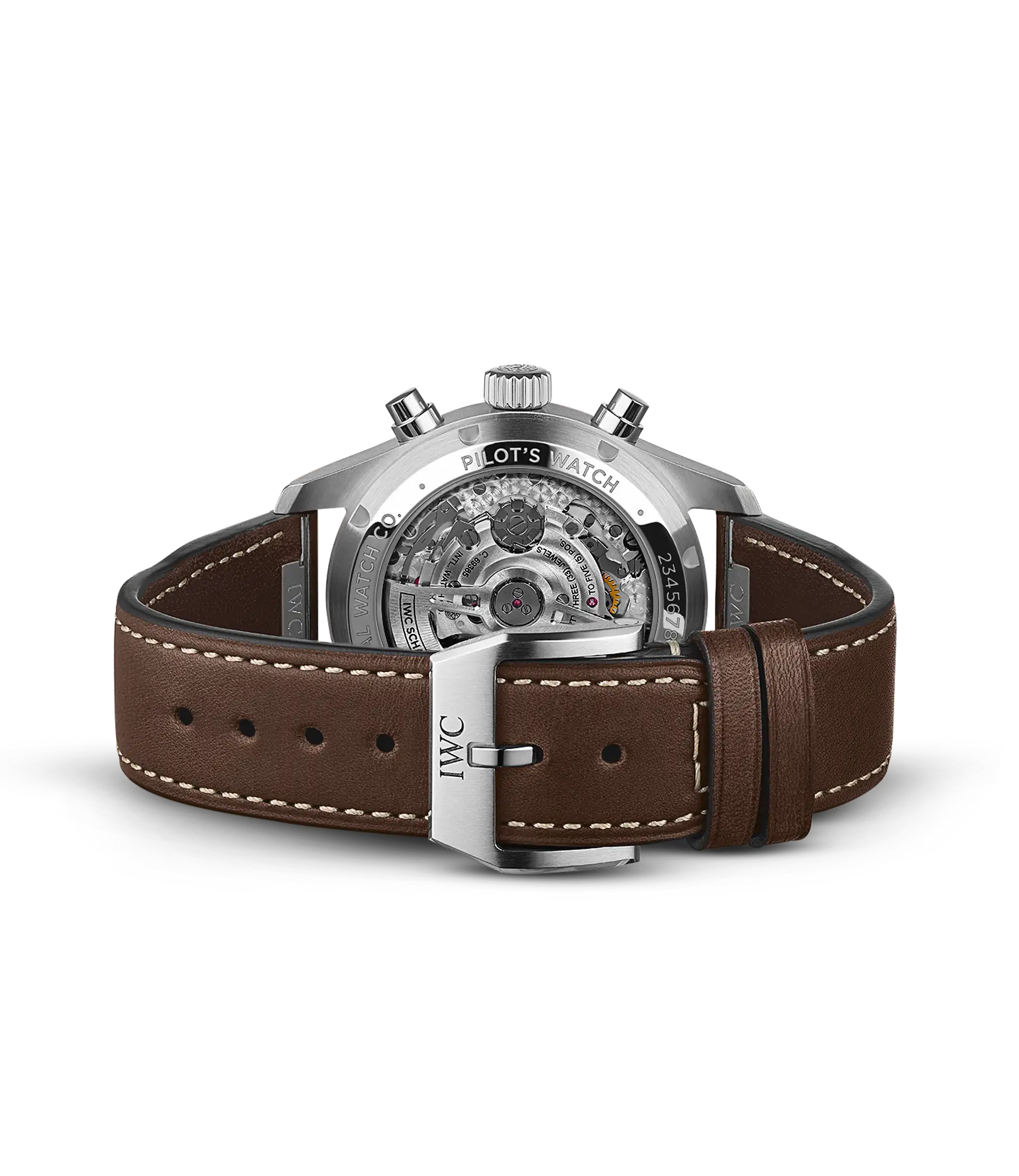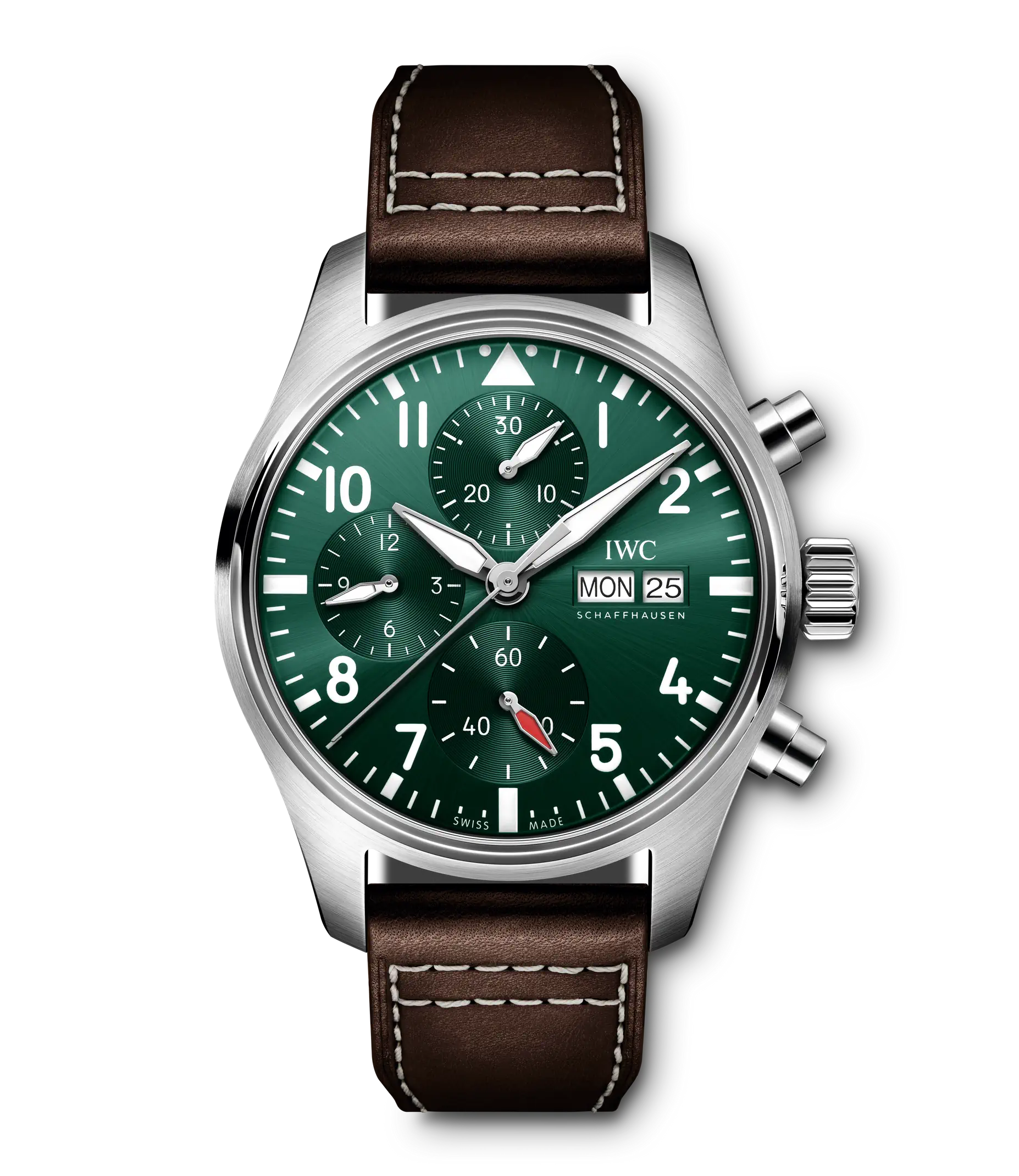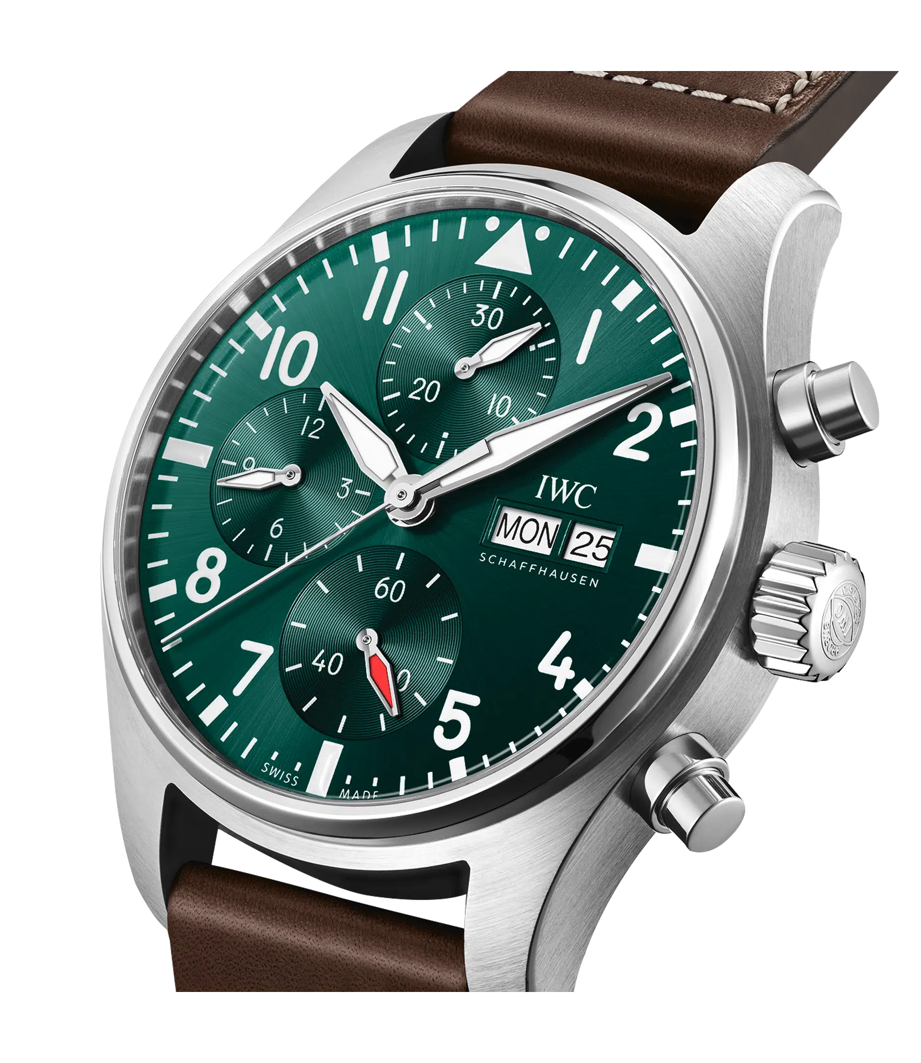 Die Pilot´s Watch Chronograph 41 überzeugt mit Vielseitigkeit und einem sportlichen Design. Seit 1994 sind Chronographen eine tragende Säule der Fliegeruhren-Kollektion von IWC. Das Zifferblatt mit den verschiedenen Zählern unterstreicht nicht nur das typische Instrumenten-Design. Die mechanische Stoppuhr bietet auch nahezu unbegrenzte Anwendungsmöglichkeiten im Alltag. Die Pilot´s Watch Chronograph 41 in einem ergonomischen Durchmesser von 41mm wird vom IWC-Manufakturkaliber 69385 angetrieben. Das robuste und präzise Chronographenwerk mit Kolonnenrad ist durch den Saphirglasboden sichtbar. Dieses Modell verfügt über ein Edelstahlgehäuse, ein grünes Zifferblatt, rhodinierte Zeiger und ein dunkelbraunes Kalbslederband. Das integrierte EasX-CHANGE System ermöglicht es, das Armband im Handumdrehen zu wechseln. Erhältlich sind Armbänder aus Kalbsleder oder Kautschuk in verschiedenen Farben, aber auch ein hochwertiges Edelstahlarmband mit Feineinstellverschluss. In Kombination mit dem bis 10 bar wasserdichten Gehäuse macht diese Vielseitigkeit den Chronographen zum perfekten Begleiter für jedes Abenteuer – nicht nur im Cockpit.
