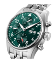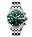 Die Pilot´s Watch Chronograph 41 überzeugt mit Vielseitigkeit und einem sportlichen Design. Seit 1994 sind Chronographen eine tragende Säule der Fliegeruhren-Kollektion von IWC. Das Zifferblatt mit den verschiedenen Zählern unterstreicht nicht nur das typische Instrumenten-Design. Die mechanische Stoppuhr bietet auch nahezu unbegrenzte Anwendungsmöglichkeiten im Alltag. Die Pilot´s Watch Chronograph 41 in einem ergonomischen Durchmesser von 41mm wird vom IWC-Manufakturkaliber 69385 angetrieben. Das robuste und präzise Chronographenwerk mit Kolonnenrad ist durch den Saphirglasboden sichtbar. Dieses Modell verfügt über ein Edelstahlgehäuse, ein grünes Zifferblatt, rhodinierte Zeiger und ein Edelstahlband. Das integrierte EasX-CHANGE System ermöglicht es, das Armband im Handumdrehen zu wechseln. Erhältlich sind Armbänder aus Kalbsleder oder Kautschuk in verschiedenen Farben, aber auch ein hochwertiges Edelstahlarmband mit Feineinstellverschluss. In Kombination mit dem bis 10 bar wasserdichten Gehäuse macht diese Vielseitigkeit den Chronographen zum perfekten Begleiter für jedes Abenteuer – nicht nur im Cockpit.