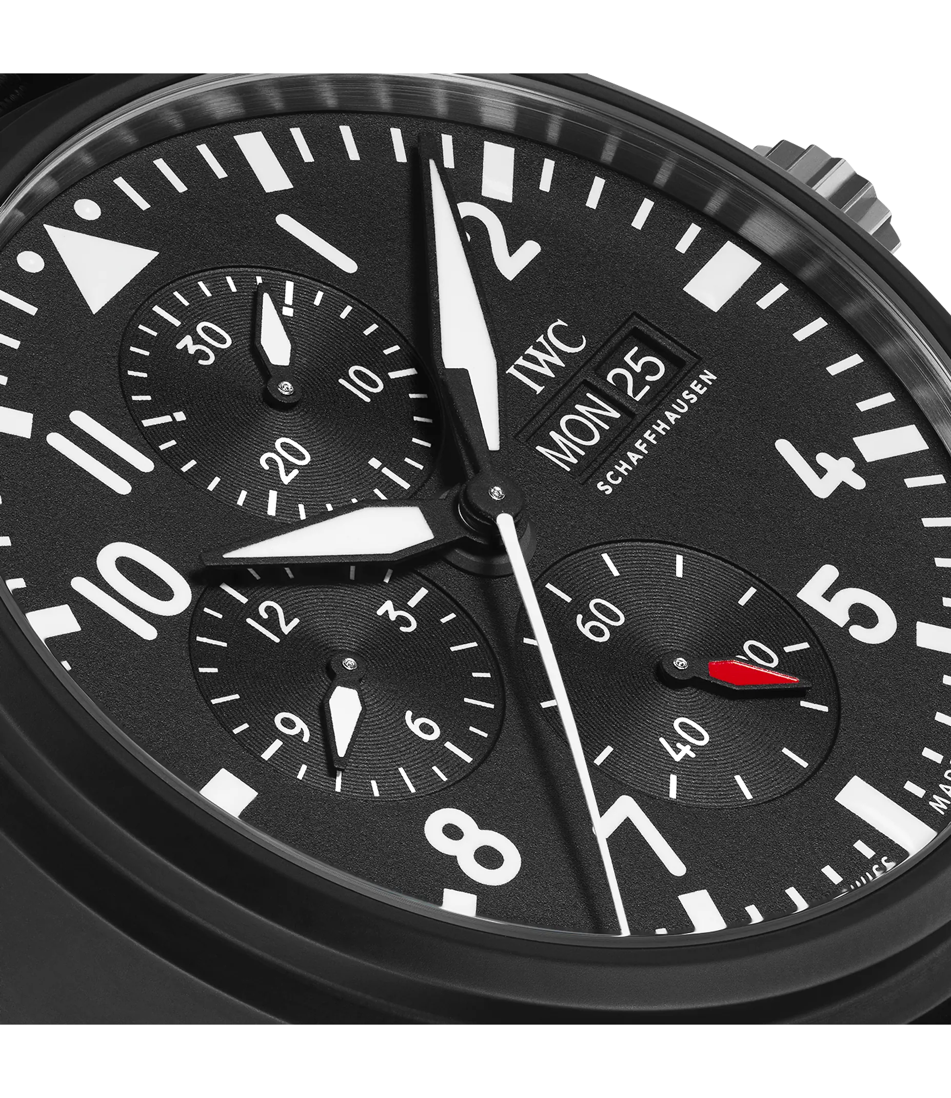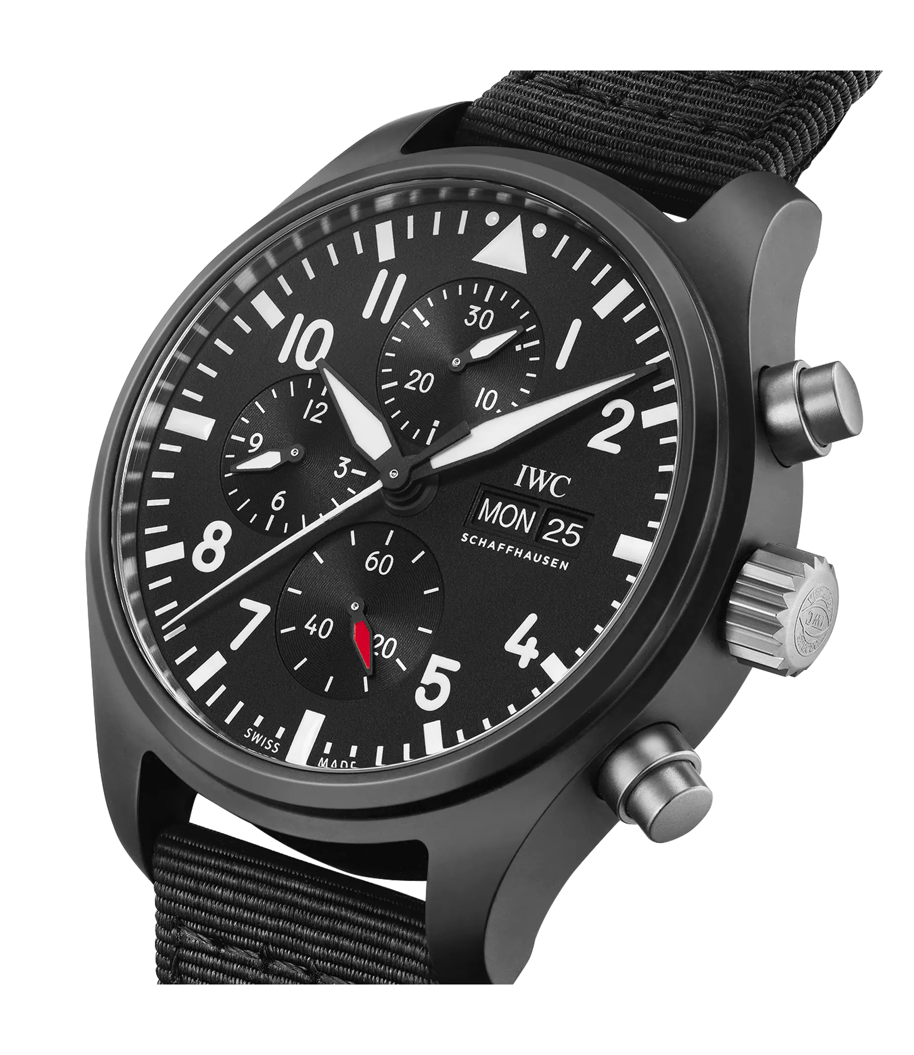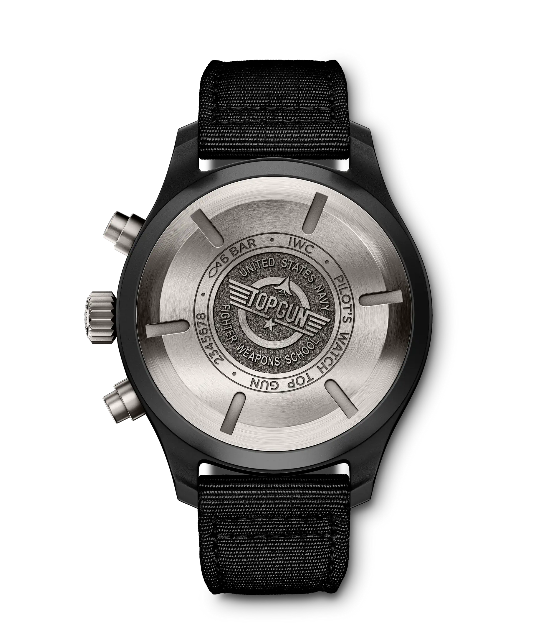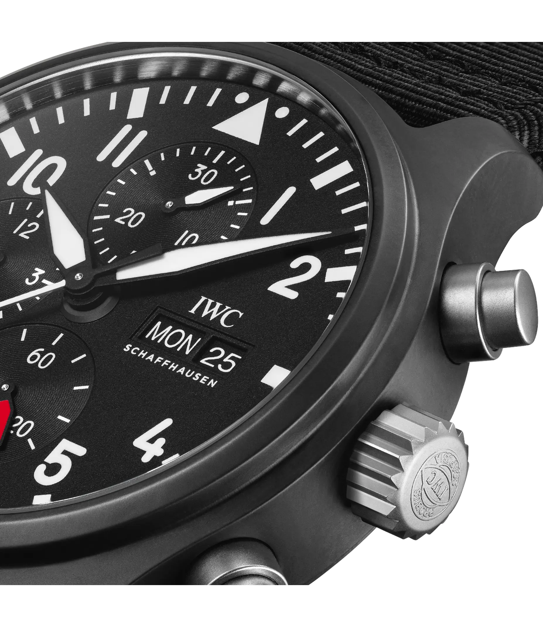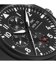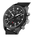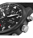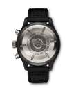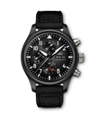 Die Pilot´s Watch Chronograph Top Gun wurde mit robusten und korrosionsbeständigen Materialien wie Keramik und Titan speziell für die Elite der Jet-Piloten der US Navy entwickelt. Zum ersten Mal stattet IWC den Klassiker jetzt mit einem Manufakturwerk aus der Kaliberfamilie 69000 aus. Das IWC-Manufakturkaliber 69380 verfügt neben der Stoppfunktion auch über eine Anzeige für den Wochentag und das Datum. Für einen Farbakzent auf dem schwarzen Zifferblatt sorgt der rote Zeiger der kleinen Sekunde bei "6 Uhr". Das Gehäuse ist aus nicht reflektierender, schwarzer Zirkonoxid-Keramik gefertigt, der Gehäuseboden aus Titan. Die Uhr wird von einem schwarzen Textilband am Arm gehalten.