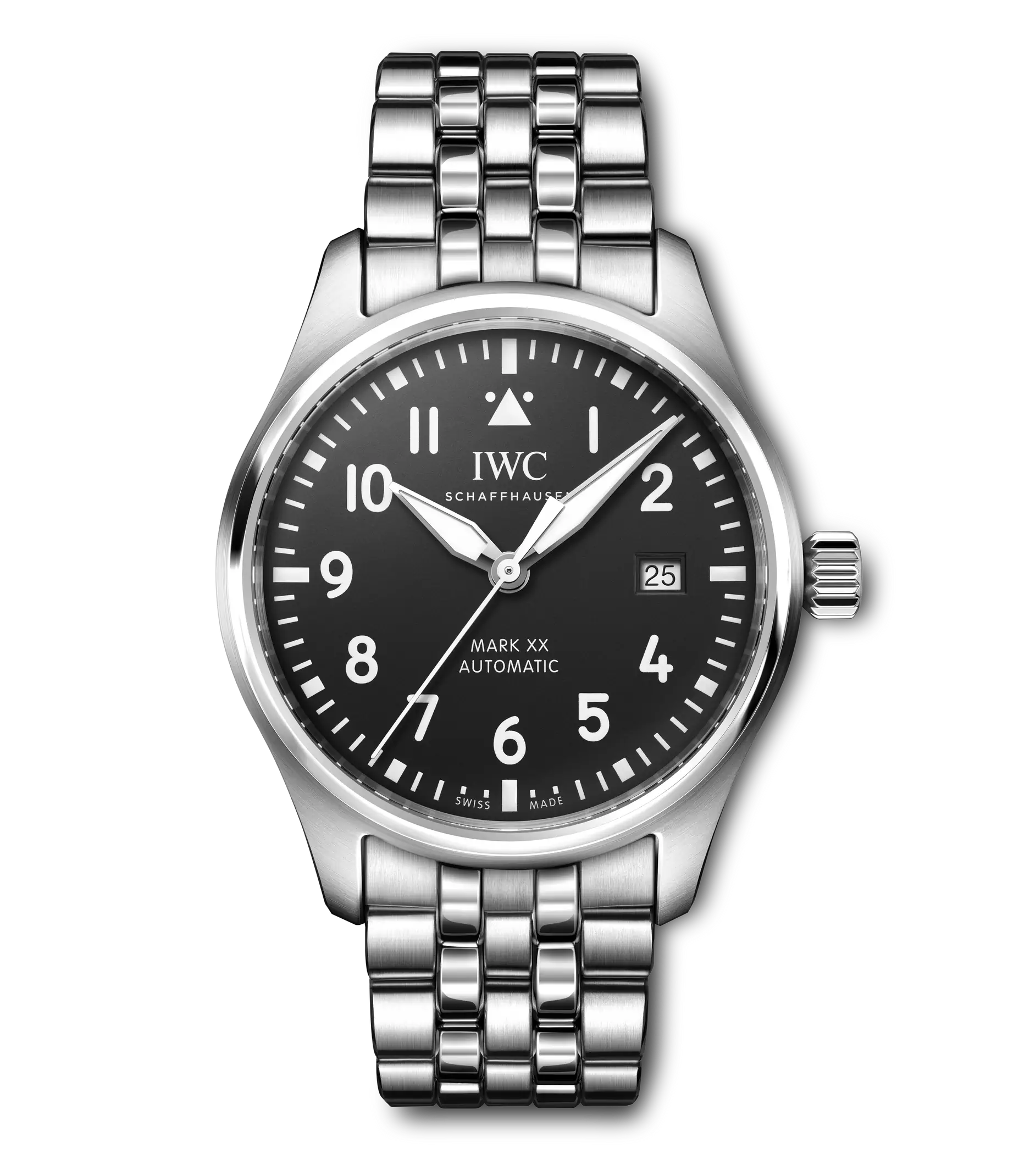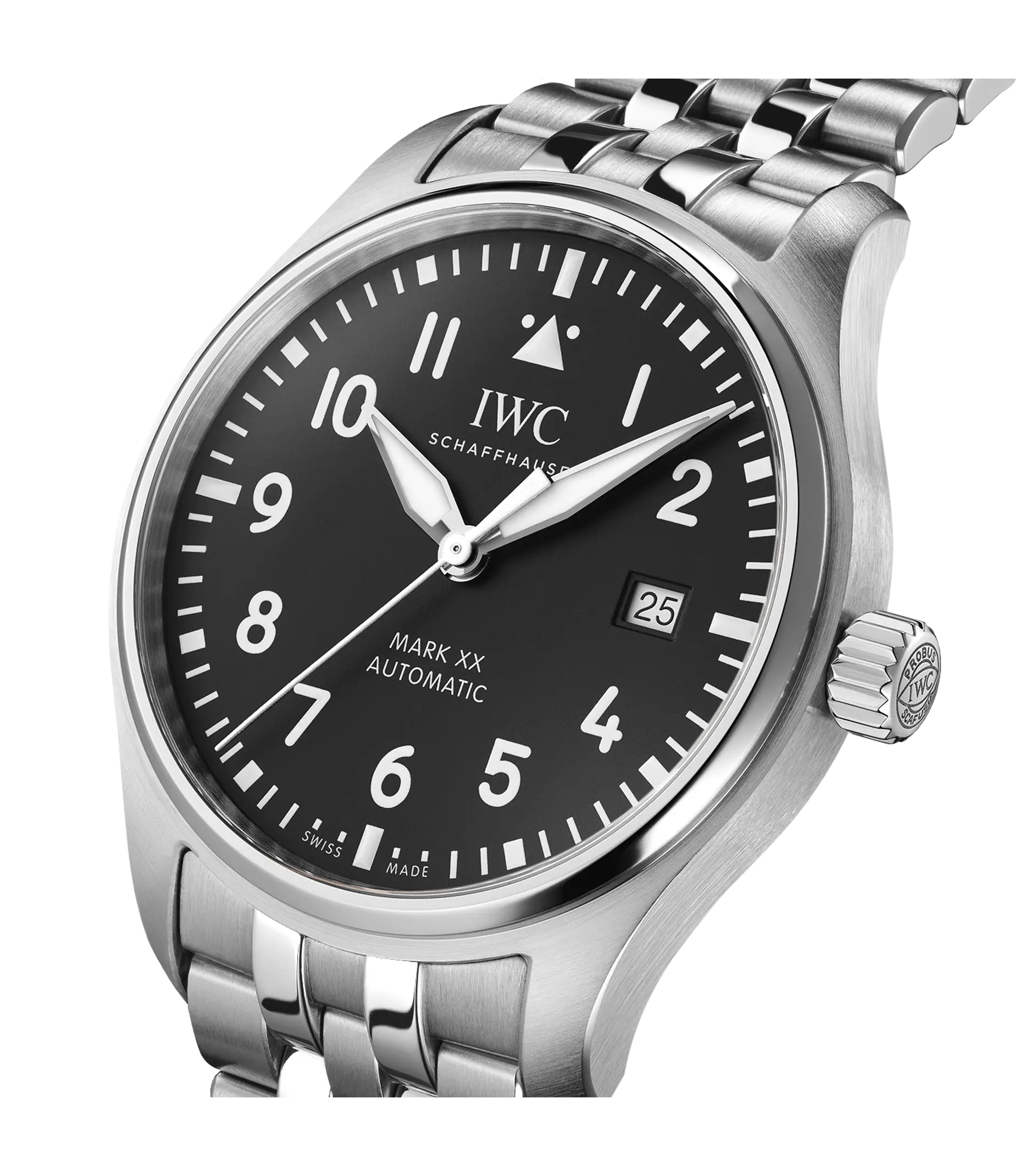 Die Pilot´s Watch Mark XX besticht mit ihrem utilitaristischen Tool-Watch-Design und dem IWC-Manufakturkaliber 32111. Weniger ist mehr: Die Mark XX reduziert das Design und die technische Funktionalität einer Fliegeruhr auf die pure Essenz. Sie ist die Nachfolgerin der legendären Mark 11, einer präzisen amagnetischen Instrumentenuhr, die IWC im Jahr 1948 für die Navigatoren und Piloten der British Royal Air Force entwickelt hat. Diese Variante verfügt über ein robustes und korrosionsbeständiges Gehäuse aus Edelstahl in einem Durchmesser von 40mm, ein schwarzes Zifferblatt sowie rhodinierte Zeiger. Das kontrastreiche Zifferblatt mit weißen Zahlen und Indizes, dem Markierungsdreieck bei 12 Uhr und Leuchtelementen ist bei allen Lichtverhältnissen einfach ablesbar. Für Präzision sorgt das IWC-Manufakturkaliber 32111 mit Automatikaufzug und einer Gangreserve von 120 Stunden. Das Saphirglas ist speziell gesichert, damit es sich bei einem plötzlichen Druckabfall nicht von seinem Platz lösen kann. Die Pilot´s Watch Mark XX ist bis 10 bar wasserdicht und wird an einem Edelstahlband getragen. Dank des integrierten EasX-CHANGE® Systems lässt sich das Armband einfach und ohne zusätzliches Werkzeug gegen ein anderes wechseln.