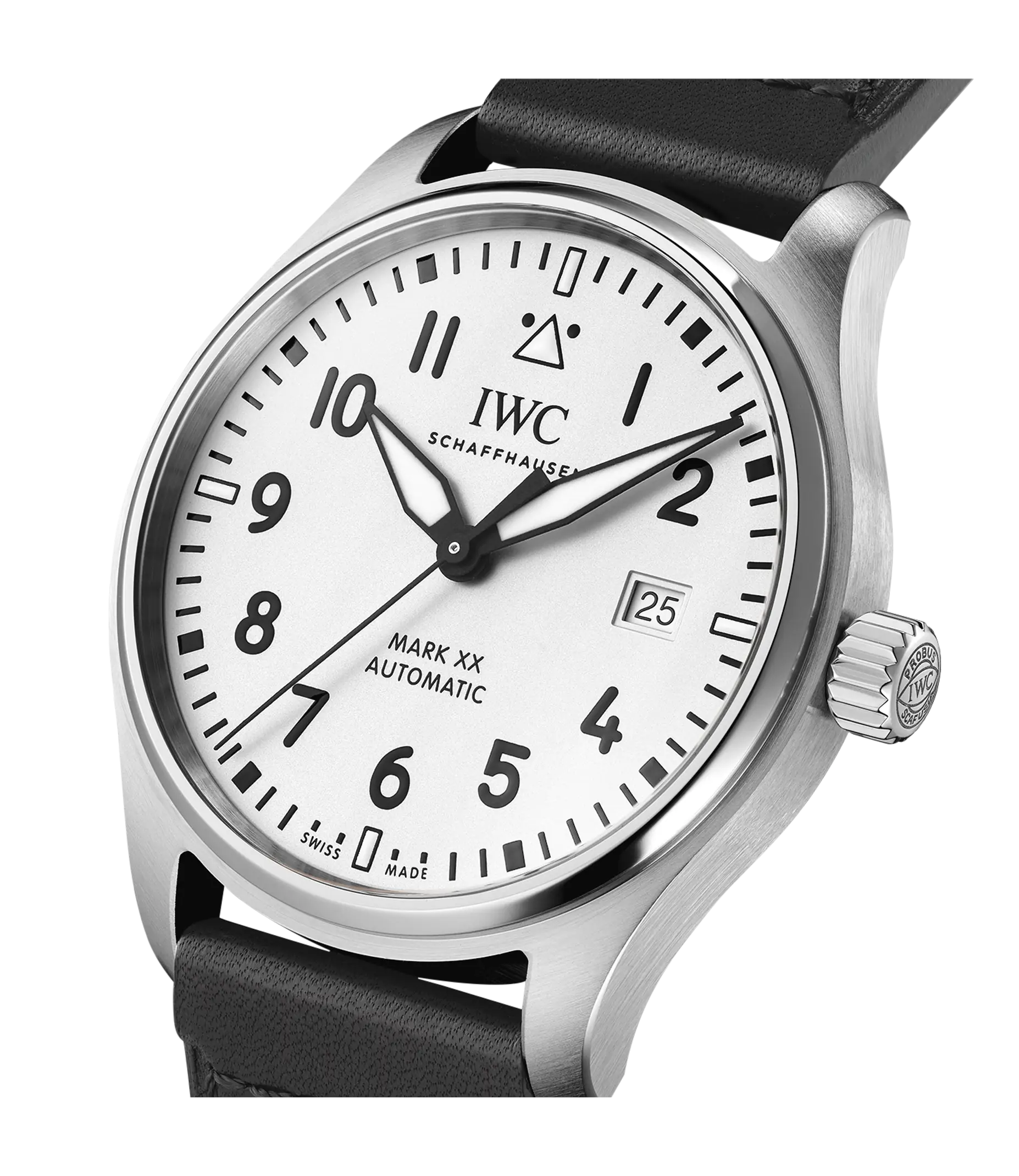 Die Pilot´s Watch Mark XX besticht mit ihrem utilitaristischen Tool-Watch-Design und dem IWC-Manufakturkaliber 32111. Weniger ist mehr: Die Mark XX reduziert das Design und die technische Funktionalität einer Fliegeruhr auf die pure Essenz. Sie ist die Nachfolgerin der legendären Mark 11, einer präzisen amagnetischen Instrumentenuhr, die IWC im Jahr 1948 für die Navigatoren und Piloten der British Royal Air Force entwickelt hat. Diese Variante verfügt über ein robustes und korrosionsbeständiges Gehäuse aus Edelstahl in einem Durchmesser von 40mm, ein argentéfarbenes Zifferblatt sowie schwarze Zeiger. Das kontrastreiche Zifferblatt mit schwarzen Zahlen und Indizes, dem Markierungsdreieck bei 12 Uhr und Leuchtelementen ist bei allen Lichtverhältnissen einfach ablesbar. Für Präzision sorgt das IWC-Manufakturkaliber 32111 mit Automatikaufzug und einer Gangreserve von 120 Stunden. Das Saphirglas ist speziell gesichert, damit es sich bei einem plötzlichen Druckabfall nicht von seinem Platz lösen kann. Die Pilot´s Watch Mark XX ist bis 10 bar wasserdicht und wird an einem schwarzen Armband aus Kalbsleder mit Dornschließe getragen. Dank des integrierten EasX-CHANGE® Systems lässt sich das Armband einfach und ohne zusätzliches Werkzeug gegen ein anderes wechseln.