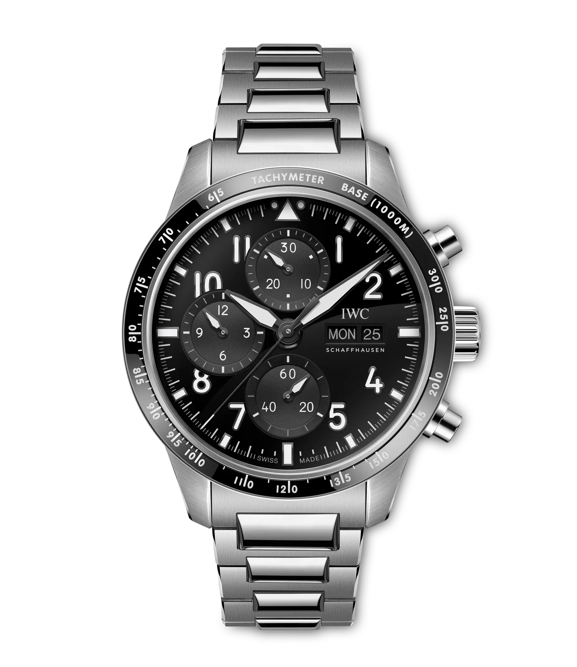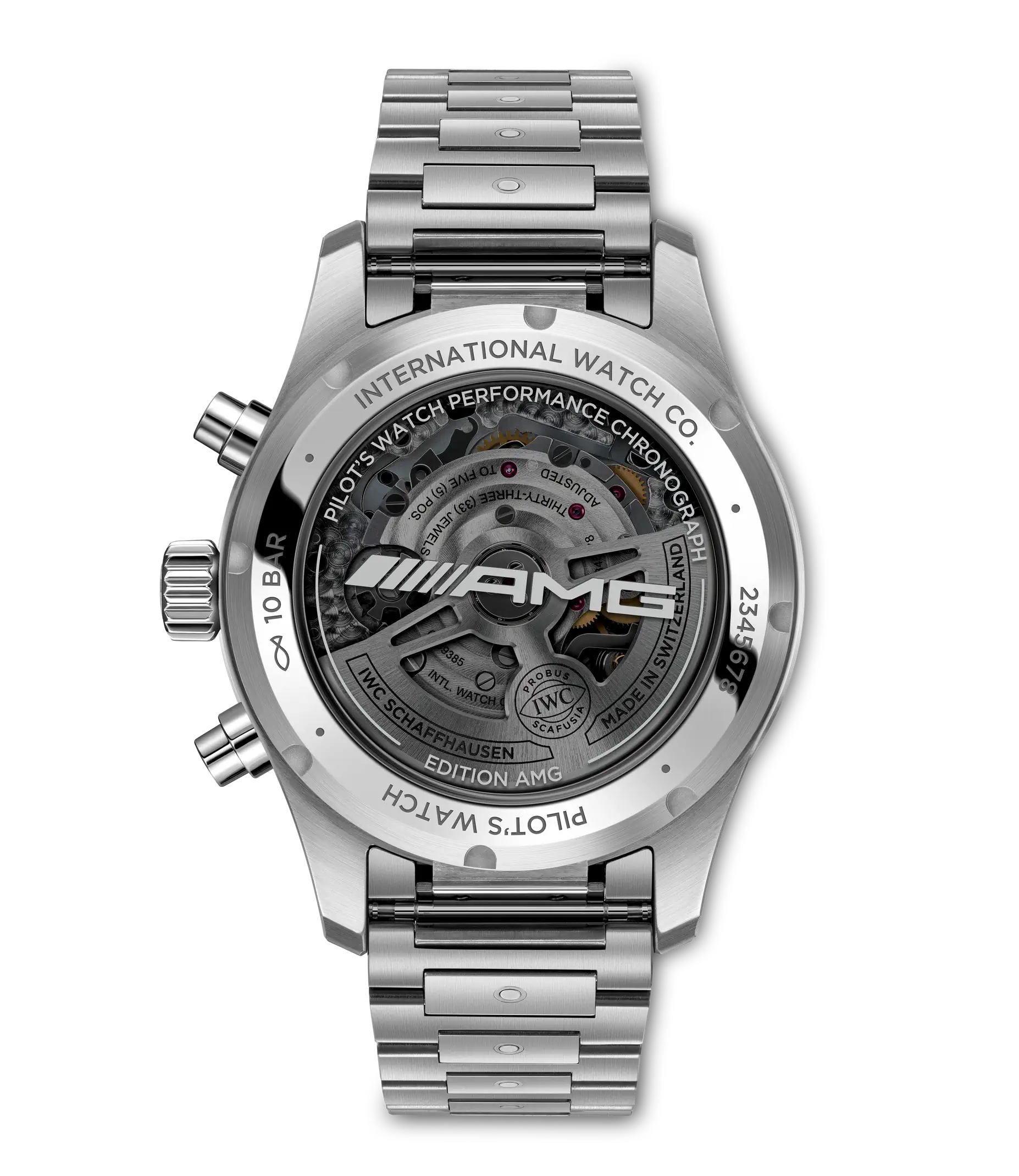 Die Pilot´s Watch Performance Chronograph 41 AMG überzeugt mit Vielseitigkeit und einem sportlichen Design. Das Zifferblatt mit den verschiedenen Zählern unterstreicht nicht nur das typische Instrumenten-Design. Die mechanische Stoppuhr bietet auch nahezu unbegrenzte Anwendungsmöglichkeiten im Alltag. Die Uhr in einem ergonomischen Durchmesser von 41mm wird vom IWC-Manufakturkaliber 69385 angetrieben. Das robuste und präzise Chronographenwerk mit Kolonnenrad ist durch den Saphirglasboden sichtbar. Dieses Modell verfügt über ein Titangehäuse, ein schwarzes Zifferblatt, rhodinierte Zeiger und ein schwarzes Kautschukband. Das integrierte EasX-CHANGE System ermöglicht es, das Armband im Handumdrehen zu wechseln. Erhältlich sind Armbänder aus Kautschuk in verschiedenen Farben, aber auch ein hochwertiges Titanband mit Feineinstellverschluss. In Kombination mit dem bis 10 bar wasserdichten Gehäuse macht diese Vielseitigkeit den Chronographen zum perfekten Begleiter für jedes Abenteuer – nicht nur im Cockpit.