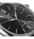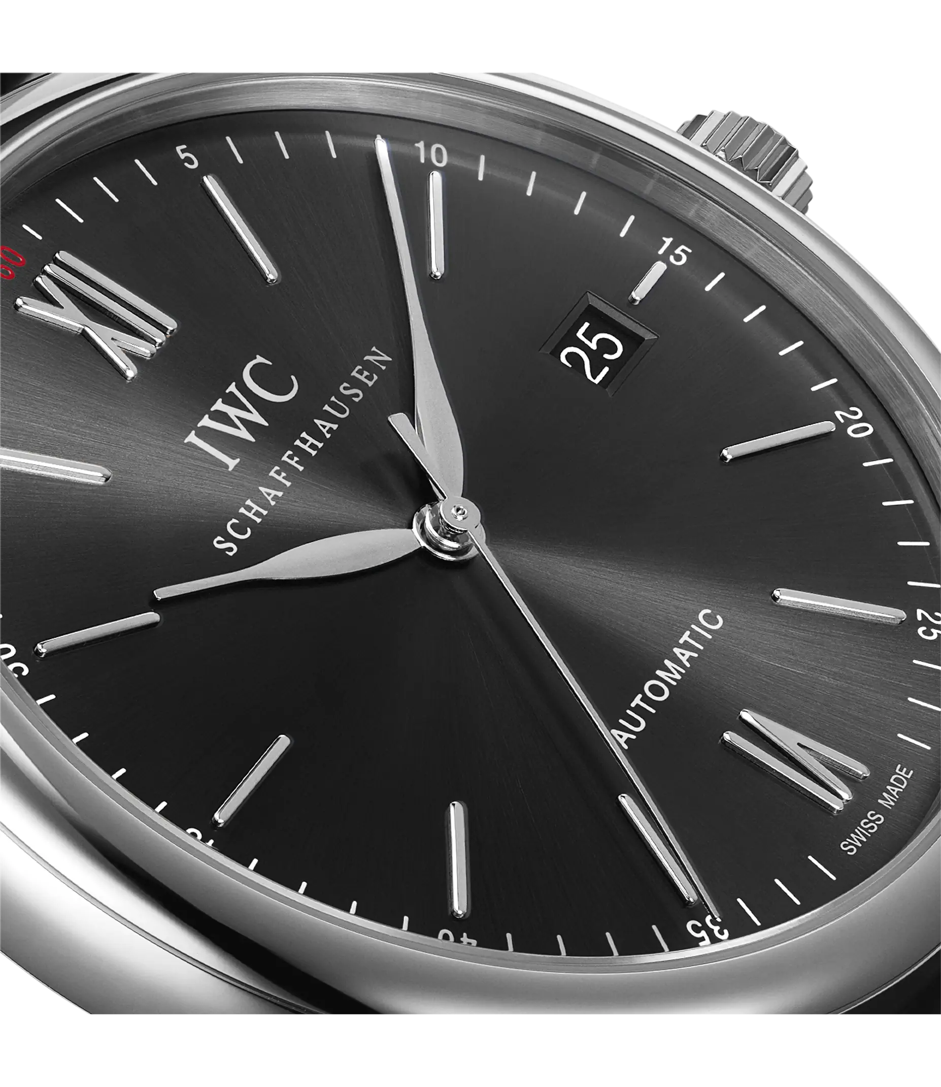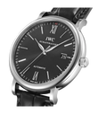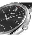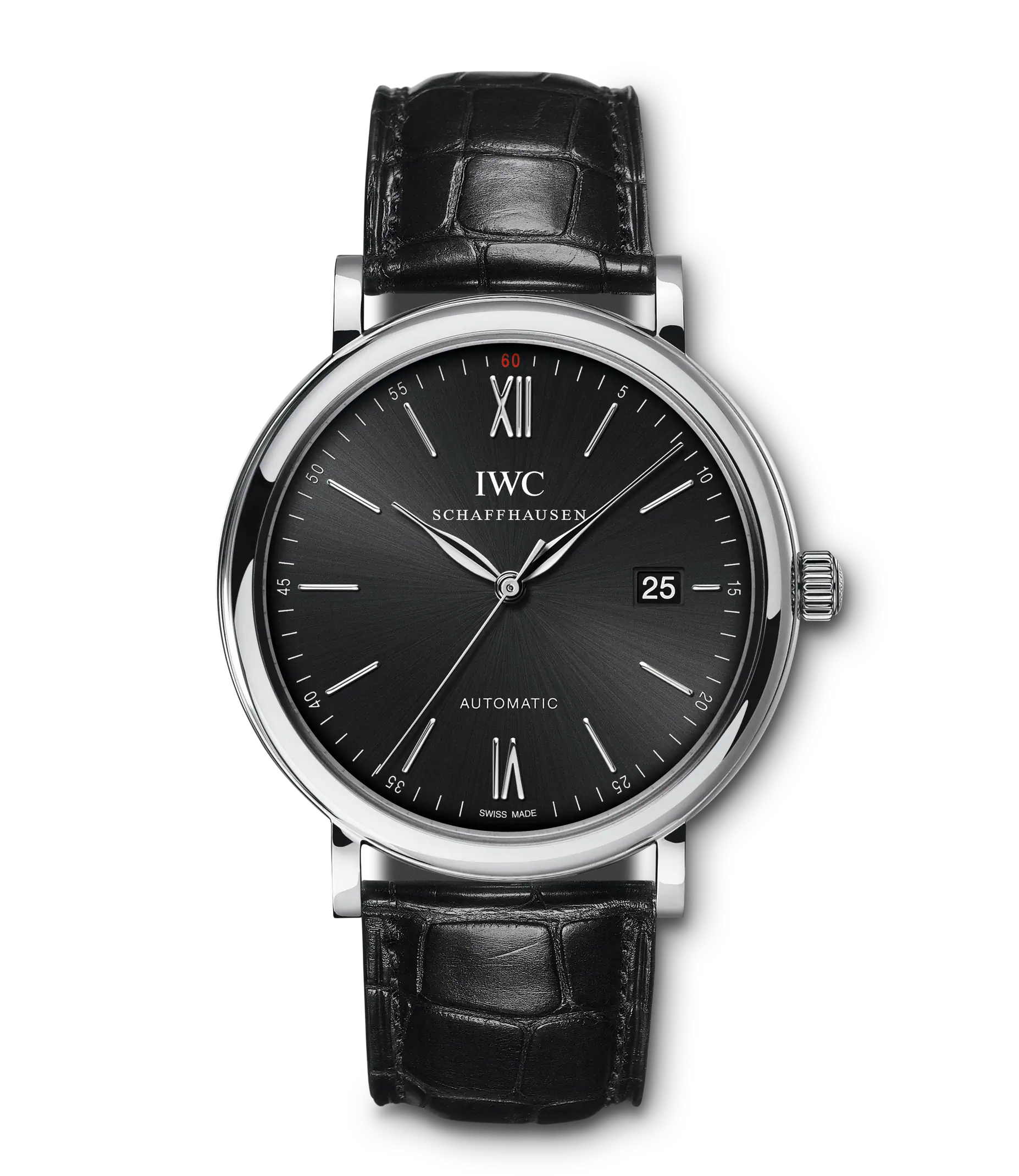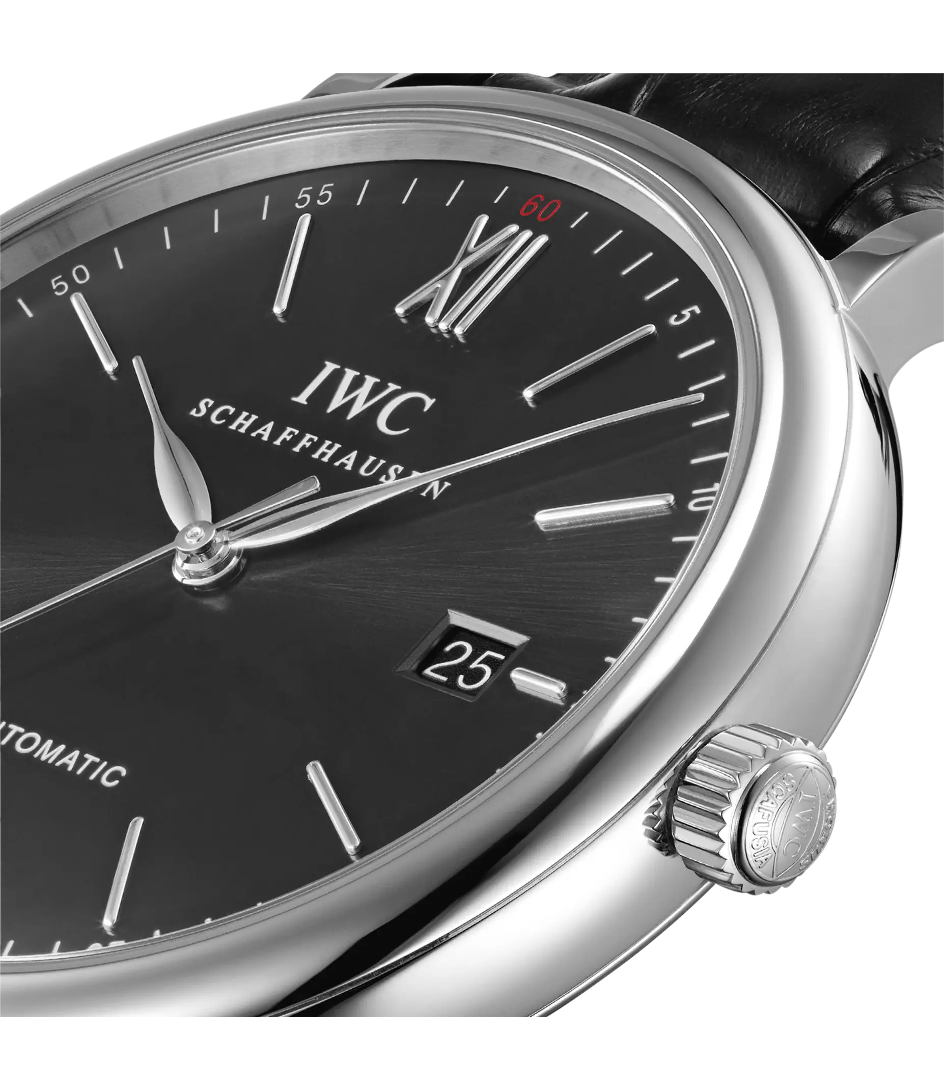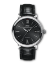 Silberfarbene Zeiger und Appliken, ein schwarzes Zifferblatt sowie ein schwarzes Armband aus Krokoeder verleihen dieser Portofino Automatic in Edelstahl einen speziellen Charme. Mit ihrem reduzierten Design, das gleichzeitig eine klassische Eleganz ausstrahlt, begeistert die Portofino von IWC Schaffhausen seit 1984 sowohl Frauen als auch Männer. Einfache Dreizeigeruhren mit einer schlichten und außergewöhnlich klaren Formensprache bilden seit den Anfängen einen elementaren Bestandteil dieser Kollektion. Die Portofino Automatic verfügt über alle typischen Portofino-Designmerkmale wie etwa ein klassisches rundes Gehäuse mit geraden Hörnern, applizierte Indizes und römische Ziffern sowie schlanke Feuille-Zeiger. Diese Version in einem 40mm-Edelstahlgehäuse verfügt über eine Datumsanzeige bei "3 Uhr".