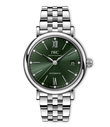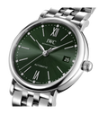 Die Portofino Automatic 37 ist mit dem IWC-Manufakturkaliber 32111 ausgestattet und verfügt über einen Sichtboden aus Saphirglas. Mit ihrem reduzierten Gehäusedurchmesser von 37mm, der auch an schmaleren Handgelenken einen hohen Tragekomfort bietet, ist die Portofino Automatic 37 zu einer festen Größe im Damenuhren-Portfolio von IWC geworden. Diese Version verfügt über ein Gehäuse aus Edelstahl, ein dunkelgrünes Zifferblatt sowie silberfarbene Zeiger und Appliken. Auf dem Zifferblatt markieren 12 Diamanten die Stunden. Im Inneren arbeitet das IWC-Manufakturkaliber 32111, das mit einem bidirektionalen Klinkenaufzug eine Gangreserve von 120 Stunden aufbaut. Ein Sichtboden aus Saphirglas ermöglicht einen Blick auf das Werk, das mit einem vergoldeten Rotor und gebläuten Schrauben veredelt wurde. Diese Damenuhr ist mit einem Edelstahlband mit Schnellwechsel-System ausgestattet.