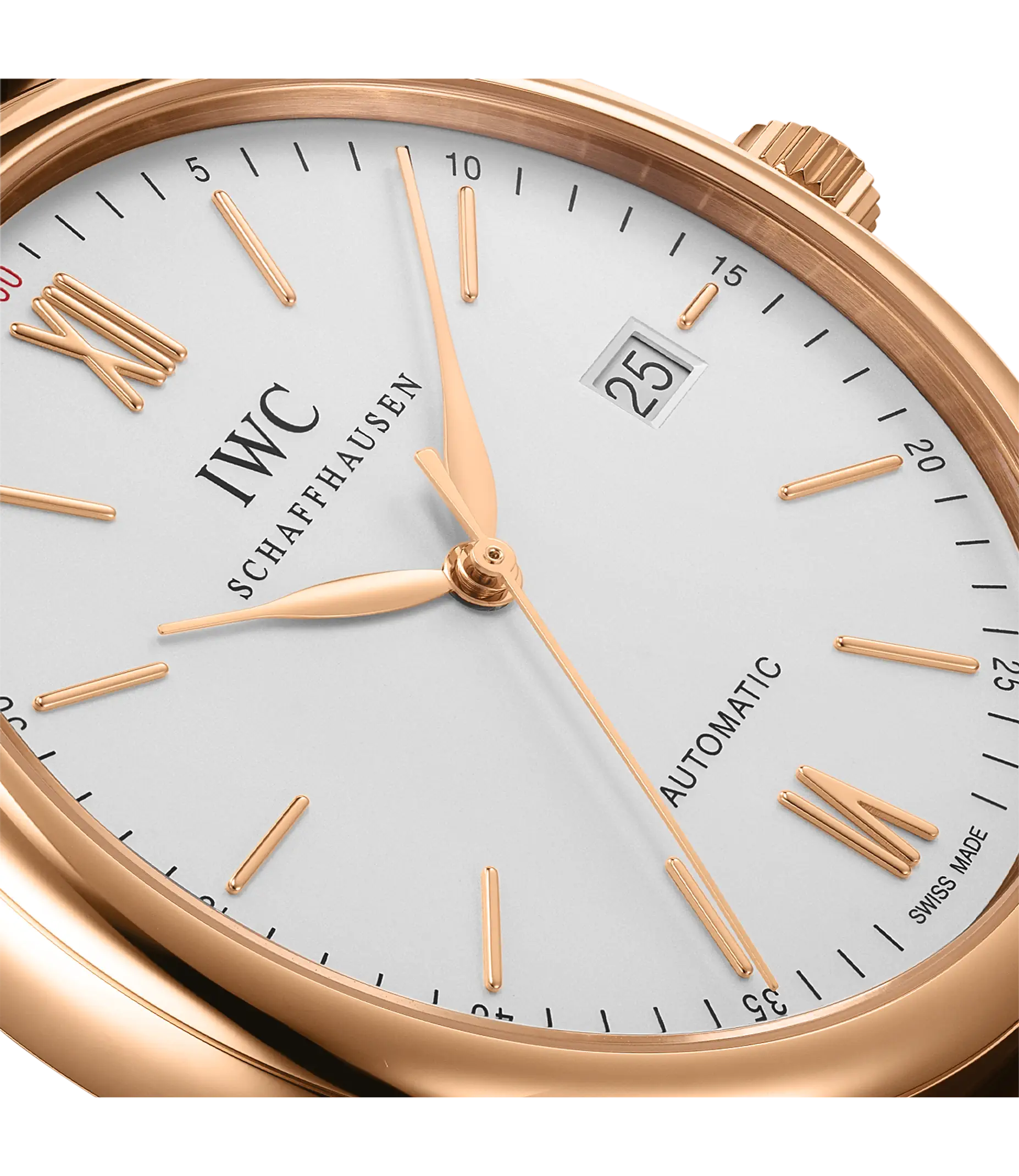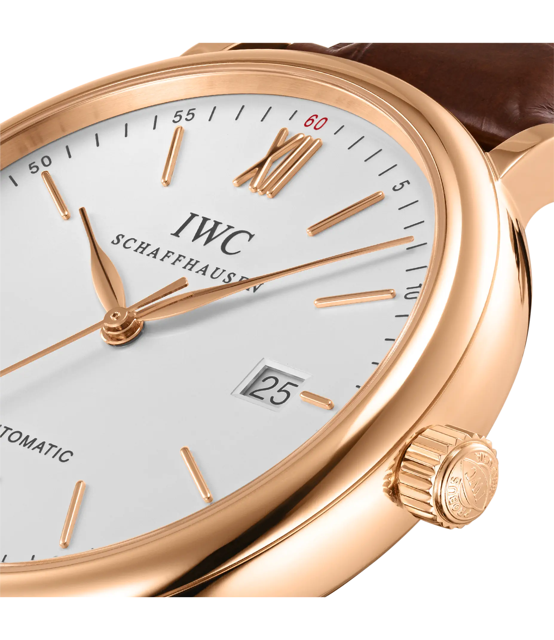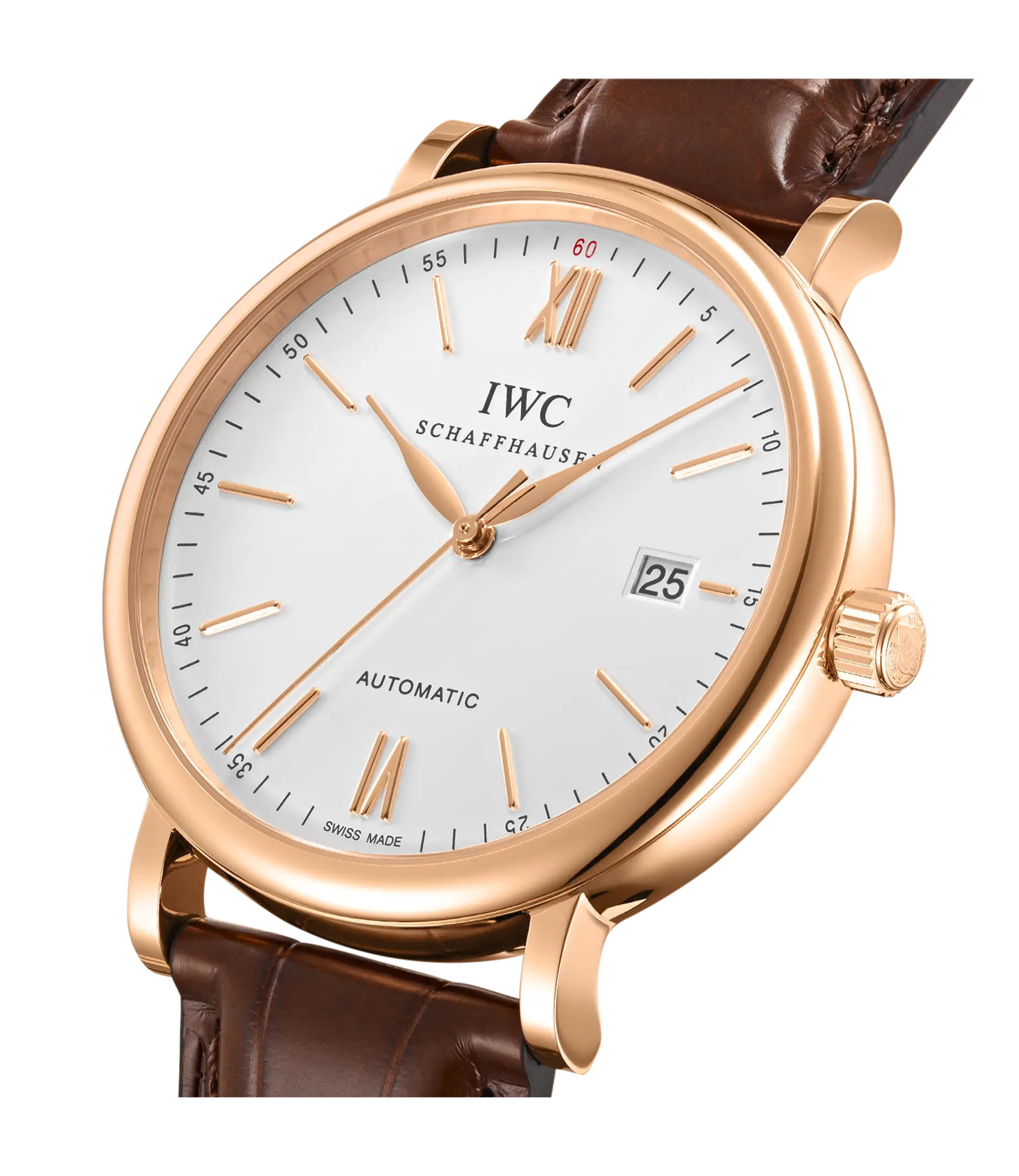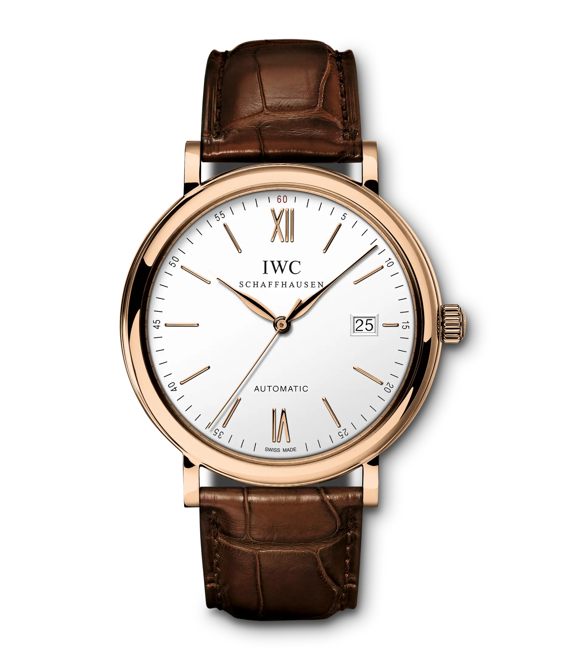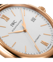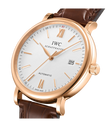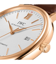 Vergoldete Zeiger und Appliken, ein argentéfarbenes Zifferblatt sowie ein dunkelbraunes Armband aus Krokoleder verleihen dieser Portofino Automatic in 18 Karat Rotgold einen speziellen Charme. Mit ihrem reduzierten Design, das gleichzeitig eine klassische Eleganz ausstrahlt, begeistert die Portofino von IWC Schaffhausen seit 1984 sowohl Frauen als auch Männer. Einfache Dreizeigeruhren mit einer schlichten und außergewöhnlich klaren Formensprache bilden seit den Anfängen einen elementaren Bestandteil dieser Kollektion. Die Portofino Automatic verfügt über alle typischen Portofino-Designmerkmale wie etwa ein klassisches rundes Gehäuse mit geraden Hörnern, applizierte Indizes und römische Ziffern sowie schlanke Feuille-Zeiger. Diese Version in einem 40mm-Edelstahlgehäuse verfügt über eine Datumsanzeige bei "3 Uhr".