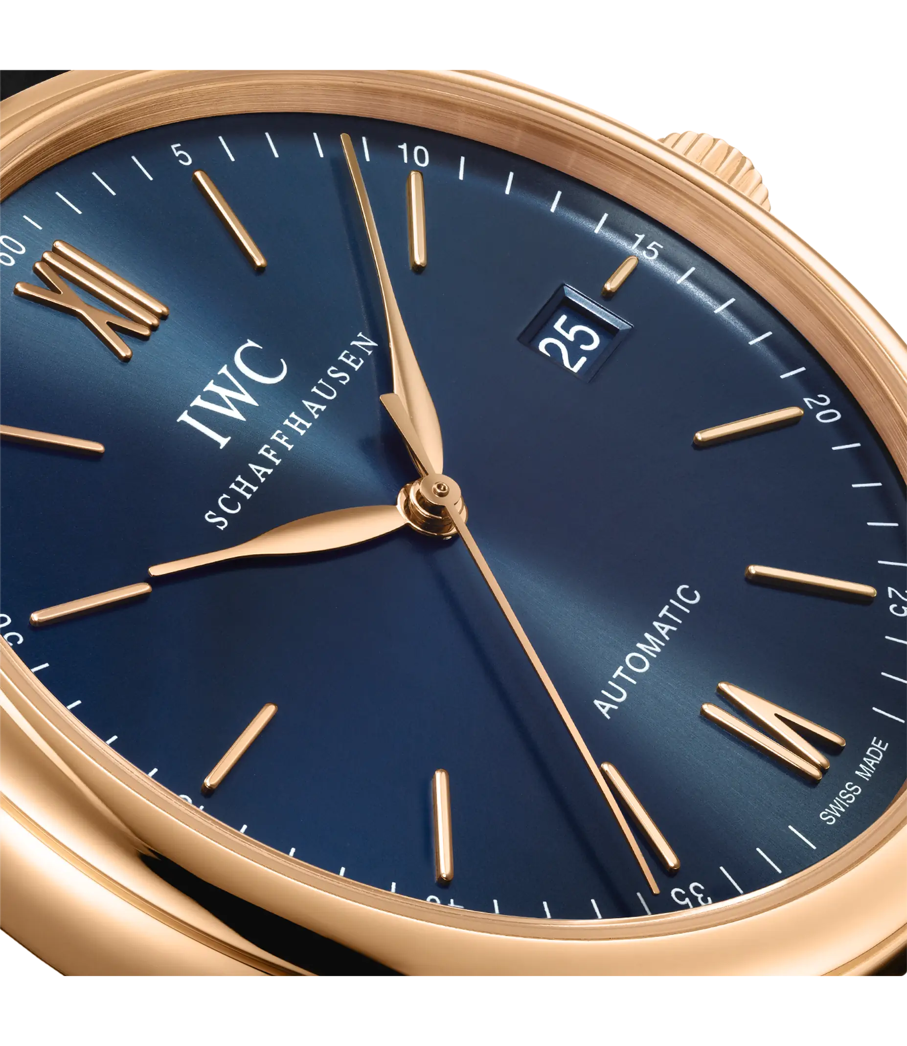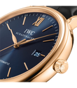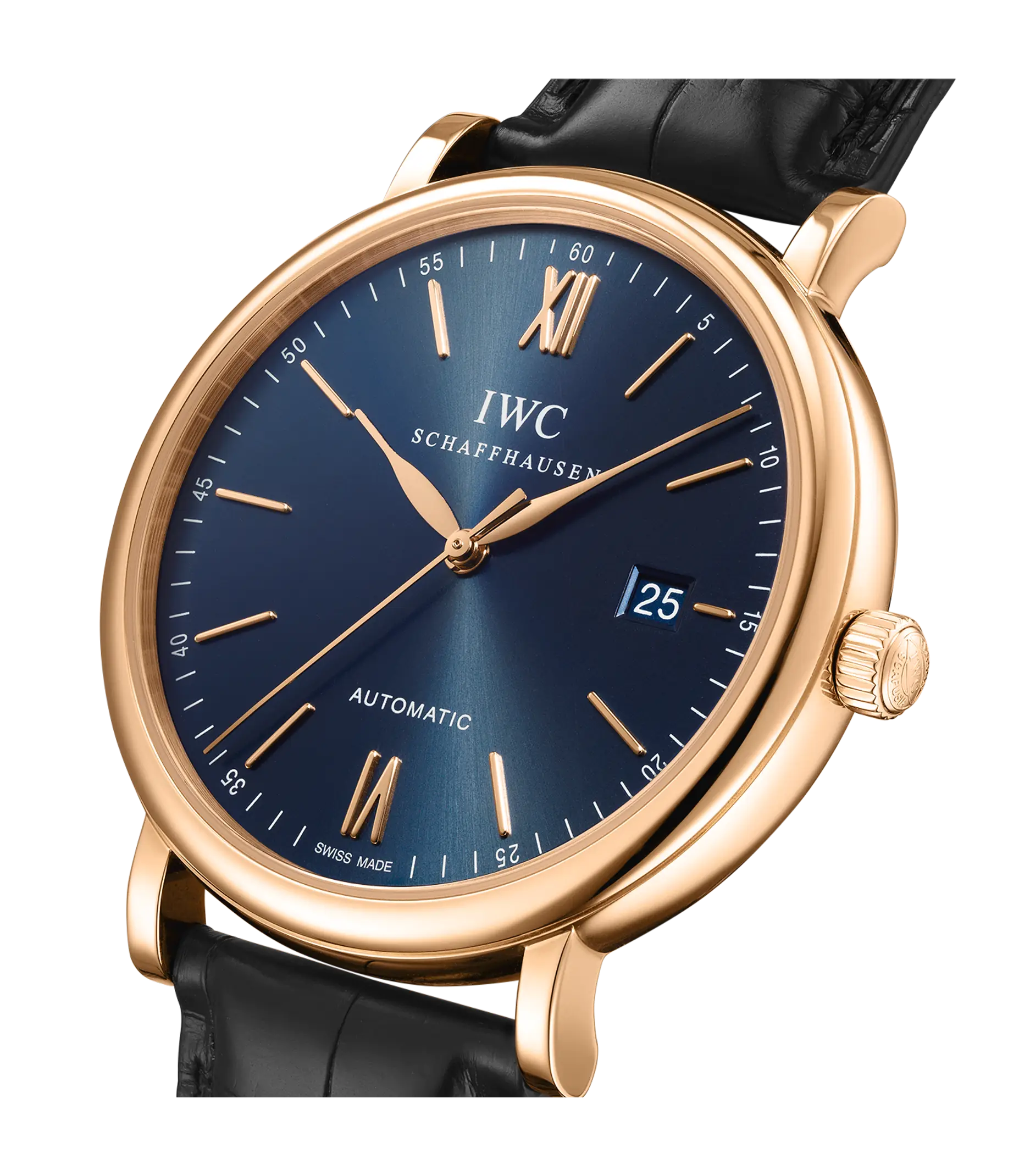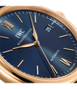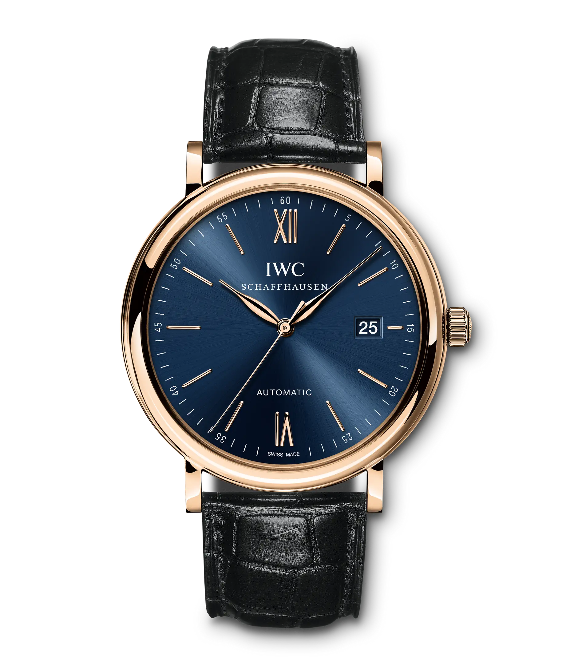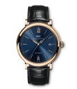 Vergoldete Zeiger und Appliken, ein argentéfarbenes Zifferblatt sowie ein dunkelbraunes Armband aus Krokoleder verleihen dieser Portofino Automatic in 18 Karat Rotgold einen speziellen Charme. Mit ihrem reduzierten Design, das gleichzeitig eine klassische Eleganz ausstrahlt, begeistert die Portofino von IWC Schaffhausen seit 1984 sowohl Frauen als auch Männer. Einfache Dreizeigeruhren mit einer schlichten und außergewöhnlich klaren Formensprache bilden seit den Anfängen einen elementaren Bestandteil dieser Kollektion. Die Portofino Automatic verfügt über alle typischen Portofino-Designmerkmale wie etwa ein klassisches rundes Gehäuse mit geraden Hörnern, applizierte Indizes und römische Ziffern sowie schlanke Feuille-Zeiger. Diese Version in einem 40mm-Edelstahlgehäuse verfügt über eine Datumsanzeige bei "3 Uhr".