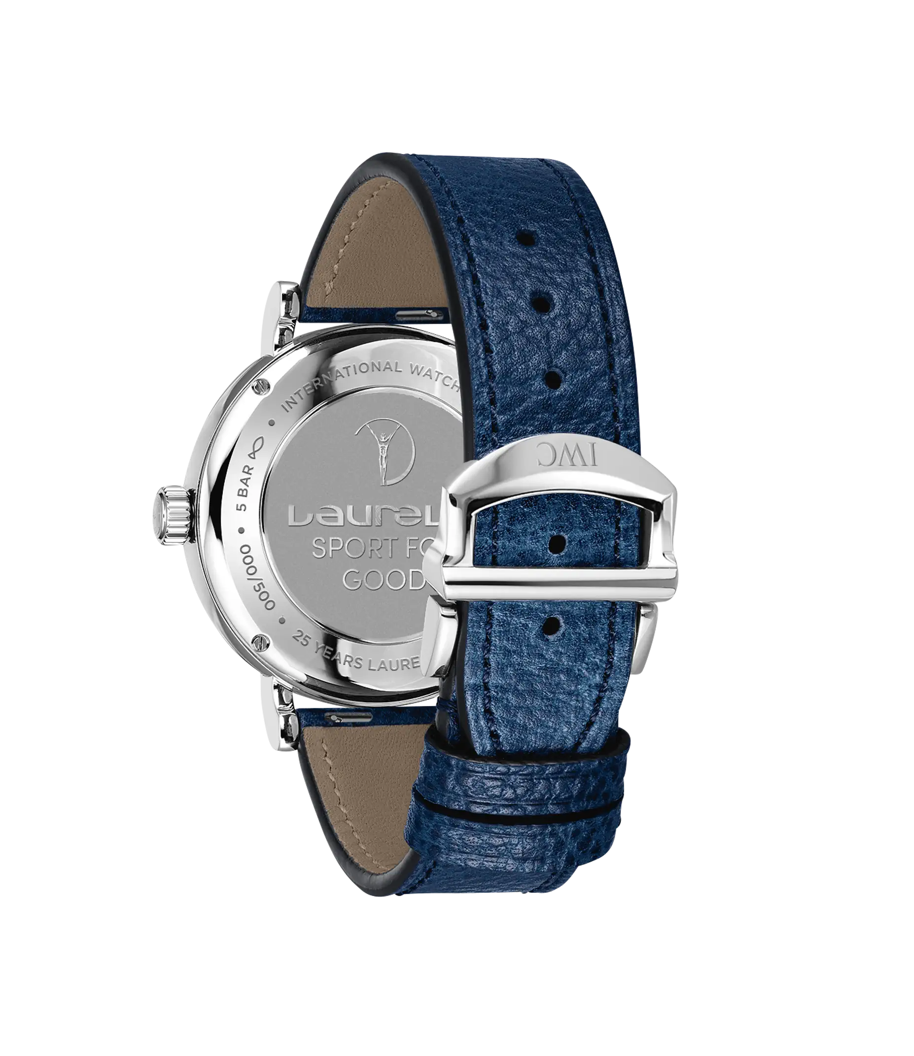 Die Portofino Automatic Pointer Date Laureus ist die 17. Sonderedition, die IWC Schaffhausen zur Unterstützung der Arbeit von Laureus Sport for Good auflegt. Silberfarbene Zeiger und Appliken, ein dunkelblaues Zifferblatt sowie ein dunkelblaues Kalbslederband verleihen dieser Portofino in Edelstahl einen speziellen Charme. Mit ihrem reduzierten Design, das gleichzeitig eine klassische Eleganz ausstrahlt, begeistert die Portofino von IWC Schaffhausen seit 1984 sowohl Frauen als auch Männer. Diese limitierte Version in einem 39mm-Edelstahlgehäuse verfügt zudem über eine Datumsanzeige mit Zeiger bei 6 Uhr.
