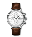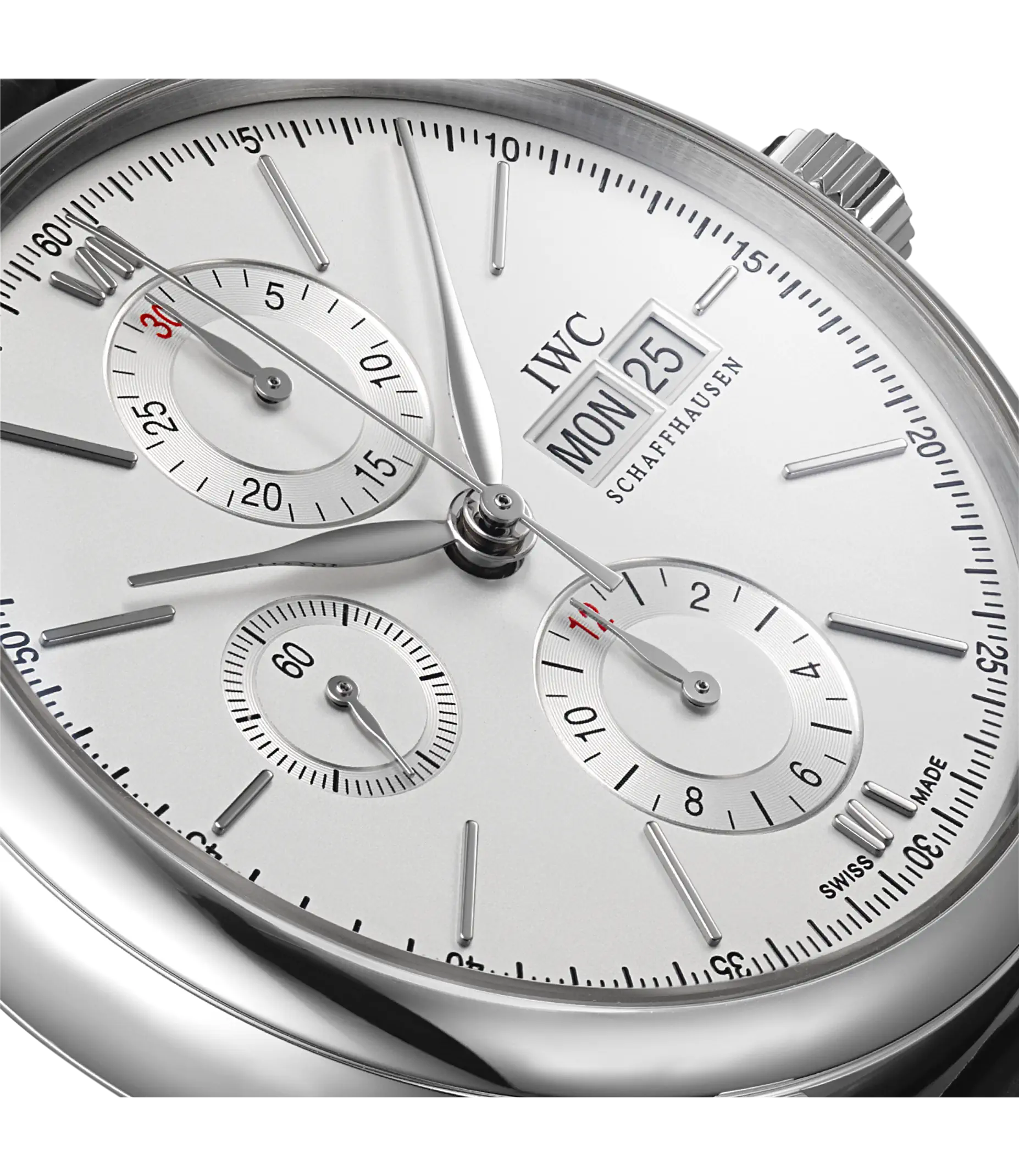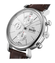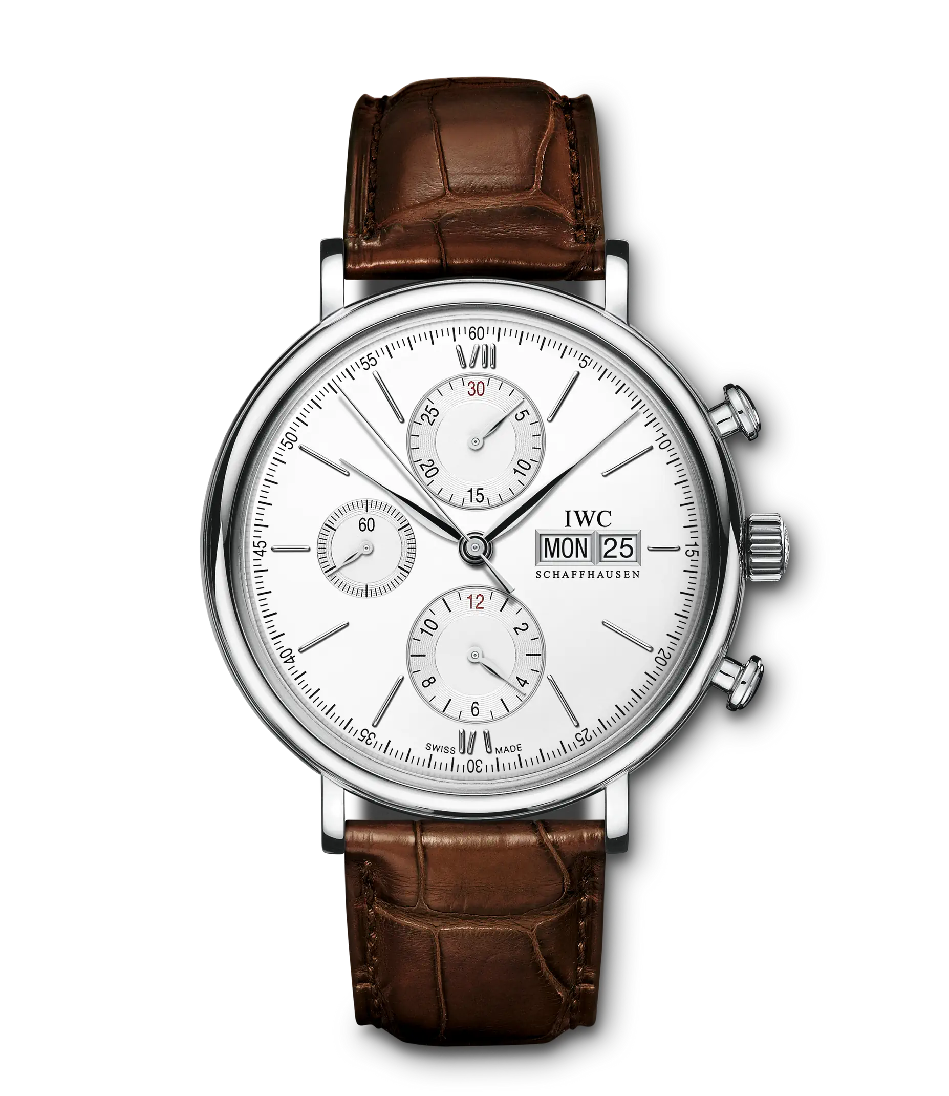 Mit den markanten Drückern und dem funktionalen, technisch anmutenden Zifferblatt bringt der Portofino Chronograph eine erfrischende sportliche Note in die Portofino-Familie. Mit den sportlich-eleganten Drückern und Anzeigen der Zeitmessung nimmt die Uhr gestalterische Anleihen aus dem Design der 1960er-Jahre auf. Der Edelstahl-Chronograph trägt ein gewölbtes Saphirglas und applizierte römische Ziffern auf dem argentéfarbenen Zifferblatt. Angetrieben wird er vom bewährten Automatikaufzug Kaliber 79320 mit 44 Stunden Gangreserve. Die Uhr ist mit einem dunkelbraunen Krokolederband ausgestattet.