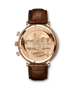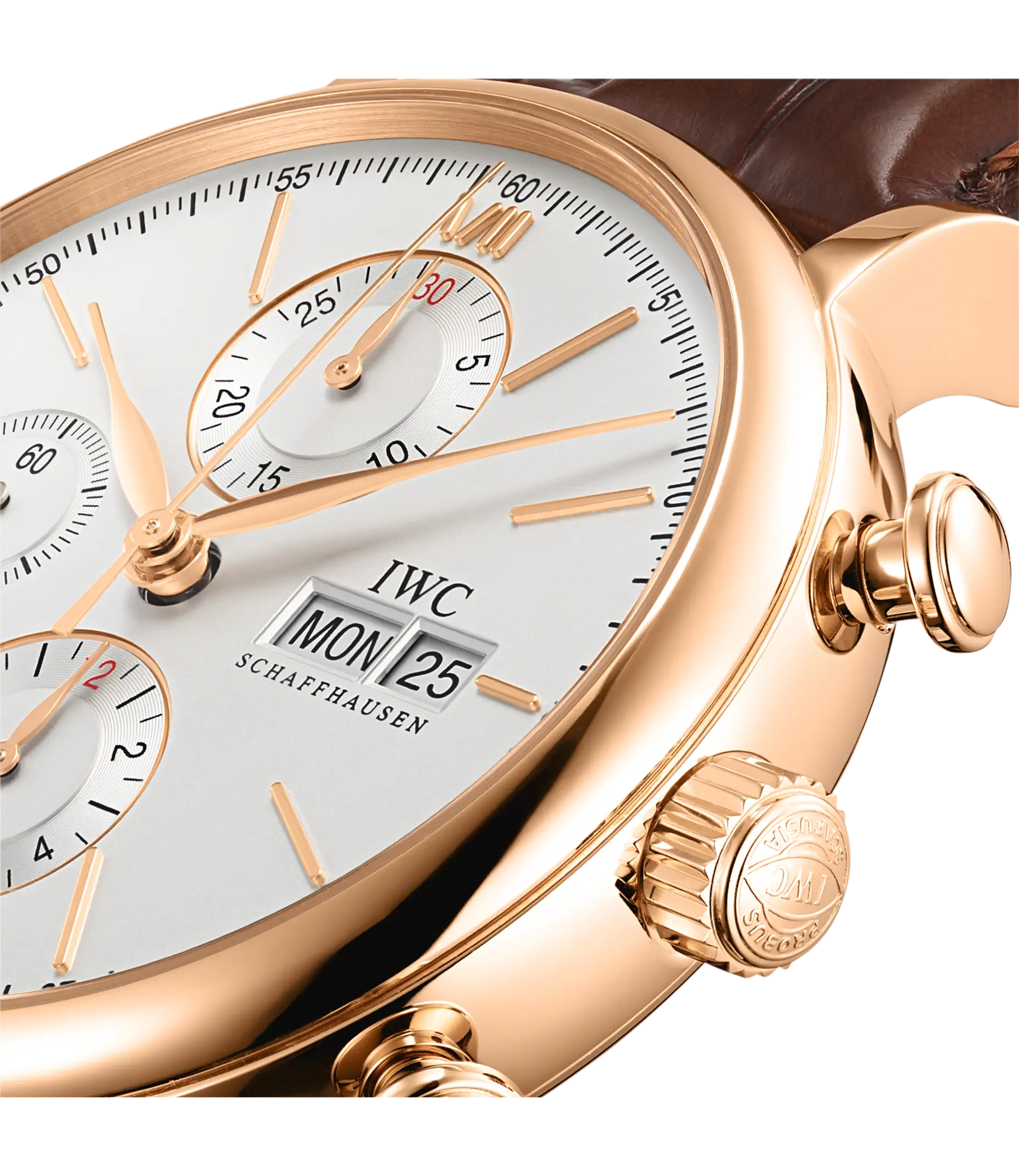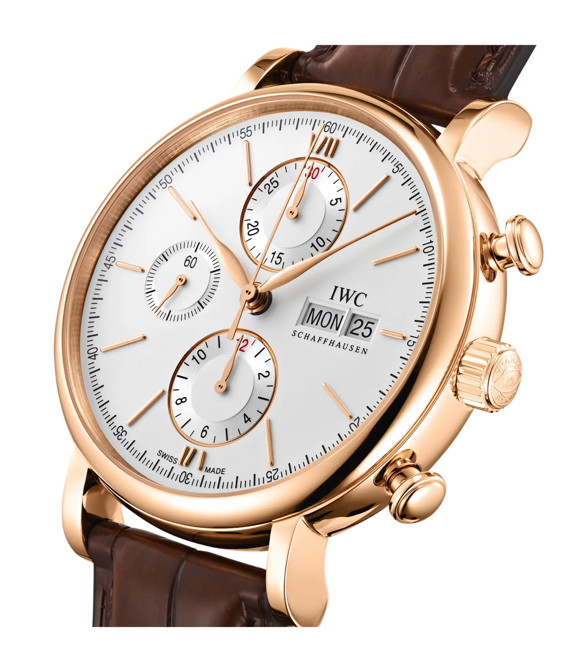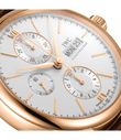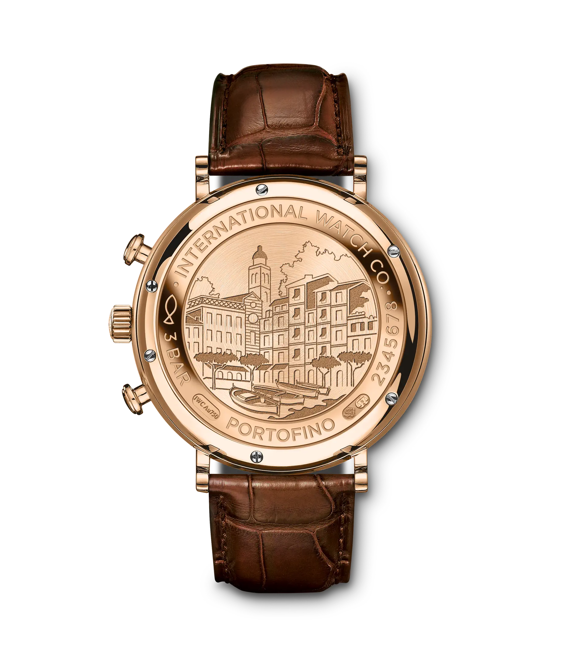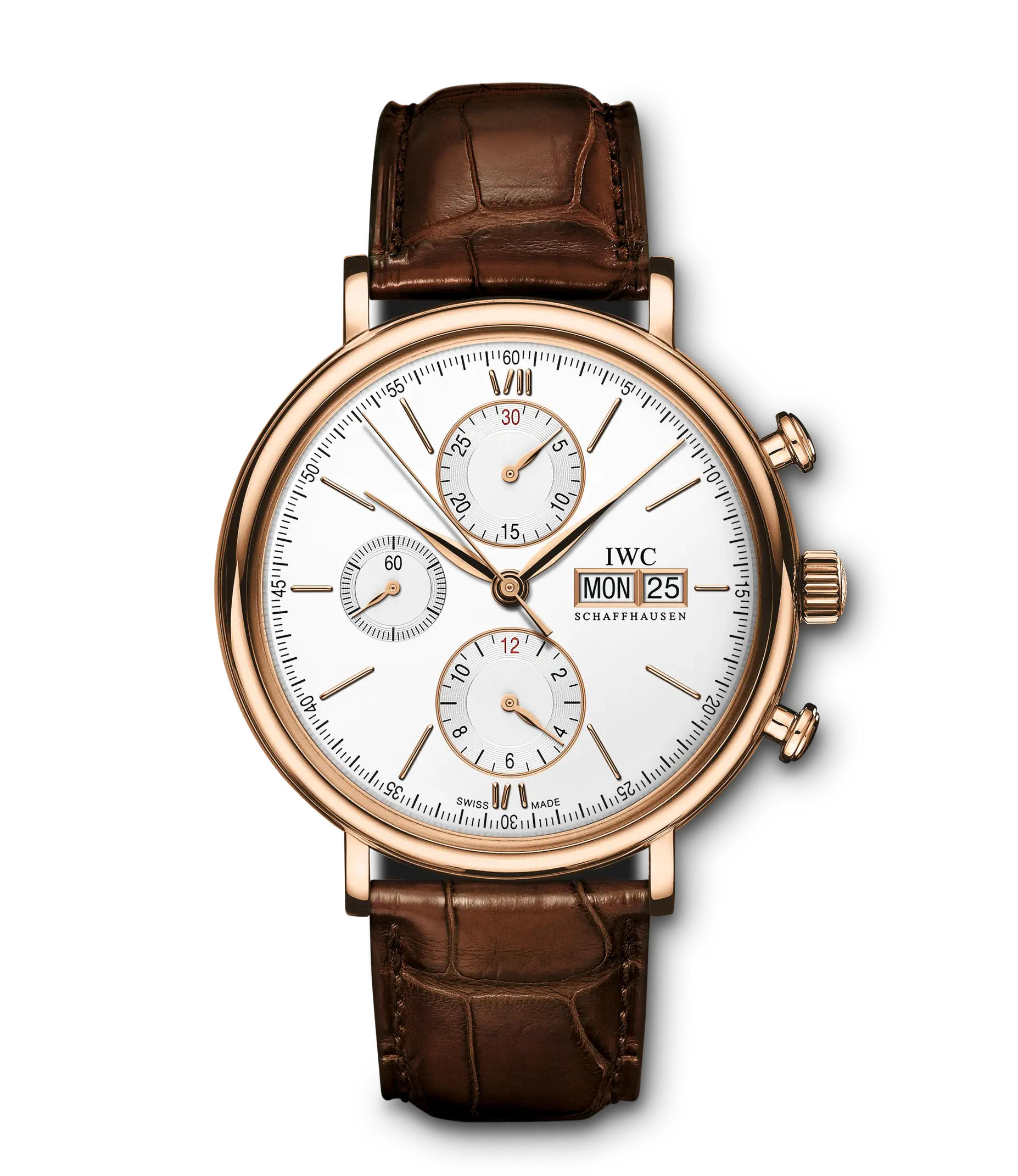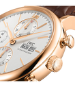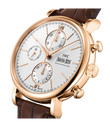 Mit den markanten Drückern und dem funktionalen, technisch anmutenden Zifferblatt bringt der Portofino Chronograph eine erfrischende sportliche Note in die Portofino-Familie. Mit den sportlich-eleganten Drückern und Anzeigen der Zeitmessung nimmt die Uhr gestalterische Anleihen aus dem Design der 1960er-Jahre auf. Der Rotgold-Chronograph trägt ein gewölbtes Saphirglas und applizierte römische Ziffern auf dem argentéfarbenen Zifferblatt. Angetrieben wird er vom bewährten Automatikaufzug Kaliber 79320 mit 44 Stunden Gangreserve. Die Uhr ist mit einem dunkelbraunen Krokolederband ausgestattet.