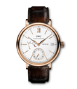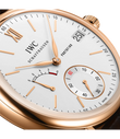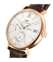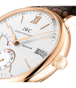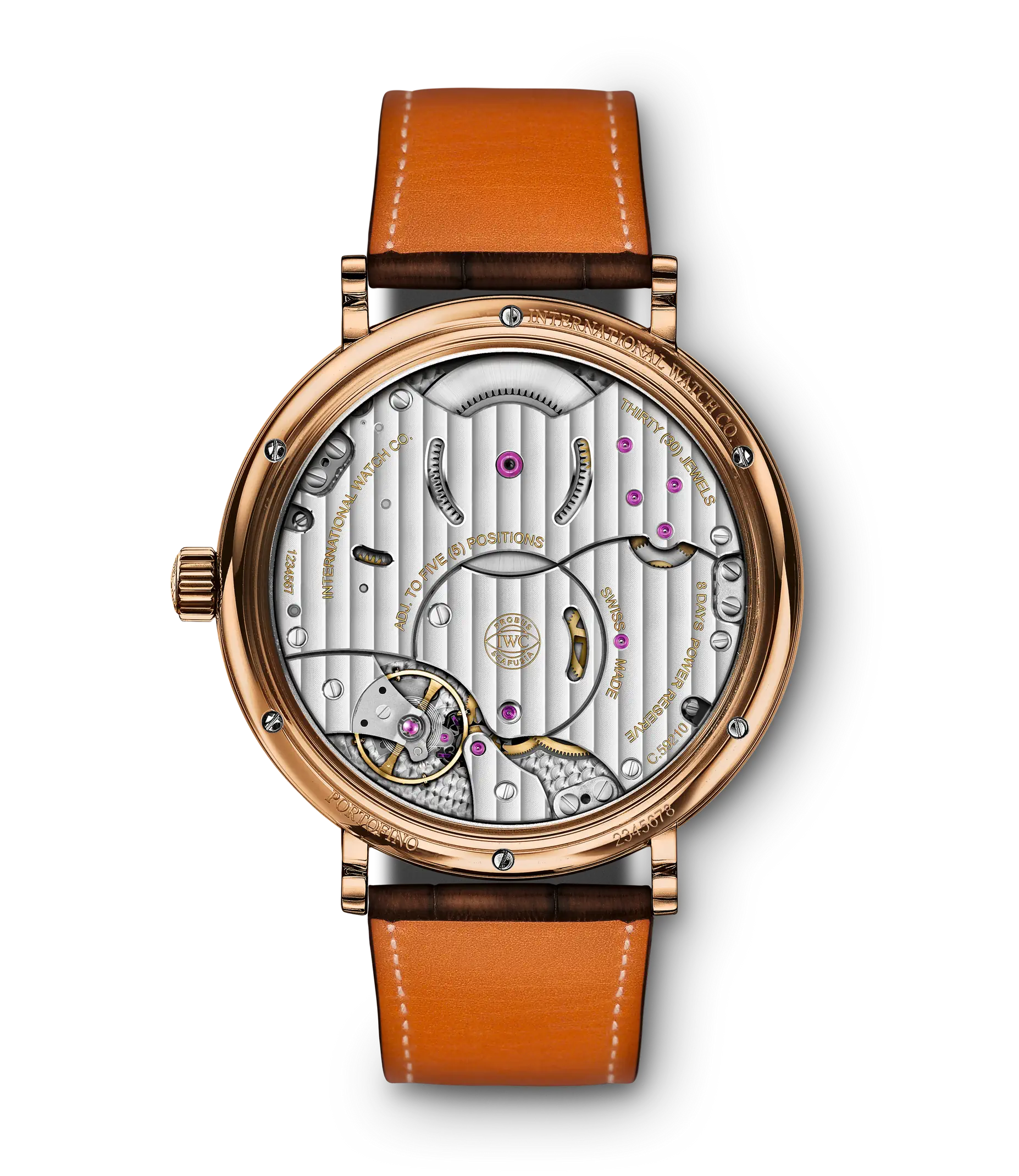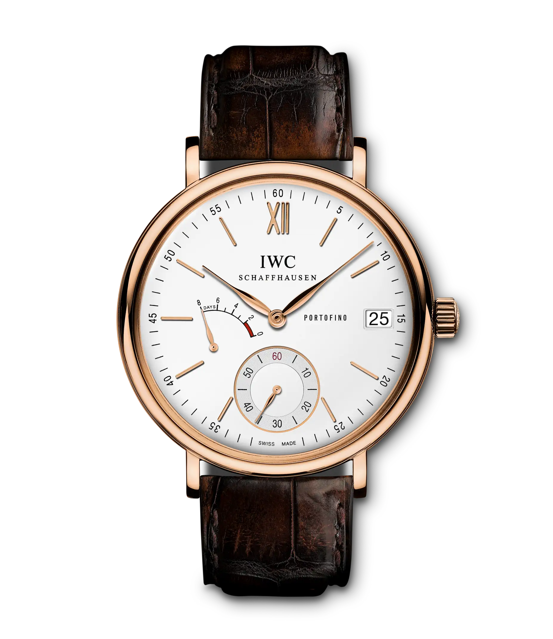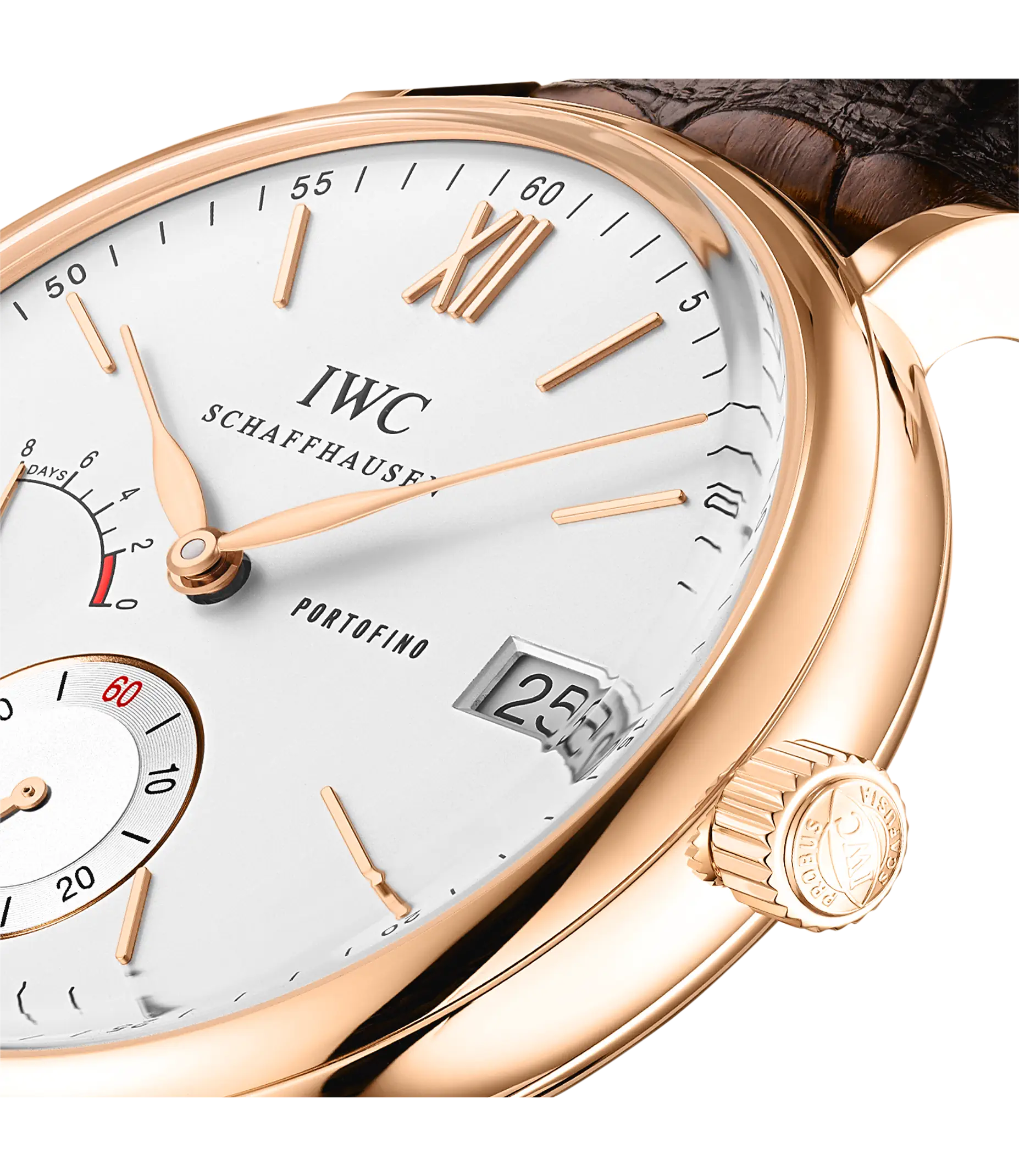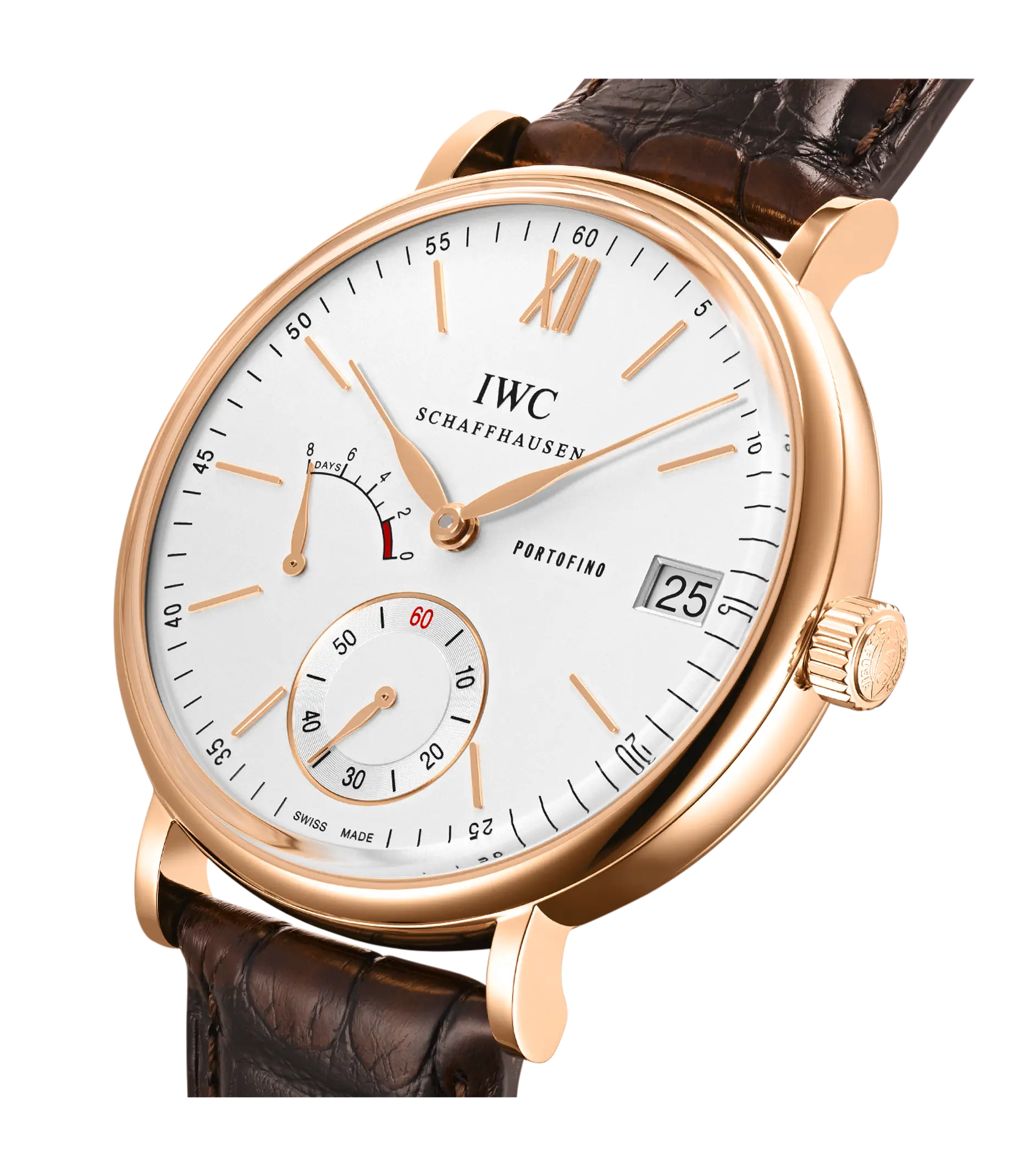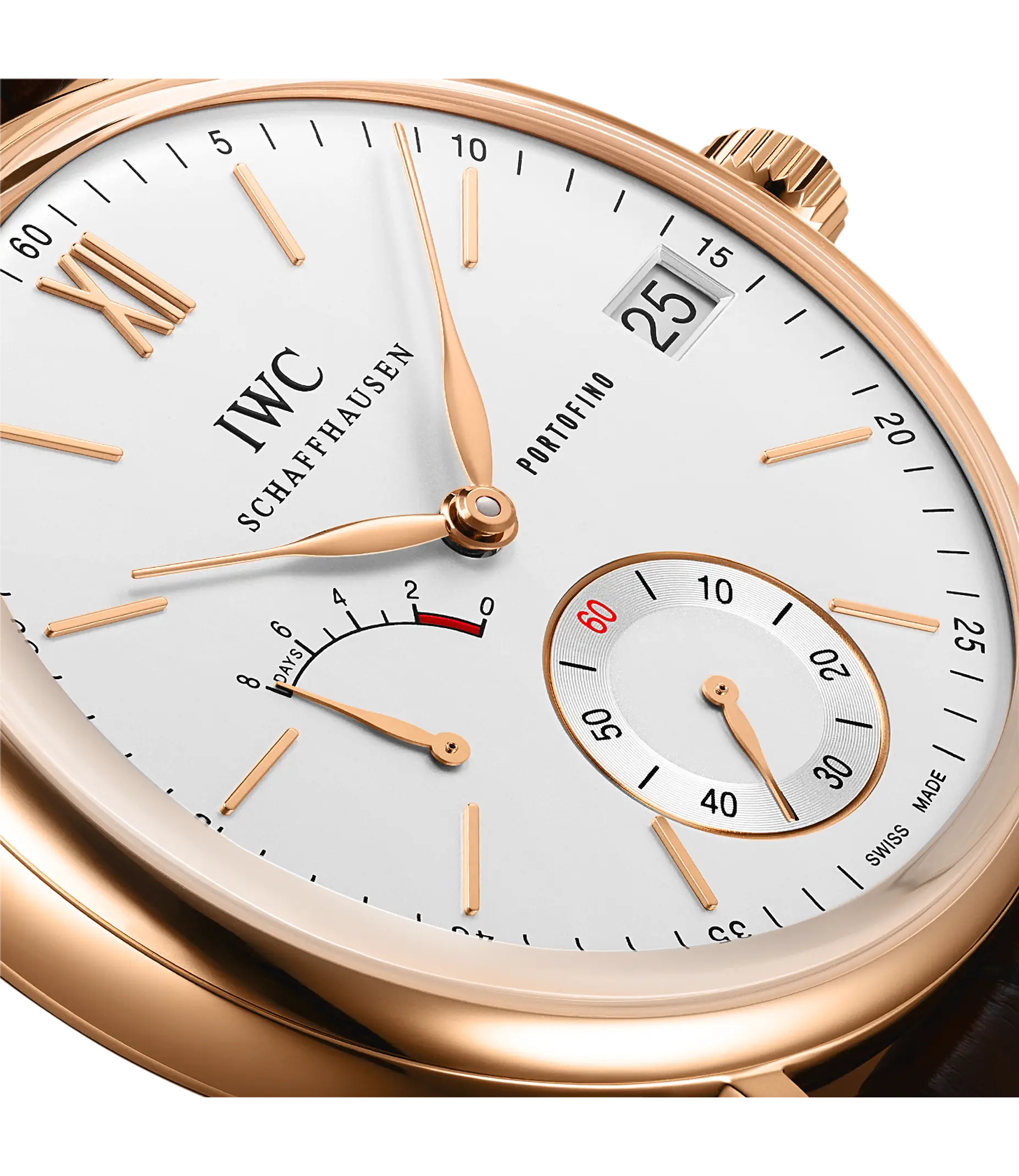 Die Portofino Hand-Wound Eight Days in Rotgold ist eine Referenz an die erste Portofino von 1984. Die Uhr wird vom Handaufzugwerk Kaliber 59210 angetrieben und erlaubt mit einem Aufziehen acht Tage Gangdauer. Das argentéfarbene Zifferblatt mit Datumsanzeige, Kleiner Sekunde und Gangreserve-Anzeige erscheint schlicht und ausgewogen. Der Sichtboden aus Saphirglas gestattet Einblick in das Acht-Tage-Werk und auf die Platinen und Brücken mit verschiedenen Zierschliffen. Das dunkelbraune Armband besteht aus Krokoleder und wird vom italienischen Hersteller Santoni bezogen.