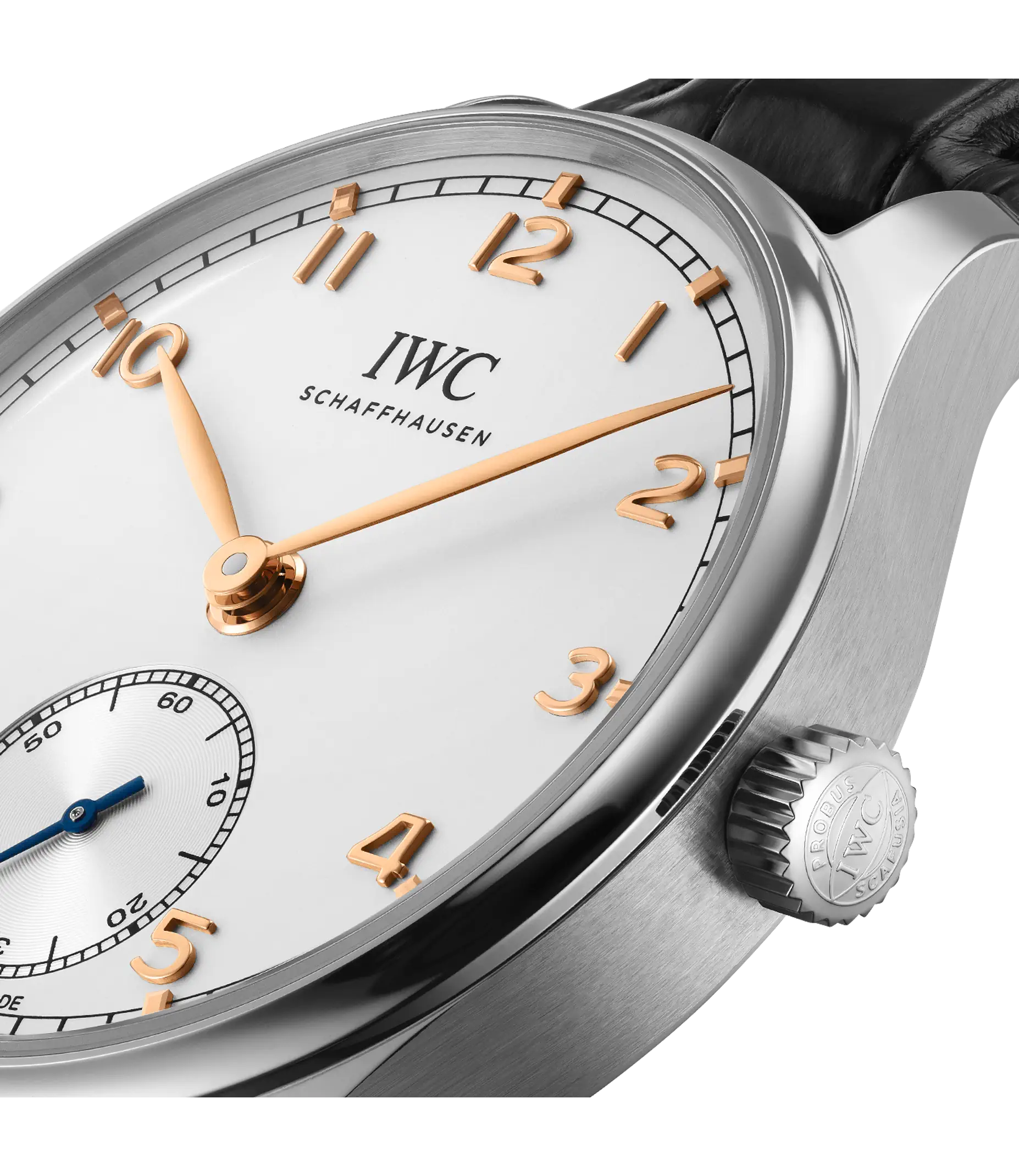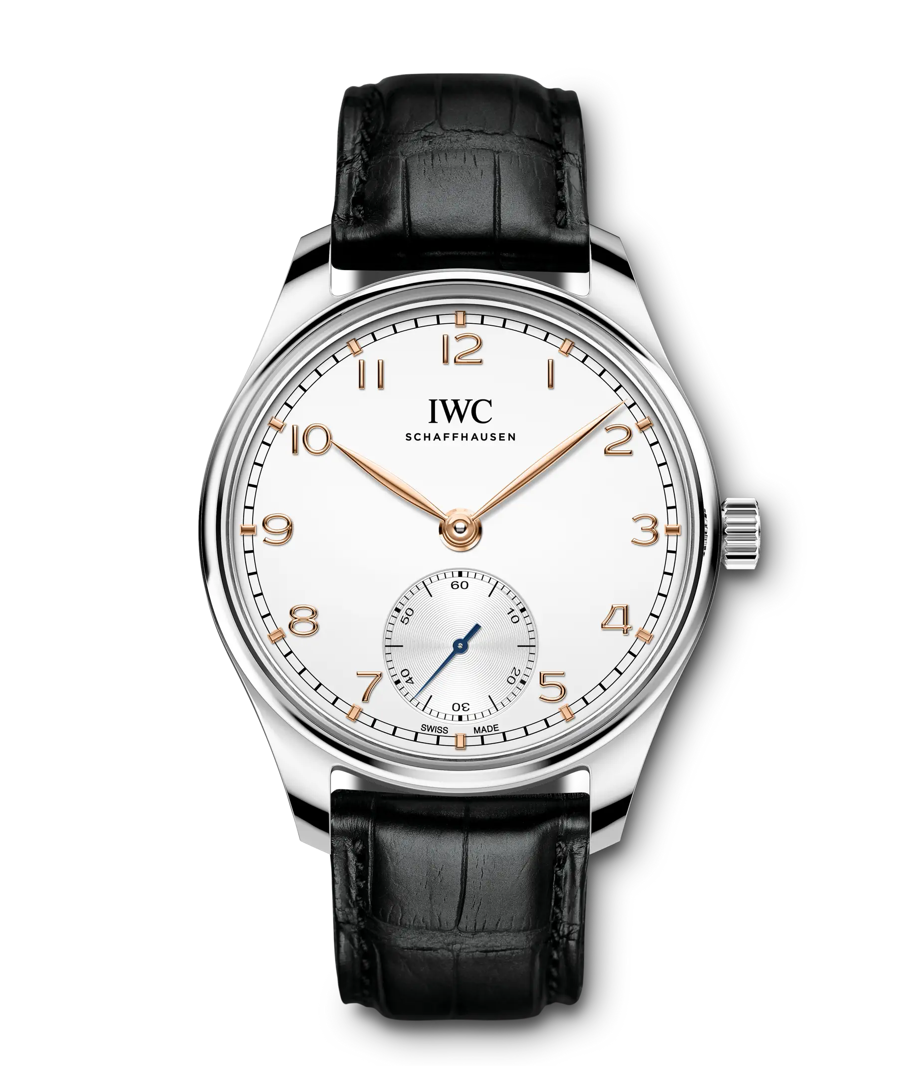 Die Portugieser Automatic 40 präsentiert das ikonische Portugieser-Design in einem kompakten Durchmesser von 40mm. Ein klar strukturiertes, offenes Zifferblatt, eine charakteristische Minutenskala und die kleine Sekunde bei „6 Uhr“: Mit der Referenz 325 hat IWC in den späten 1930-er Jahren eine klassische Formensprache begründet, die sich seither wie ein roter Faden durch die Geschichte der Portugieser-Familie zieht. Jetzt kehrt das zeitlos moderne Design mit einem neuen Automatikmodell im kompakten Durchmesser von 40mm in die Kollektion zurück. Angetrieben wird die Portugieser Automatic 40 vom Manufakturkaliber 82200. Das hochwertige und robuste Automatikwerk verfügt über einen Pellaton-Aufzug mit Komponenten aus nahezu verschleißfreier Keramik, der eine Gangreserve von 60 Stunden aufbaut. Dieses Modell hat ein Gehäuse aus Edelstahl, ein argentéfarbenes Zifferblatt sowie vergoldete Zeiger und Appliken. Es wird an einem schwarzen Alligatorlederarmband getragen. Die Doppel-Faltschließe sorgt für einen hohen Tragekomfort.