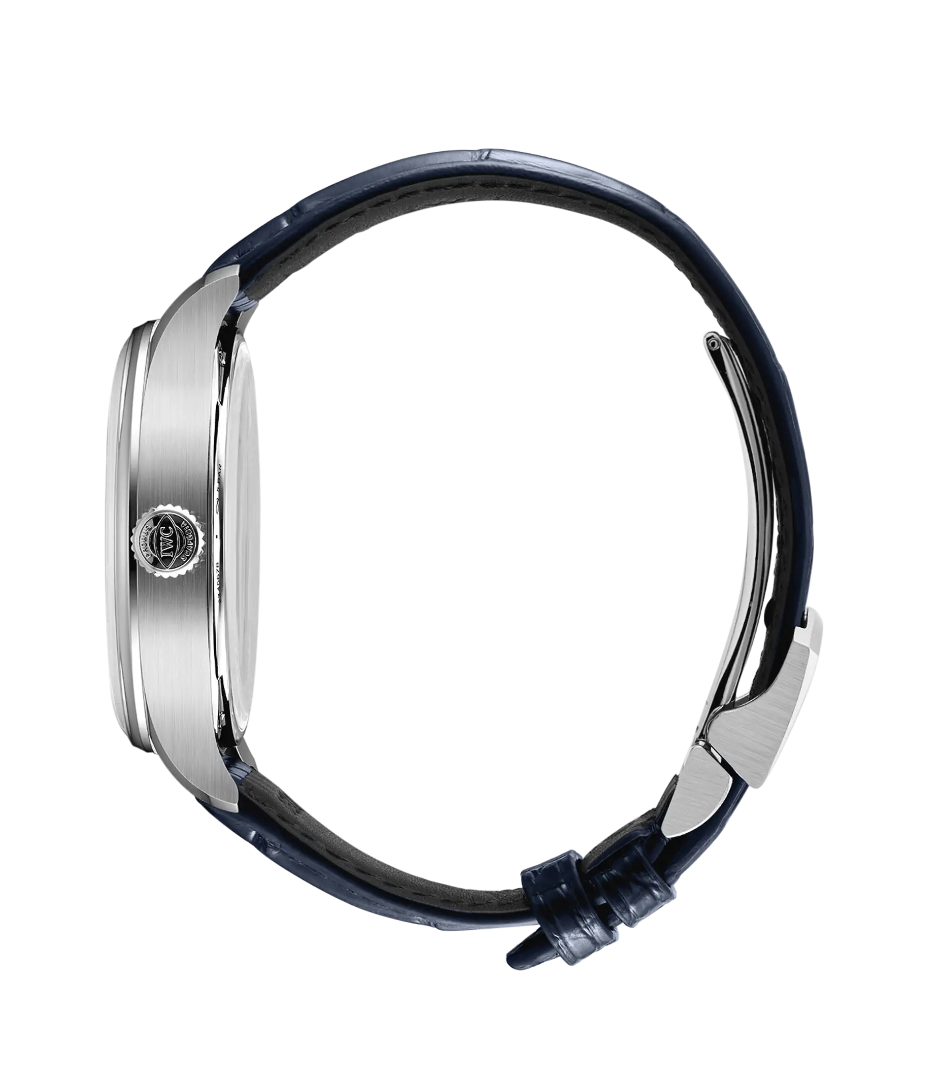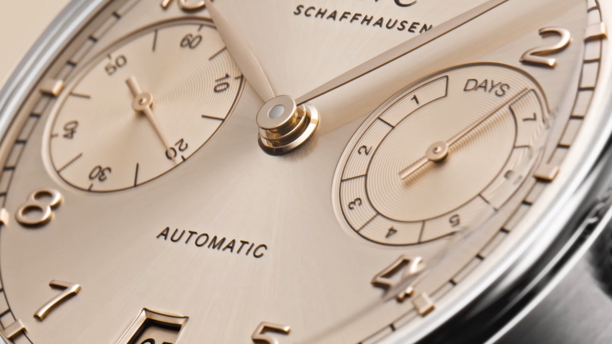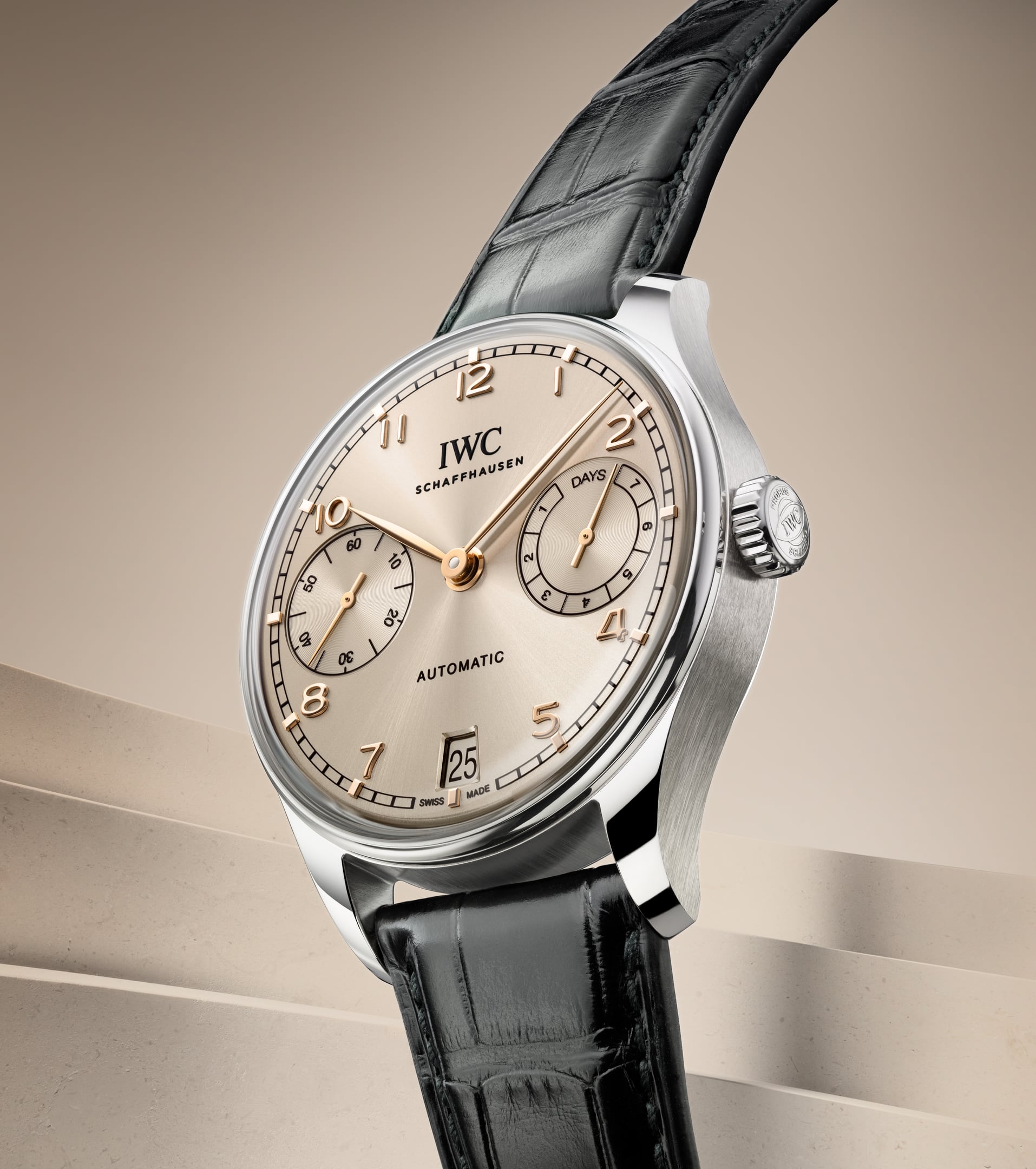 Die Ursprünge der IWC Portugieser reichen in die späten 1930er Jahre zurück, als IWC Schaffhausen ein hochpräzises Taschenuhrwerk verwendete, um eine besonders große Armbanduhr mit Chronometer-Präzision zu schaffen. Die im Jahr 2000 eingeführte Portugieser Automatic 42 präsentiert ein offenes, ausgewogenes Zifferblatt mit einer Gangreserveanzeige um 3 Uhr und einer auf der gegenüberliegenden Seite um 9 Uhr positionierten Sekundenanzeige. Diese Version verfügt über ein Gehäuse Edelstahl mit einem Durchmesser von 42,4mm, ein Zifferblatt in der Farbe Dune, sowie vergoldete Zeiger und Gold-Appliken. Dank einer von Grund auf überarbeiteten Gehäusekonstruktion mit einem dünneren Gehäusering und kastenförmigen Saphirgläsern auf der Vorder- und Rückseite wirkt die Uhr besonders leicht und elegant. Ein Highlight der Uhr ist das aufwändig gefertigte Zifferblatt, das in einem komplexen Herstellungsprozess mit 60 einzelnen Schritten gefertigt wird. Die ungewöhnliche optische Tiefe entsteht durch das Auftragen von 15 Schichten transparenten Lacks, der fein geschliffen und anschließend auf Hochglanz poliert wird. Die Hilfszifferblätter werden sowohl in den Messingrohling als auch in die Lackschicht gefräst. Ein spezielles Druckverfahren verstärkt den dreidimensionalen Effekt. Zum Schluss werden die Appliken einzeln von Hand aufgesetzt. Angetrieben wird die Portugieser Automatic vom IWC-Manufakturkaliber 52011, das aufwändig mit kreisförmigen Genfer Streifen veredelt ist. Der Pellaton-Aufzug ist mit nahezu verschleißfreien Zirkonoxid-Keramikkomponenten verstärkt und baut in zwei Federhäusern eine Gangreserve von sieben Tagen (168 Stunden) auf. Die Uhr ist mit einem blauen Krokolederband mit einer Faltschließe aus Edelstahl ausgestattet.
