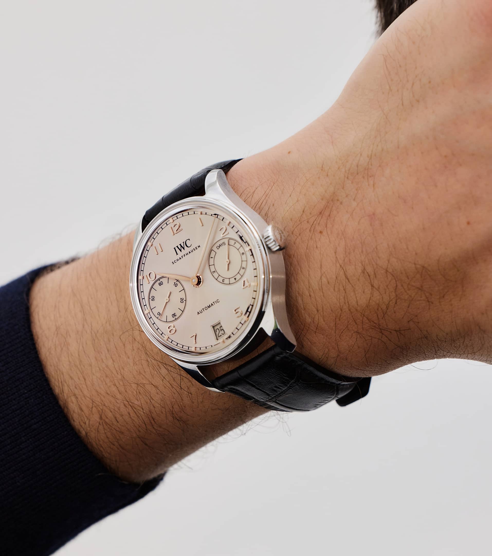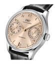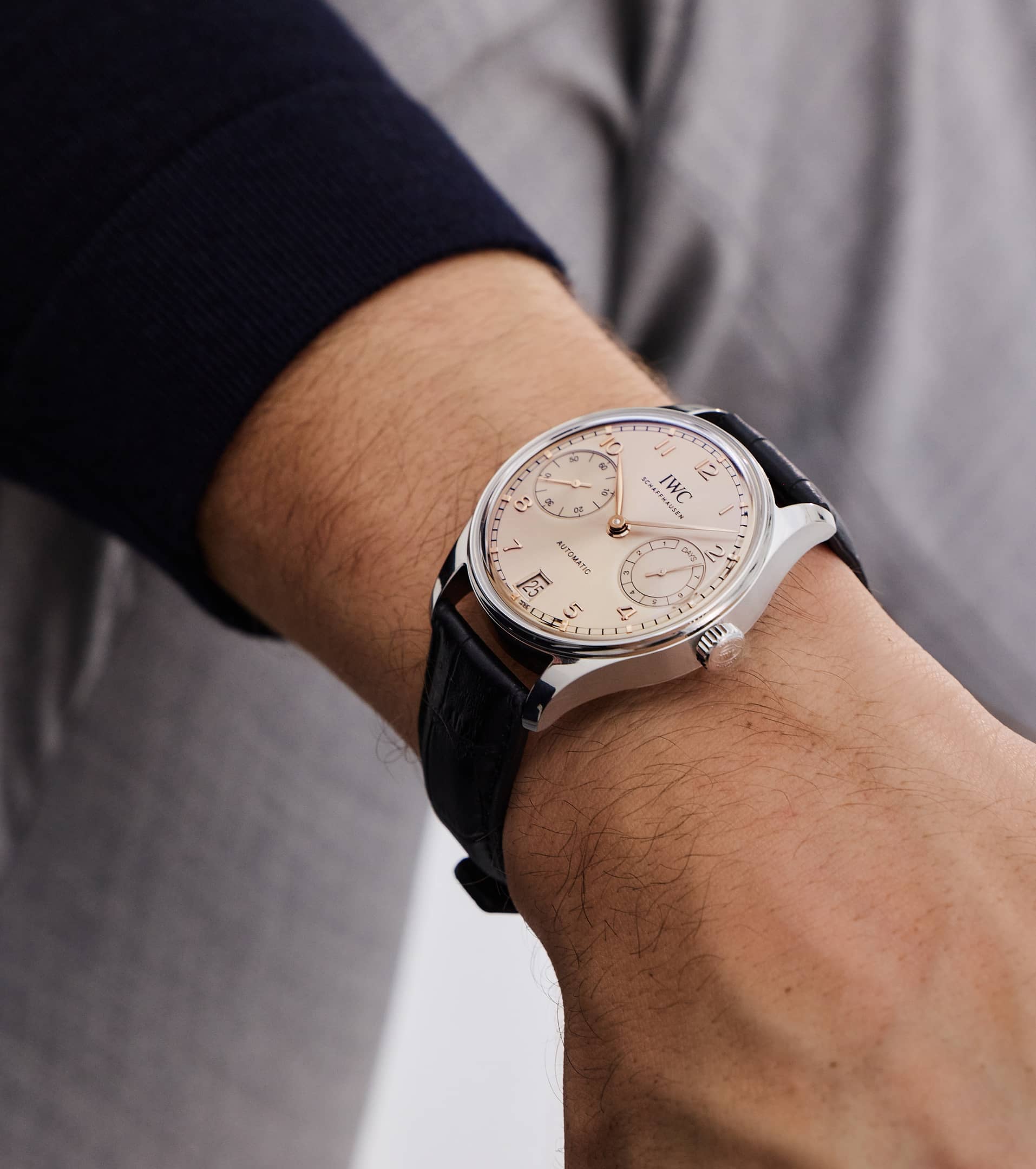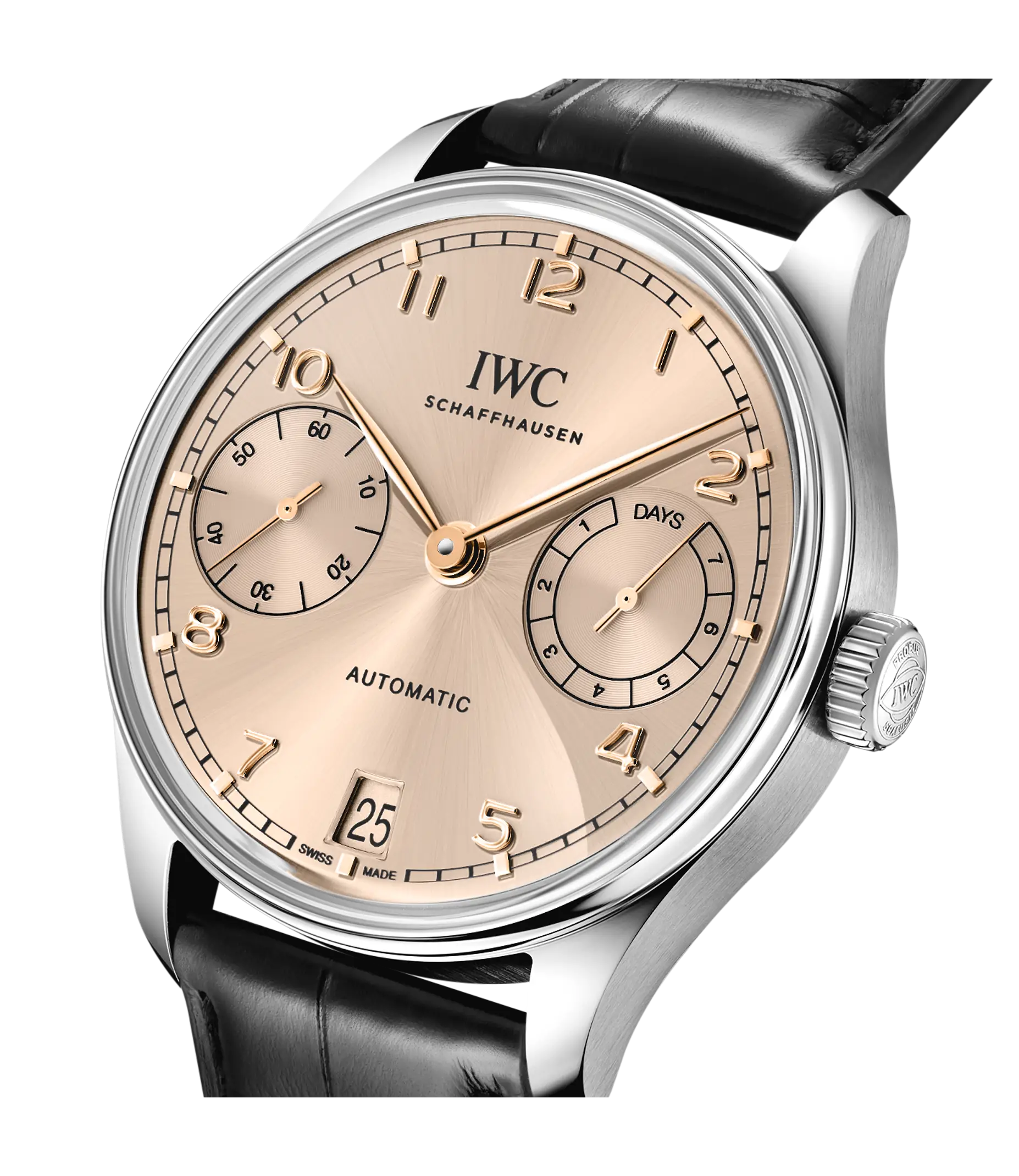 Die Ursprünge der IWC Portugieser reichen in die späten 1930er Jahre zurück, als IWC Schaffhausen ein hochpräzises Taschenuhrwerk verwendete, um eine besonders große Armbanduhr mit Chronometer-Präzision zu schaffen. Die im Jahr 2000 eingeführte Portugieser Automatic 42 präsentiert ein offenes, ausgewogenes Zifferblatt mit einer Gangreserveanzeige um 3 Uhr und einer auf der gegenüberliegenden Seite um 9 Uhr positionierten Sekundenanzeige. Diese Version verfügt über ein Gehäuse Edelstahl mit einem Durchmesser von 42,4mm, ein Zifferblatt in der Farbe Dune, sowie vergoldete Zeiger und Gold-Appliken. Dank einer von Grund auf überarbeiteten Gehäusekonstruktion mit einem dünneren Gehäusering und kastenförmigen Saphirgläsern auf der Vorder- und Rückseite wirkt die Uhr besonders leicht und elegant. Ein Highlight der Uhr ist das aufwändig gefertigte Zifferblatt, das in einem komplexen Herstellungsprozess mit 60 einzelnen Schritten gefertigt wird. Die ungewöhnliche optische Tiefe entsteht durch das Auftragen von 15 Schichten transparenten Lacks, der fein geschliffen und anschließend auf Hochglanz poliert wird. Die Hilfszifferblätter werden sowohl in den Messingrohling als auch in die Lackschicht gefräst. Ein spezielles Druckverfahren verstärkt den dreidimensionalen Effekt. Zum Schluss werden die Appliken einzeln von Hand aufgesetzt. Angetrieben wird die Portugieser Automatic vom IWC-Manufakturkaliber 52011, das aufwändig mit kreisförmigen Genfer Streifen veredelt ist. Der Pellaton-Aufzug ist mit nahezu verschleißfreien Zirkonoxid-Keramikkomponenten verstärkt und baut in zwei Federhäusern eine Gangreserve von sieben Tagen (168 Stunden) auf. Die Uhr ist mit einem blauen Krokolederband mit einer Faltschließe aus Edelstahl ausgestattet.