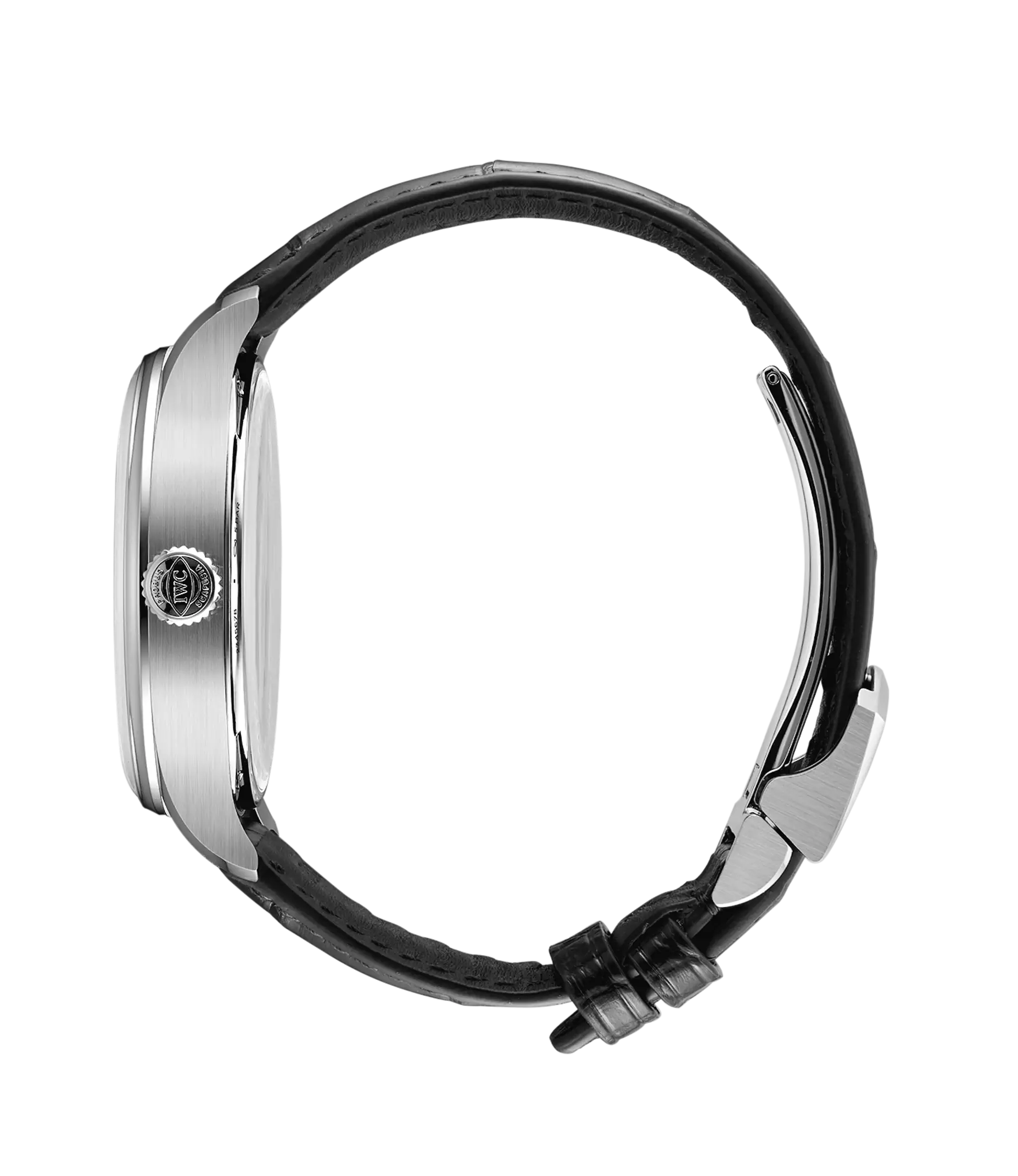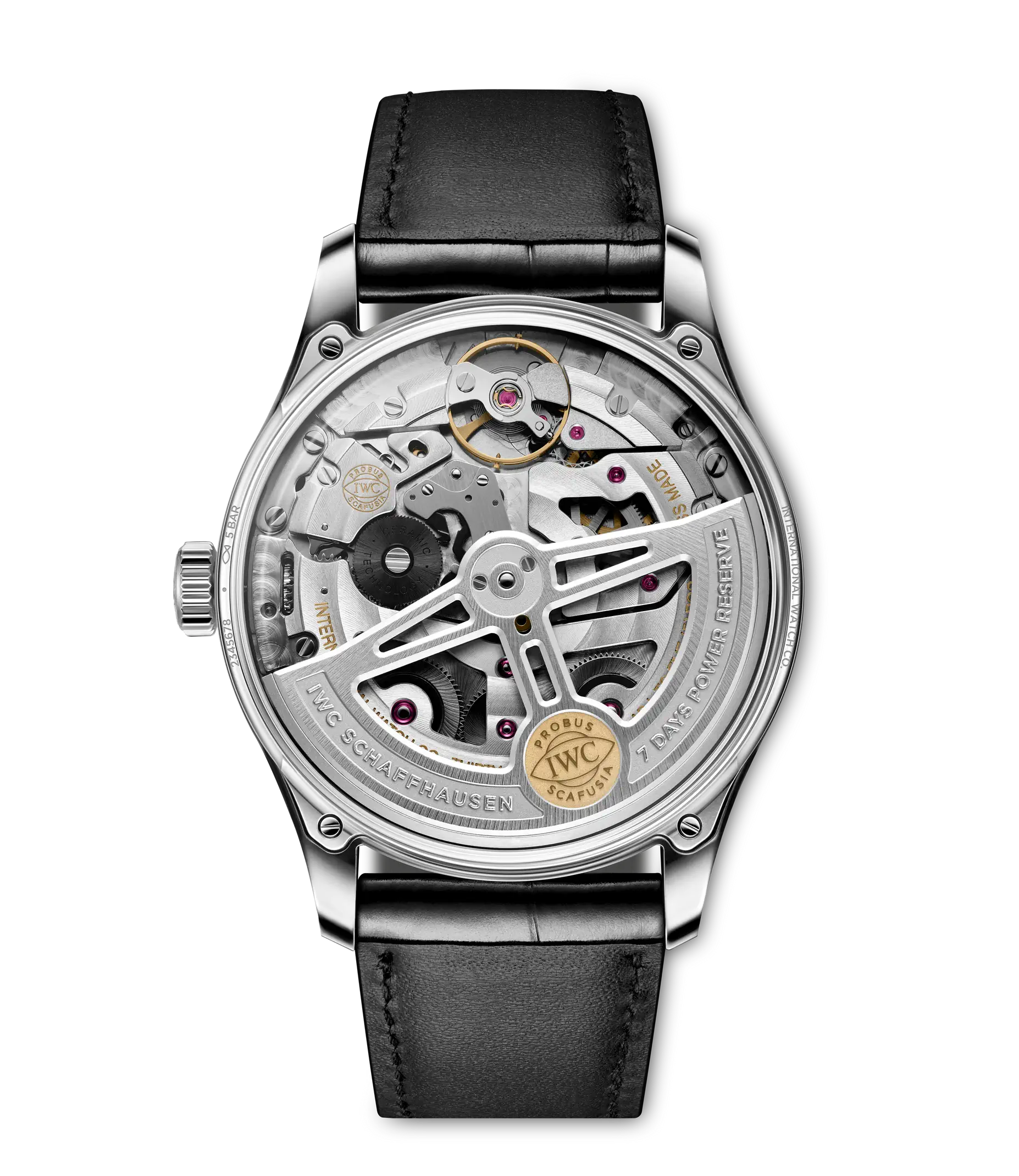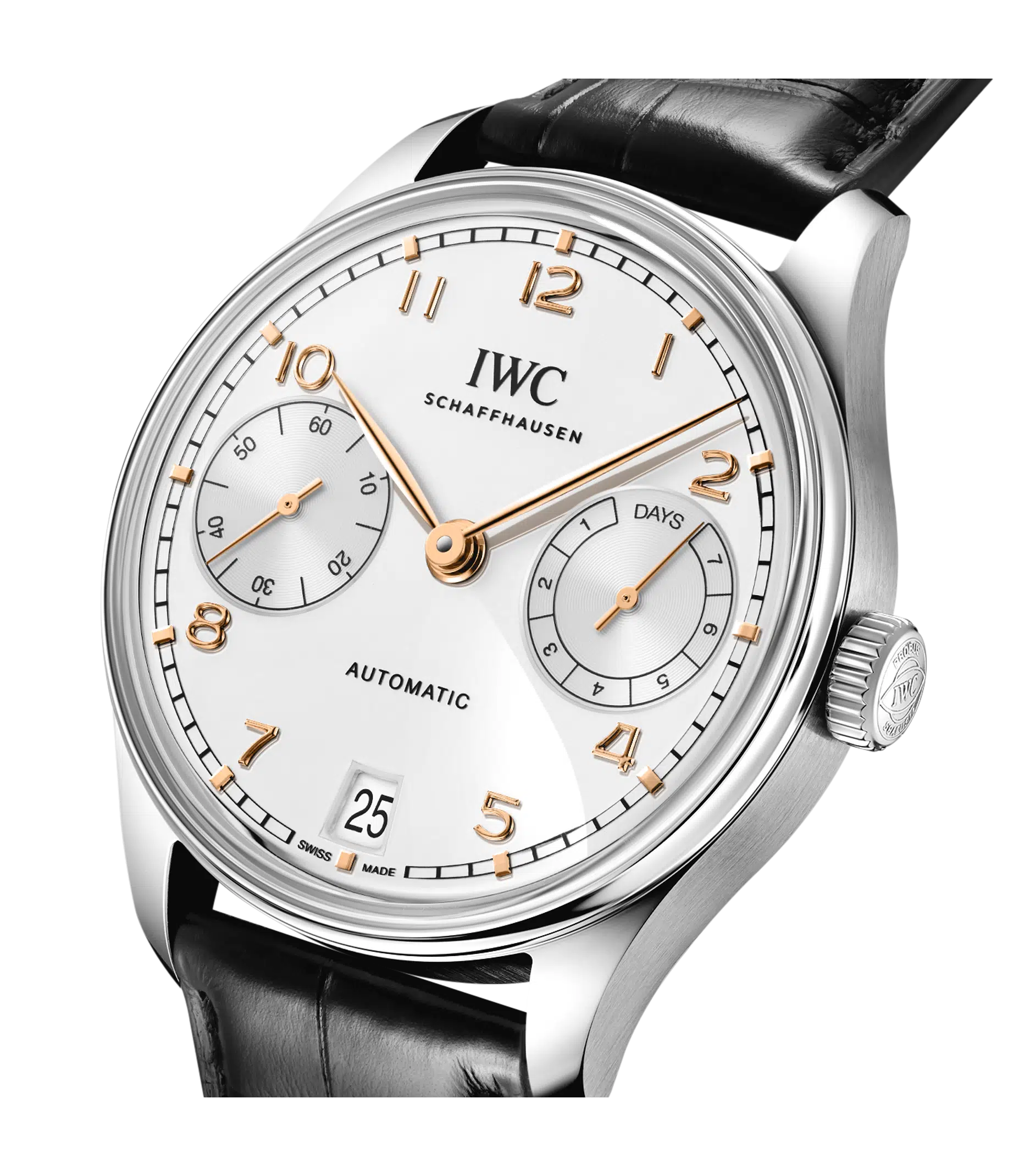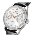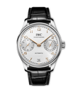 Die Ursprünge der IWC Portugieser reichen in die späten 1930-er Jahre zurück, als IWC Schaffhausen ein hochpräzises Taschenuhrwerk verwendete, um eine besonders große Armbanduhr mit Chronometer-Präzision zu schaffen. Die im Jahr 2000 eingeführte Portugieser Automatic 42 präsentiert ein offenes, ausgewogenes Zifferblatt mit einer Gangreserveanzeige um 3 Uhr und einer auf der gegenüberliegenden Seite um 9 Uhr positionierten Sekundenanzeige. Diese Version verfügt über ein Gehäuse Edelstahl mit einem Durchmesser von 42,4mm, ein argentéfarbenes Zifferblatt, sowie vergoldete Zeiger und Appliken. Dank einer von Grund auf überarbeiteten Gehäusekonstruktion mit einem dünneren Gehäusering und kastenförmigen Saphirgläsern auf der Vorder- und Rückseite wirkt die Uhr besonders leicht und elegant. Ein Highlight der Uhr ist das aufwendig gefertigte Zifferblatt, das in einem komplexen Herstellungsprozess mit 60 einzelnen Schritten gefertigt wird. Die ungewöhnliche optische Tiefe entsteht durch das Auftragen von 15 Schichten transparenten Lacks, der fein geschliffen und anschließend auf Hochglanz poliert wird. Die Hilfszifferblätter werden sowohl in den Messingrohling als auch in die Lackschicht gefräst. Ein spezielles Druckverfahren verstärkt den dreidimensionalen Effekt. Zum Schluss werden die Appliken einzeln von Hand aufgesetzt. Angetrieben wird die Portugieser Automatic vom IWC-Manufakturkaliber 52011, das aufwändig mit kreisförmigen Genfer Streifen veredelt ist. Der Pellaton-Aufzug ist mit nahezu verschleißfreien Zirkonoxid-Keramikkomponenten verstärkt und baut in zwei Federhäusern eine Gangreserve von sieben Tagen (168 Stunden) auf. Die Uhr ist mit einem schwarzen Krokolederband mit einer Faltschließe aus Edelstahl ausgestattet.