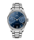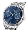 Die Ursprünge der IWC Portugieser reichen in die späten 1930-er Jahre zurück, als IWC Schaffhausen ein hochpräzises Taschenuhrwerk verwendete, um eine besonders große Armbanduhr mit Chronometer-Präzision zu schaffen. Die im Jahr 2000 eingeführte Portugieser Automatic 42 präsentiert ein offenes, ausgewogenes Zifferblatt mit einer Gangreserveanzeige um 3 Uhr und einer auf der gegenüberliegenden Seite um 9 Uhr positionierten Sekundenanzeige. Diese Version verfügt über ein Gehäuse Edelstahl mit einem Durchmesser von 42,4mm, ein blaues Zifferblatt, sowie rhodinierte Zeiger und Appliken. Dank einer von Grund auf überarbeiteten Gehäusekonstruktion mit einem dünneren Gehäusering und kastenförmigen Saphirgläsern auf der Vorder- und Rückseite wirkt die Uhr besonders leicht und elegant. Ein Highlight der Uhr ist das aufwändig gefertigte Zifferblatt, das in einem komplexen Herstellungsprozess mit 60 einzelnen Schritten gefertigt wird. Die ungewöhnliche optische Tiefe entsteht durch das Auftragen von 15 Schichten transparenten Lacks, der fein geschliffen und anschließend auf Hochglanz poliert wird. Die Hilfszifferblätter werden sowohl in den Messingrohling als auch in die Lackschicht gefräst. Ein spezielles Druckverfahren verstärkt den dreidimensionalen Effekt. Zum Schluss werden die Appliken einzeln von Hand aufgesetzt. Angetrieben wird die Portugieser Automatic vom IWC-Manufakturkaliber 52011, das aufwändig mit kreisförmigen Genfer Streifen veredelt ist. Der Pellaton-Aufzug ist mit nahezu verschleißfreien Zirkonoxid-Keramikkomponenten verstärkt und baut in zwei Federhäusern eine Gangreserve von sieben Tagen (168 Stunden) auf. Die Uhr ist mit einem Edelstahlband ausgestattet.