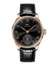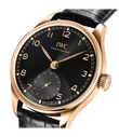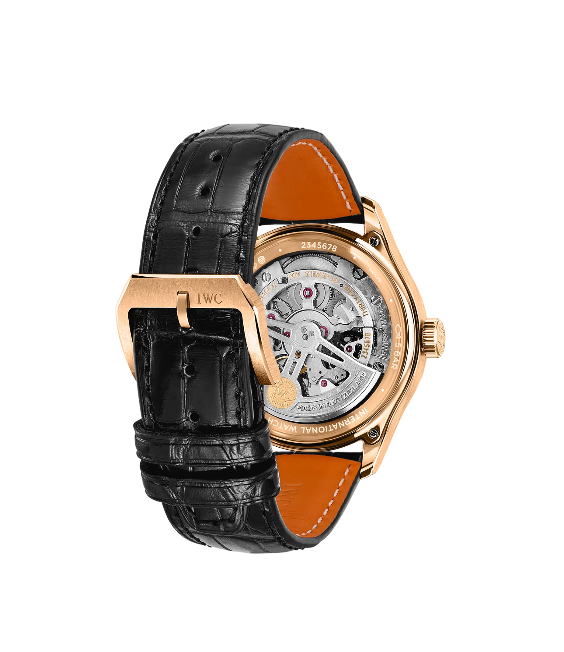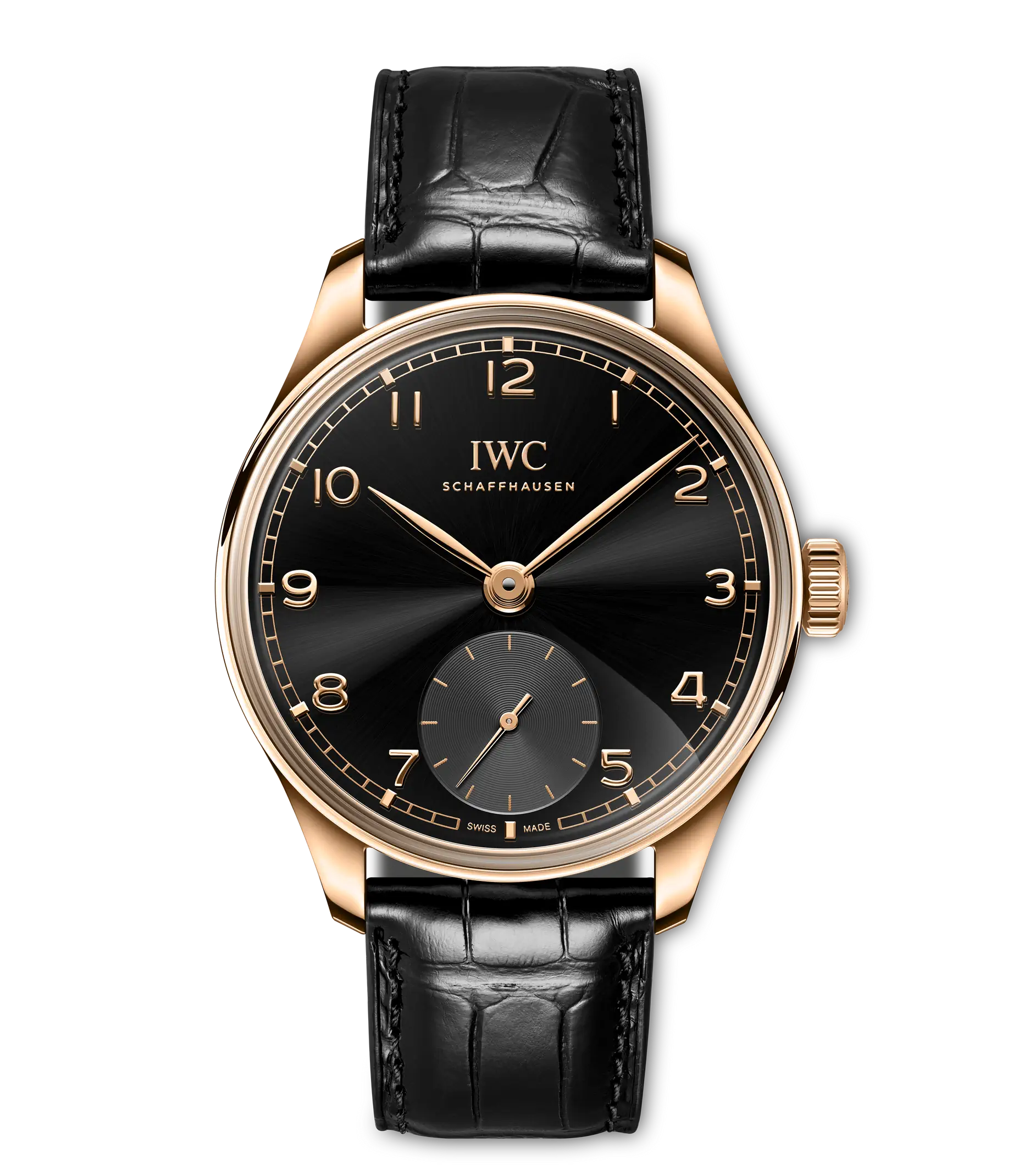 Die 2020 erstmals in die Kollektion aufgenommene Portugieser Automatic 40 präsentiert das charakteristische Portugieser-Design mit einer kompakteren Gehäusegröße von 40mm. In Anlehnung an die erste Portugieser von 1939 hat sie ein klares und offenes Zifferblatt mit der kleinen Sekunde bei 6 Uhr. Diese Version verfügt über ein Gehäuse aus 18 Karat Rotgold mit einem Durchmesser von 40,4mm, ein Zifferblatt in der Farbe Obsidian sowie vergoldete Zeiger und Appliken aus Gold. Dank einer von Grund auf überarbeiteten Gehäusekonstruktion mit einem dünneren Gehäusering und kastenförmigen Saphirgläsern auf der Vorder- und Rückseite wirkt die Uhr besonders leicht und elegant. Ein Highlight der Uhr ist das aufwändig gefertigte Zifferblatt, das in einem komplexen Herstellungsprozess mit 60 einzelnen Schritten gefertigt wird. Die ungewöhnliche optische Tiefe entsteht durch das Auftragen von 15 Schichten transparenten Lacks, der fein geschliffen und anschließend auf Hochglanz poliert wird. Das Hilfszifferblatt wird sowohl in den Messing-Rohling als auch in die Lackschicht gefräst. Ein spezielles Druckverfahren verstärkt den dreidimensionalen Effekt. Zum Schluss werden die Appliken einzeln von Hand aufgesetzt. Angetrieben wird die Portugieser Automatic vom Manufakturkaliber 82200. Der automatische Pellaton-Aufzug mit Teilen aus Zirkonoxid-Keramik baut in der Aufzugsfeder eine Gangreserve von 60 Stunden auf. Die Uhr ist mit einem schwarzen Krokolederband von Santoni mit einer Dornschließe aus 18 Karat Rotgold ausgestattet.