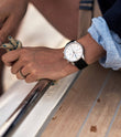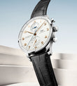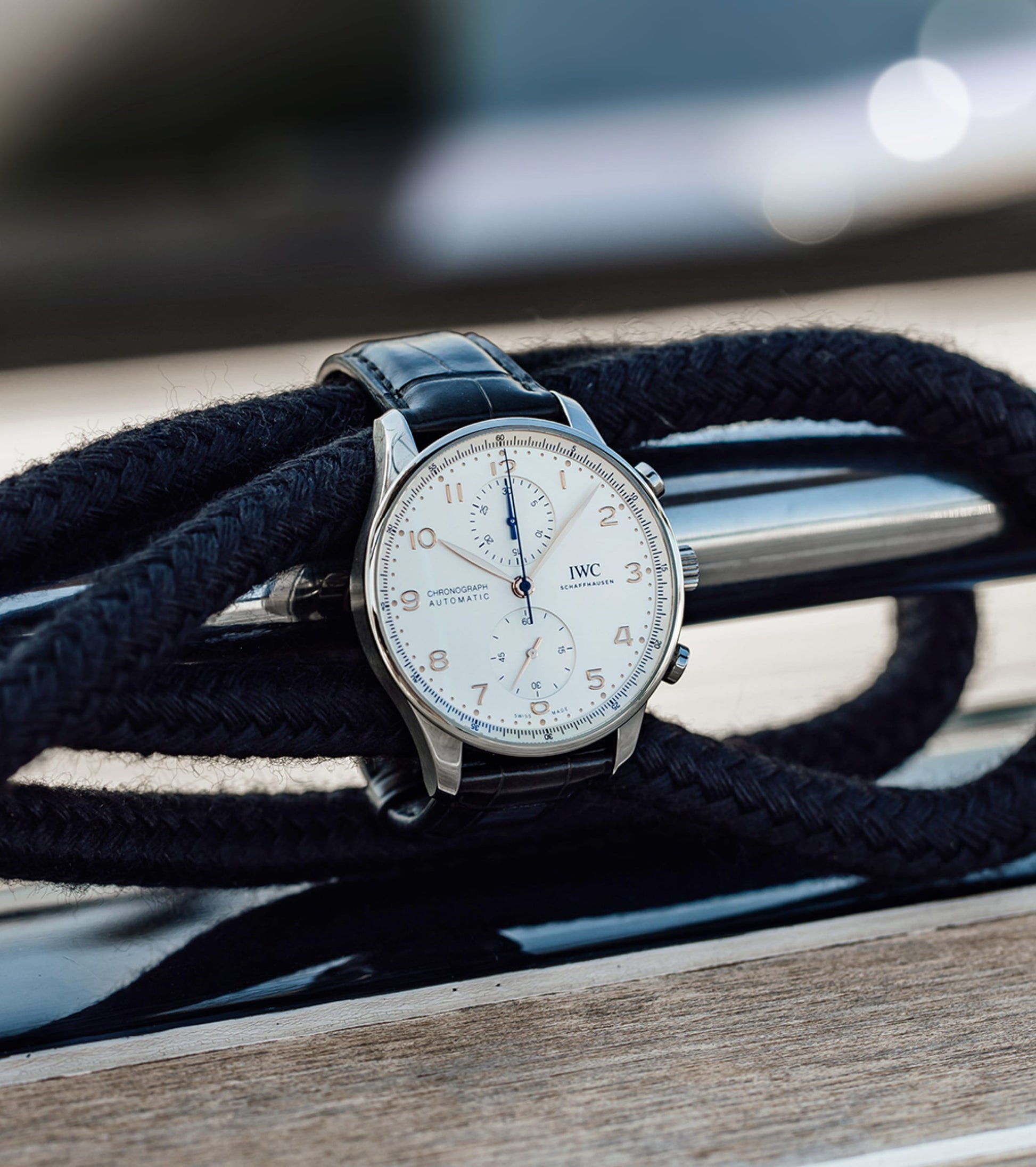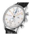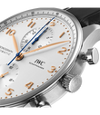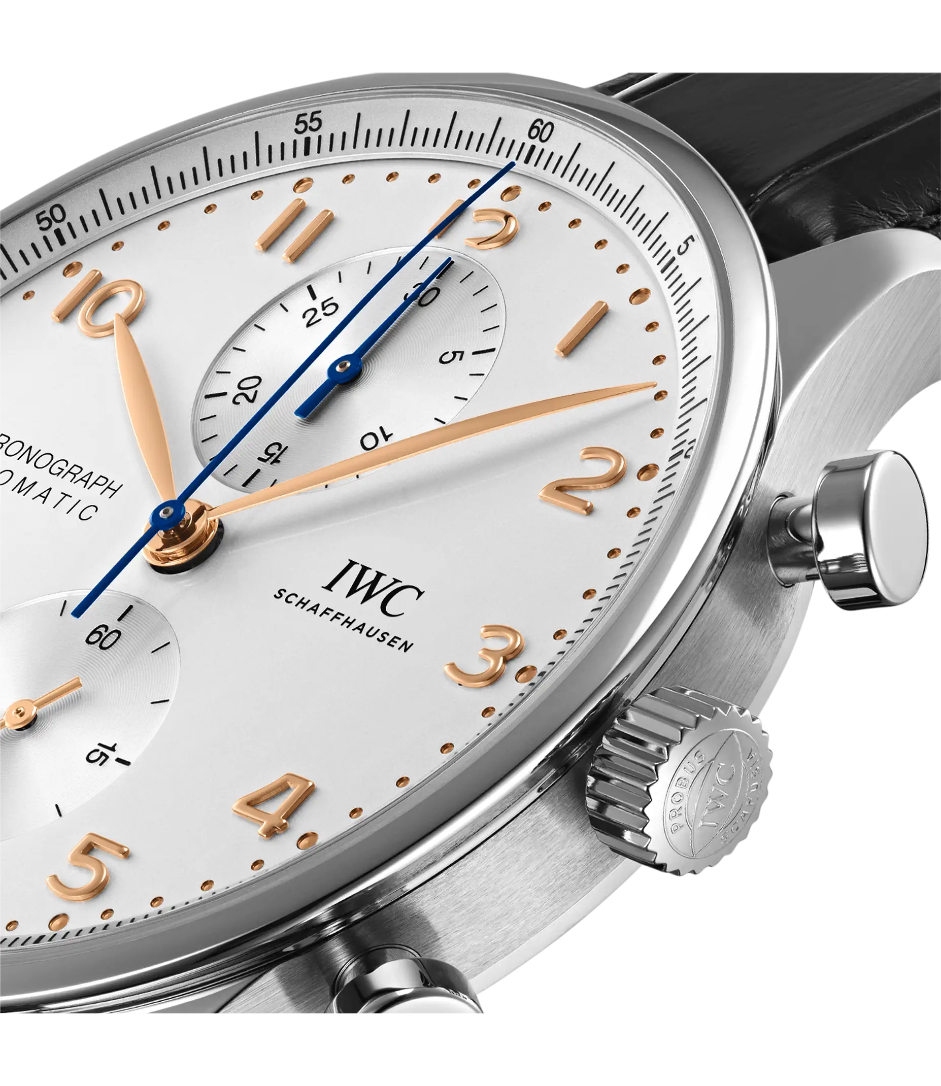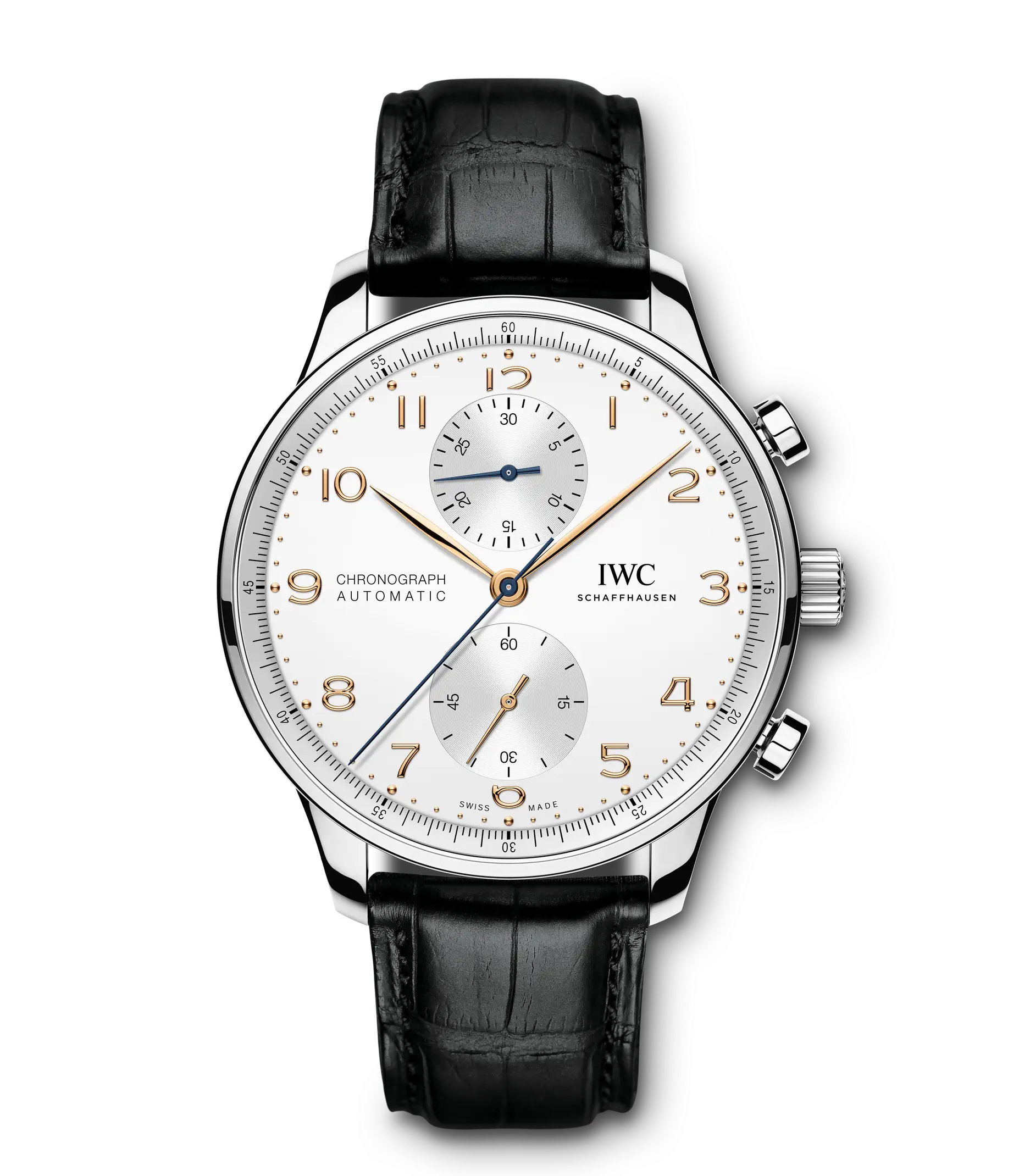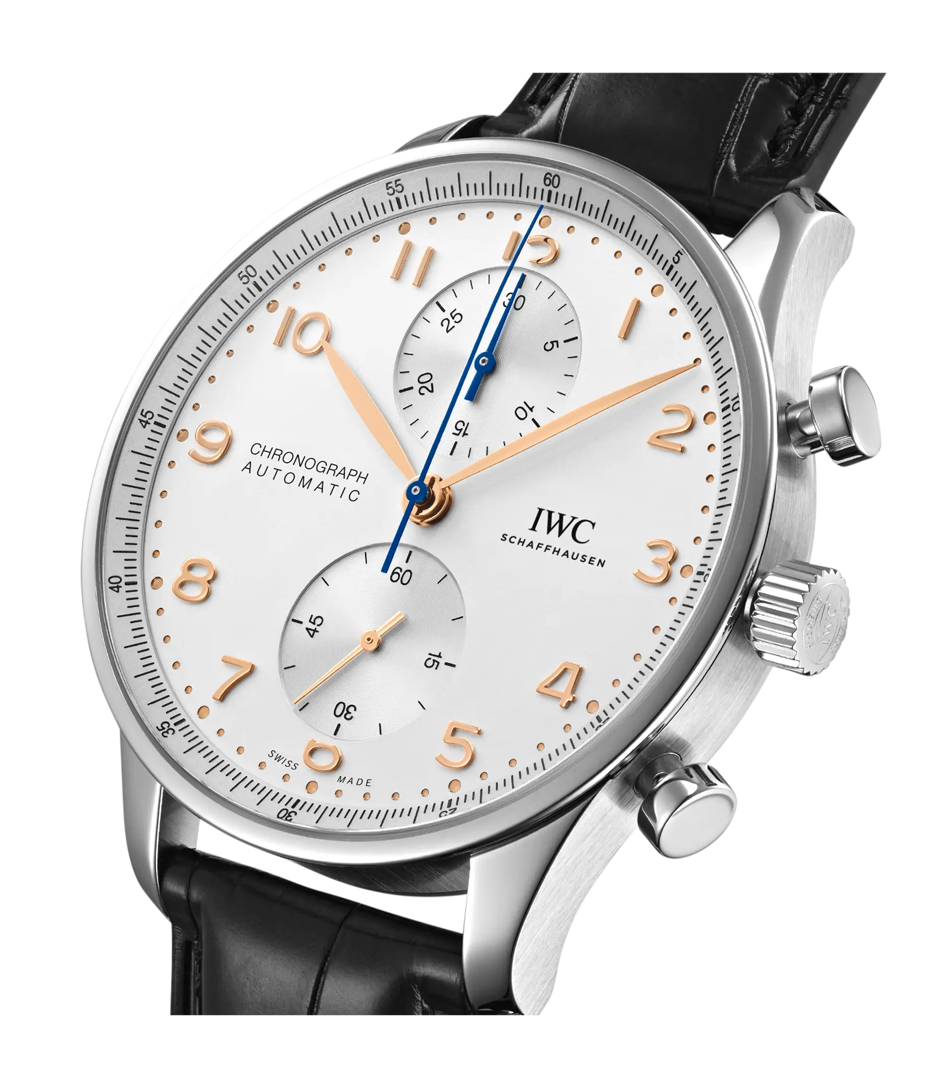 Der Portugieser Chronograph ist eines der ikonischsten Modelle von IWC Schaffhausen. Die harmonisch gestaltete Uhr mit umlaufender Präzisionsskala und vertieften Totalisatoren ist seit 1998 das begehrteste Mitglied der Portugieser-Familie. Mit seinem kompakten Durchmesser von 41mm passt der Chronograph an fast jedes Handgelenk. Durch die filigrane Lünette entsteht der Eindruck, als würde man eine bedeutend größere Uhr tragen. Das klare, funktionale Zifferblatt besticht mit applizierten arabischen Zahlen und schlanken Feuille-Zeigern. Der charakteristische, mit einer Viertelsekundenskala bedruckte Rehaut ermöglicht nicht nur ein präzises Ablesen der Stoppzeit, sondern erinnert auch an den Ursprung der Portugieser als nautisches Präzisionsinstrument für das Handgelenk. Dieses Modell verfügt über ein Gehäuse aus Edelstahl, ein argentéfarbenes Zifferblatt sowie goldene Zeiger und Appliken. Es wird an einem schwarzen Krokolederband getragen. Im Inneren des sportlich-eleganten Chronographen arbeitet das IWC-Manufakturkaliber 69355. Das robuste und präzise Chronographenwerk in klassischer Kolonnenradbauweise lässt sich durch einen Sichtboden aus Saphirglas betrachten.