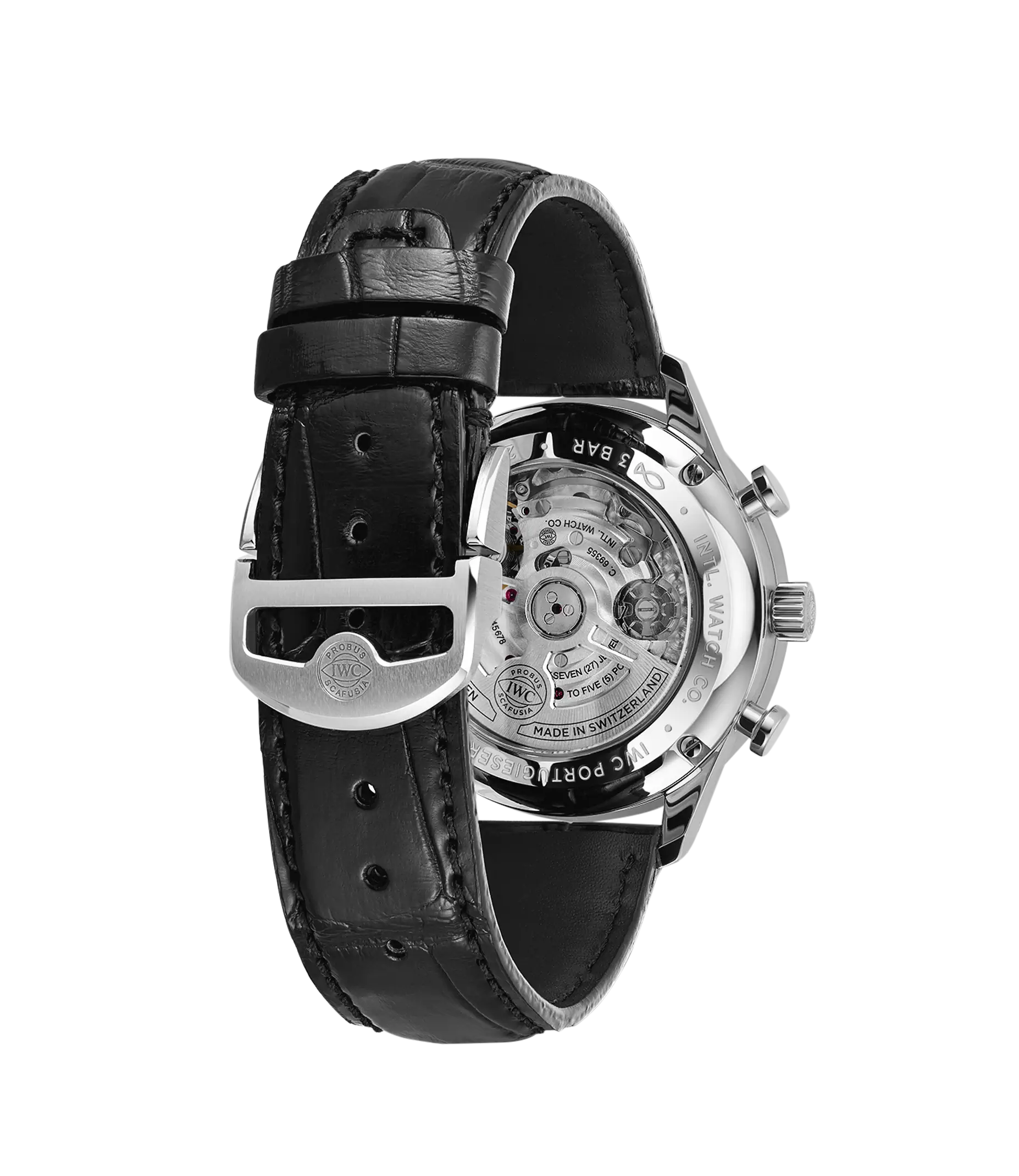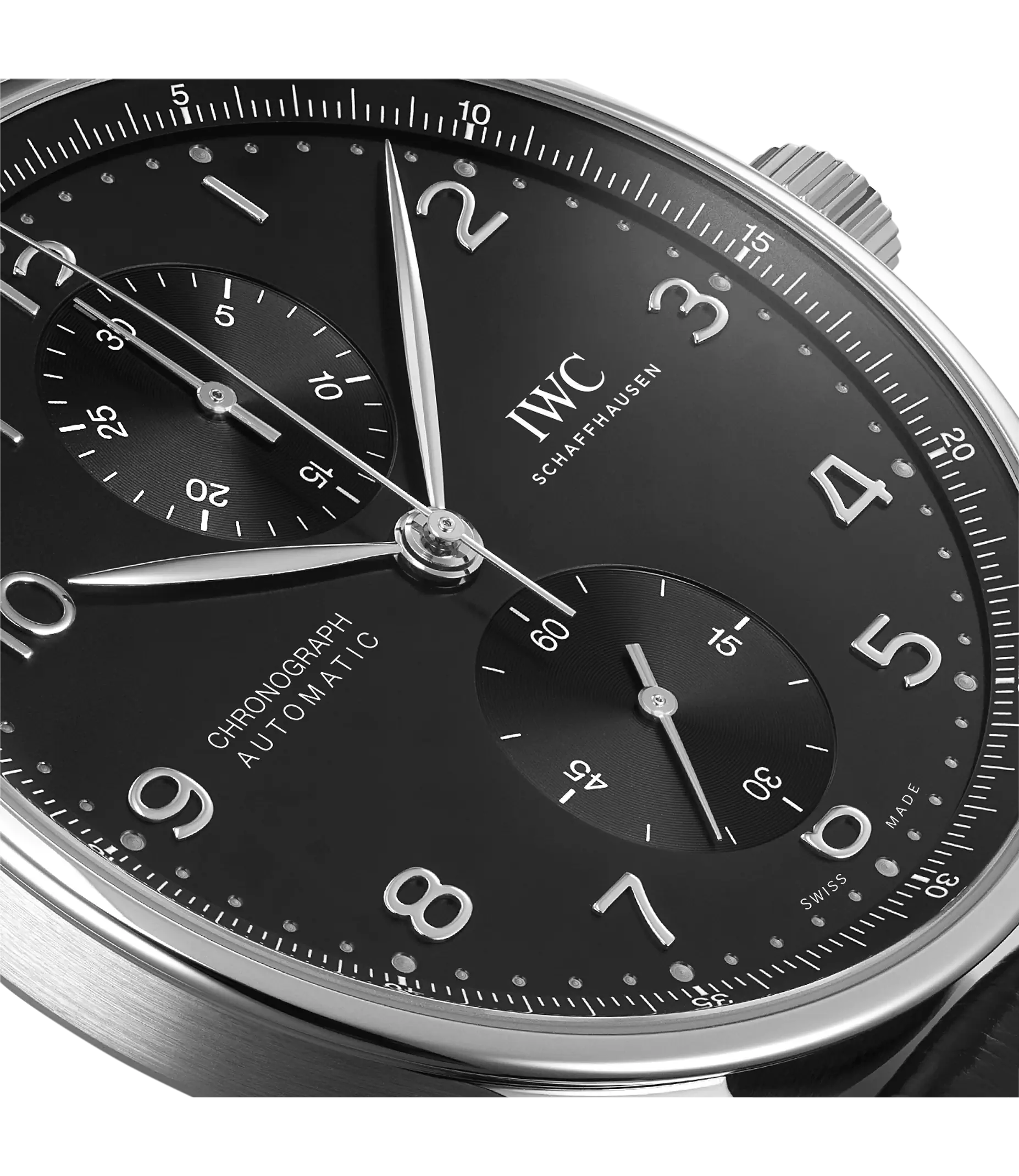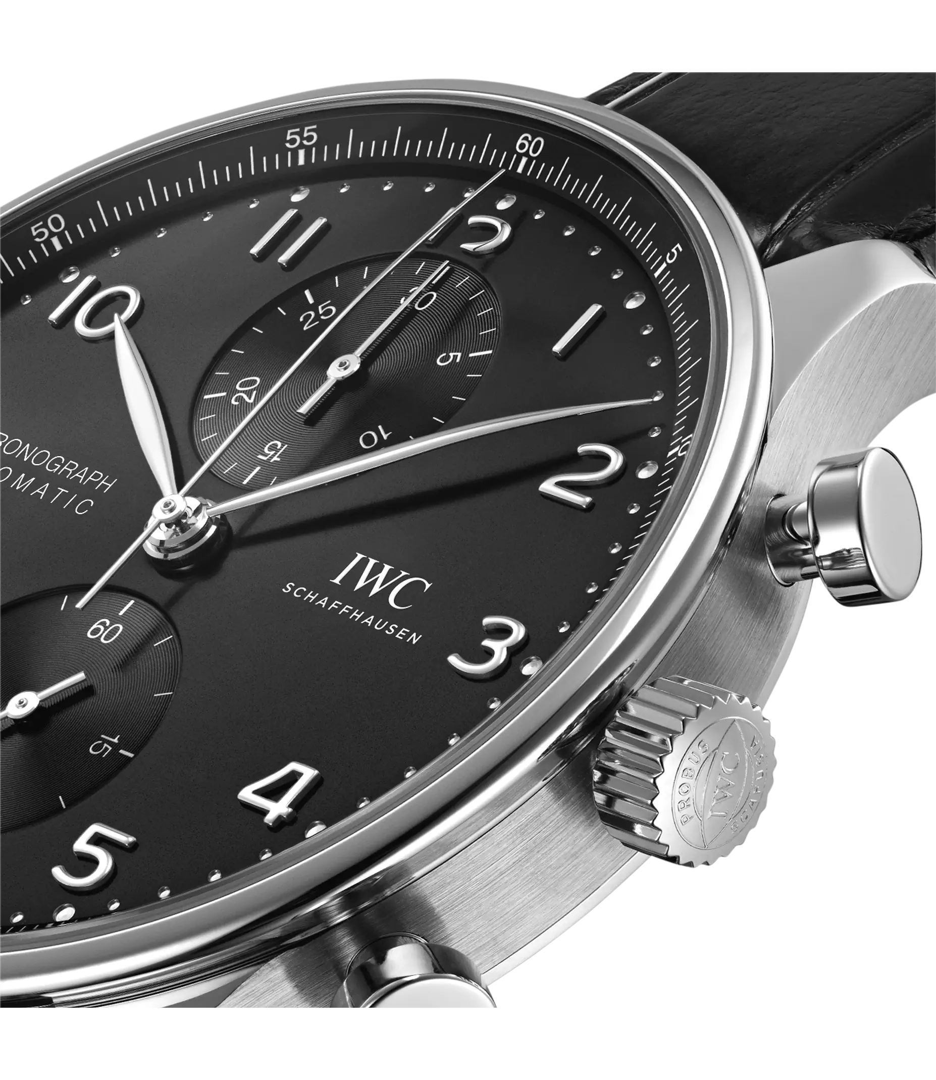 Der Portugieser Chronograph ist eines der ikonischsten Modelle von IWC Schaffhausen. Die harmonisch gestaltete Uhr mit umlaufender Präzisionsskala und vertieften Totalisatoren ist seit 1998 das begehrteste Mitglied der Portugieser-Familie. Mit seinem kompakten Durchmesser von 41mm passt der Chronograph an fast jedes Handgelenk. Durch die filigrane Lünette entsteht der Eindruck, als würde man eine bedeutend größere Uhr tragen. Das klare, funktionale Zifferblatt besticht mit applizierten arabischen Zahlen und schlanken Feuille-Zeigern. Der charakteristische, mit einer Viertelsekundenskala bedruckte Rehaut ermöglicht nicht nur ein präzises Ablesen der Stoppzeit, sondern erinnert auch an den Ursprung der Portugieser als nautisches Präzisionsinstrument für das Handgelenk. Dieses Modell verfügt über ein Gehäuse aus Edelstahl, ein schwarzes Zifferblatt sowie rhodinierte Zeiger und Appliken. Es wird an einem schwarzen Krokolederband getragen. Im Inneren des sportlich-eleganten Chronographen arbeitet das IWC-Manufakturkaliber 69355. Das robuste und präzise Chronographenwerk in klassischer Kolonnenradbauweise lässt sich durch einen Sichtboden aus Saphirglas betrachten.