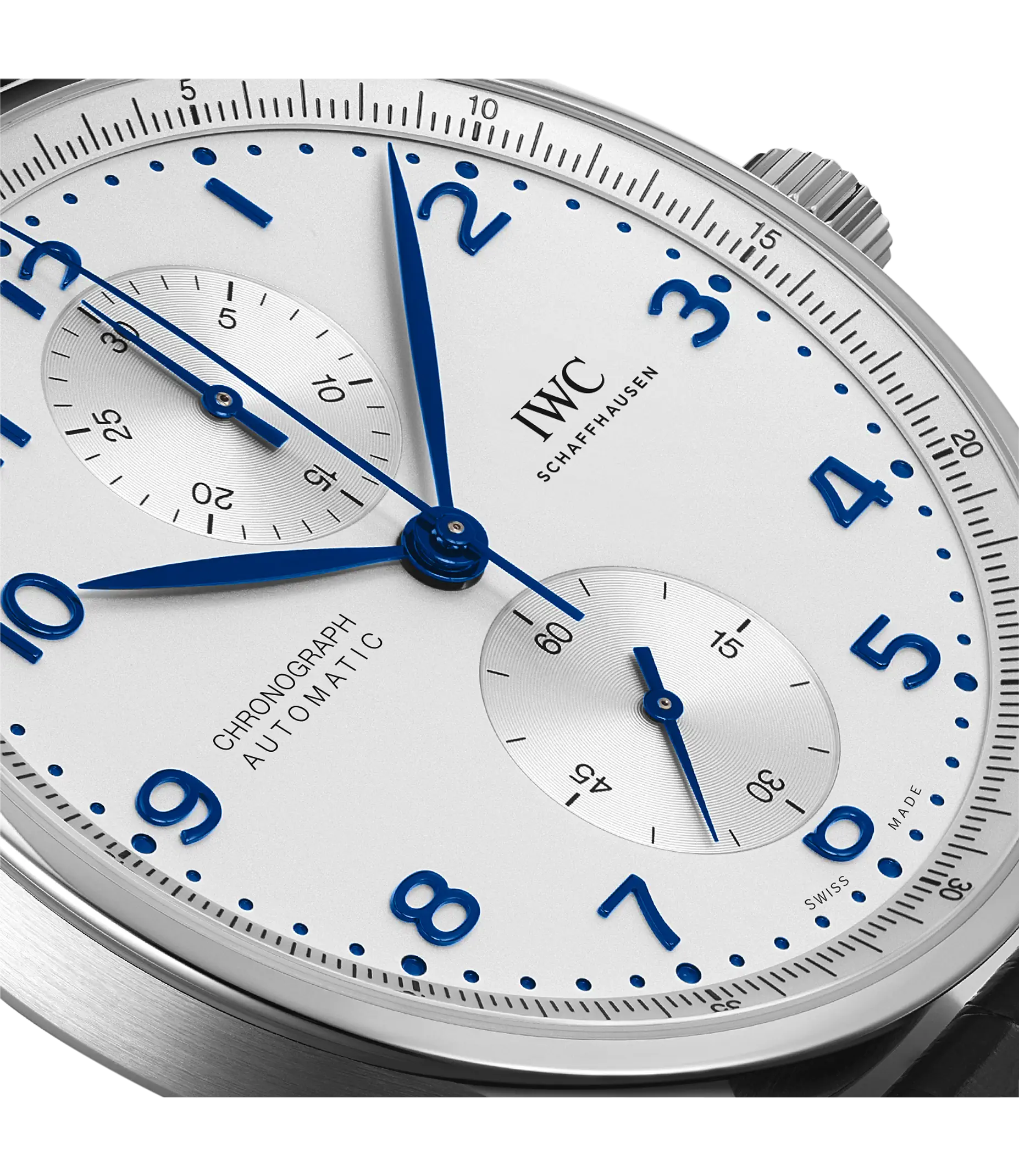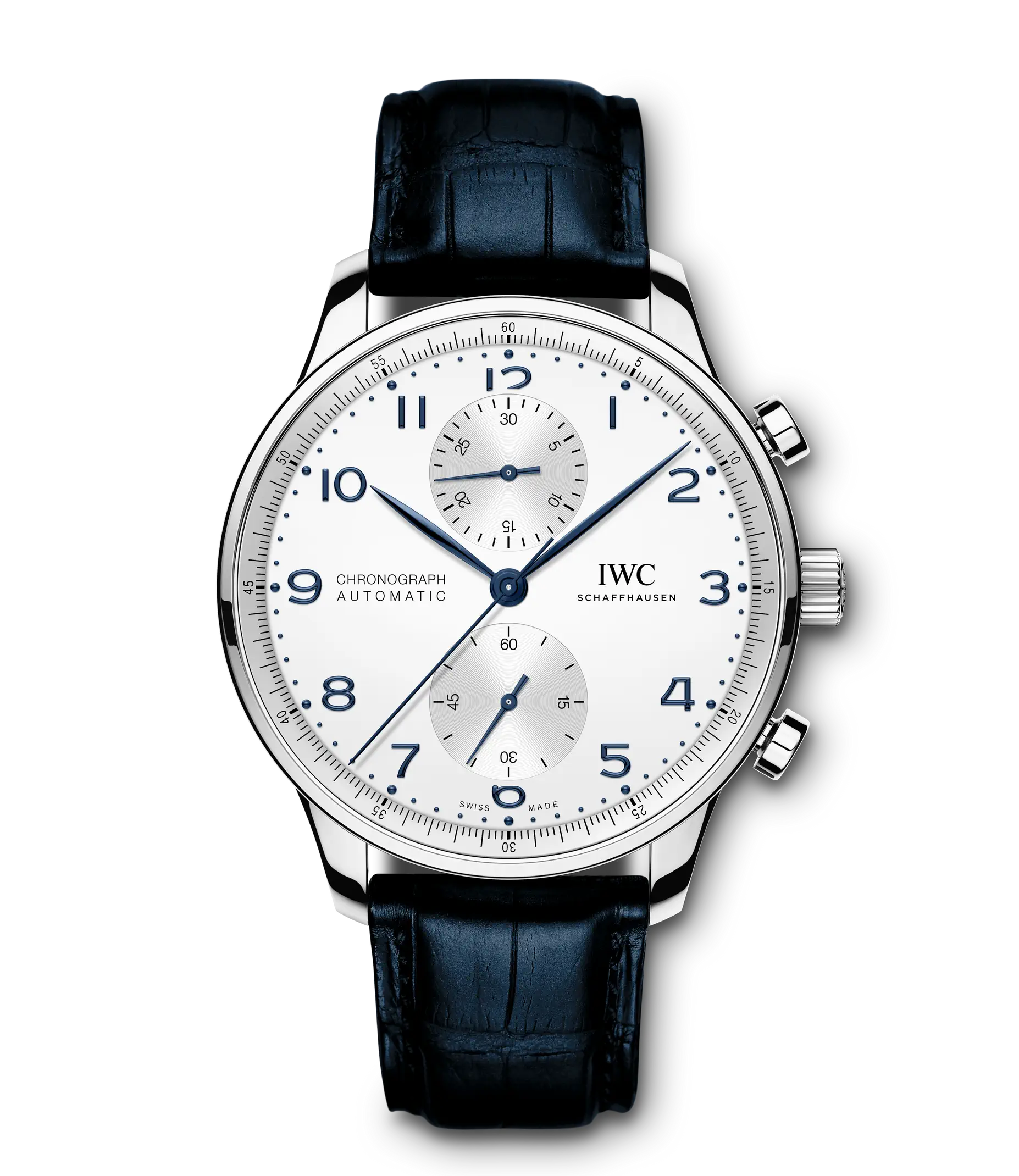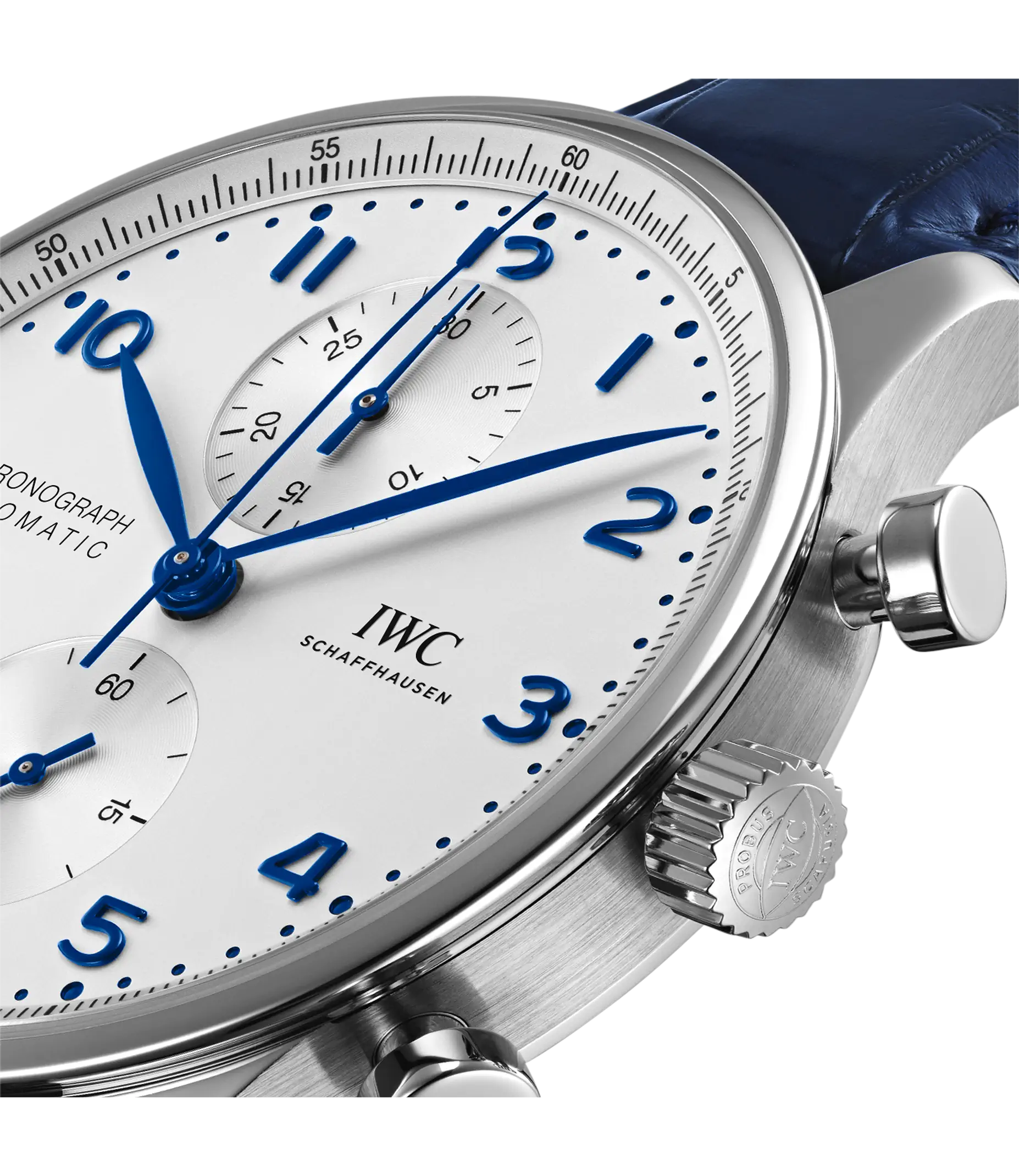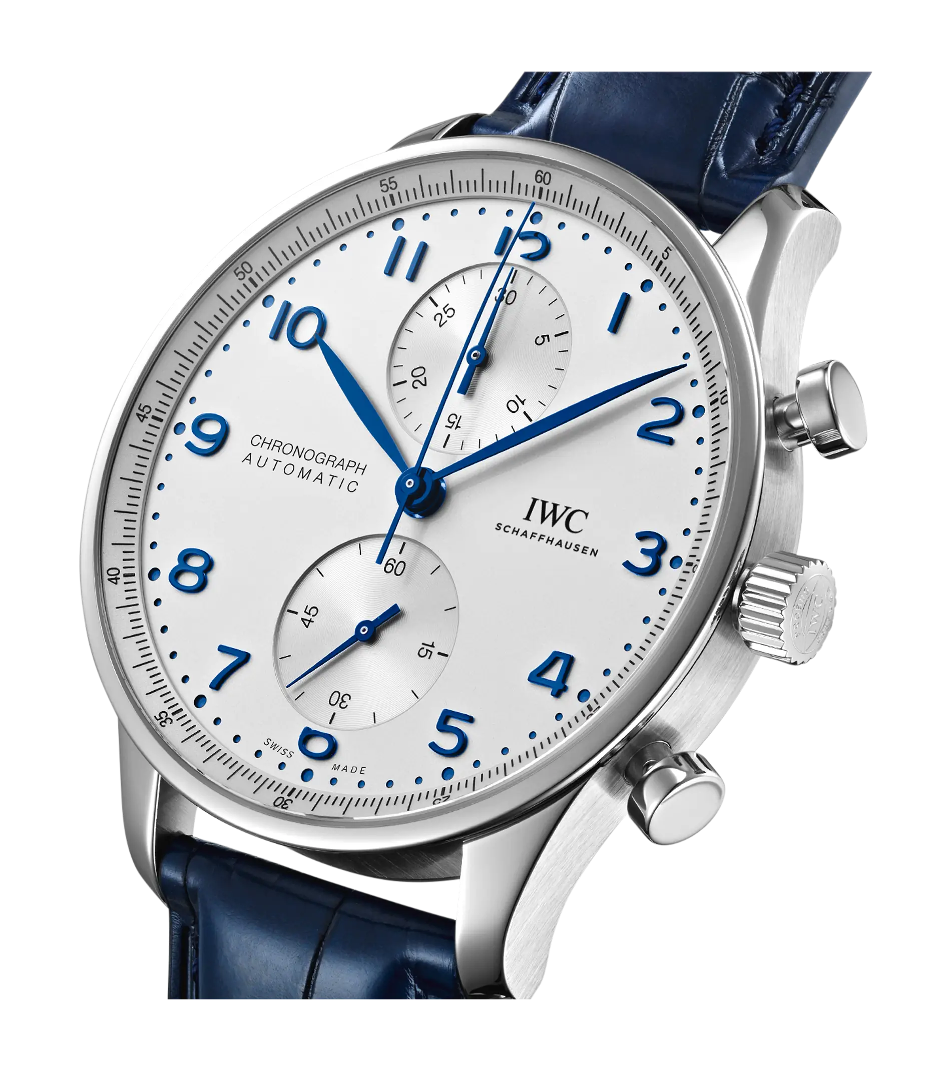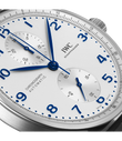 Der Portugieser Chronograph ist eines der ikonischsten Modelle von IWC Schaffhausen. Die harmonisch gestaltete Uhr mit umlaufender Präzisionsskala und vertieften Totalisatoren ist seit 1998 das begehrteste Mitglied der Portugieser-Familie. Mit seinem kompakten Durchmesser von 41mm passt der Chronograph an fast jedes Handgelenk. Durch die filigrane Lünette entsteht der Eindruck, als würde man eine bedeutend größere Uhr tragen. Das klare, funktionale Zifferblatt besticht mit applizierten arabischen Zahlen und schlanken Feuille-Zeigern. Der charakteristische, mit einer Viertelsekundenskala bedruckte Rehaut ermöglicht nicht nur ein präzises Ablesen der Stoppzeit, sondern erinnert auch an den Ursprung der Portugieser als nautisches Präzisionsinstrument für das Handgelenk. Dieses Modell verfügt über ein Gehäuse aus Edelstahl, ein argentéfarbenes Zifferblatt sowie blaue Zeiger und Appliken. Es wird an einem duneklblauen Krokolederband getragen. Im Inneren des sportlich-eleganten Chronographen arbeitet das IWC-Manufakturkaliber 69355. Das robuste und präzise Chronographenwerk in klassischer Kolonnenradbauweise lässt sich durch einen Sichtboden aus Saphirglas betrachten.