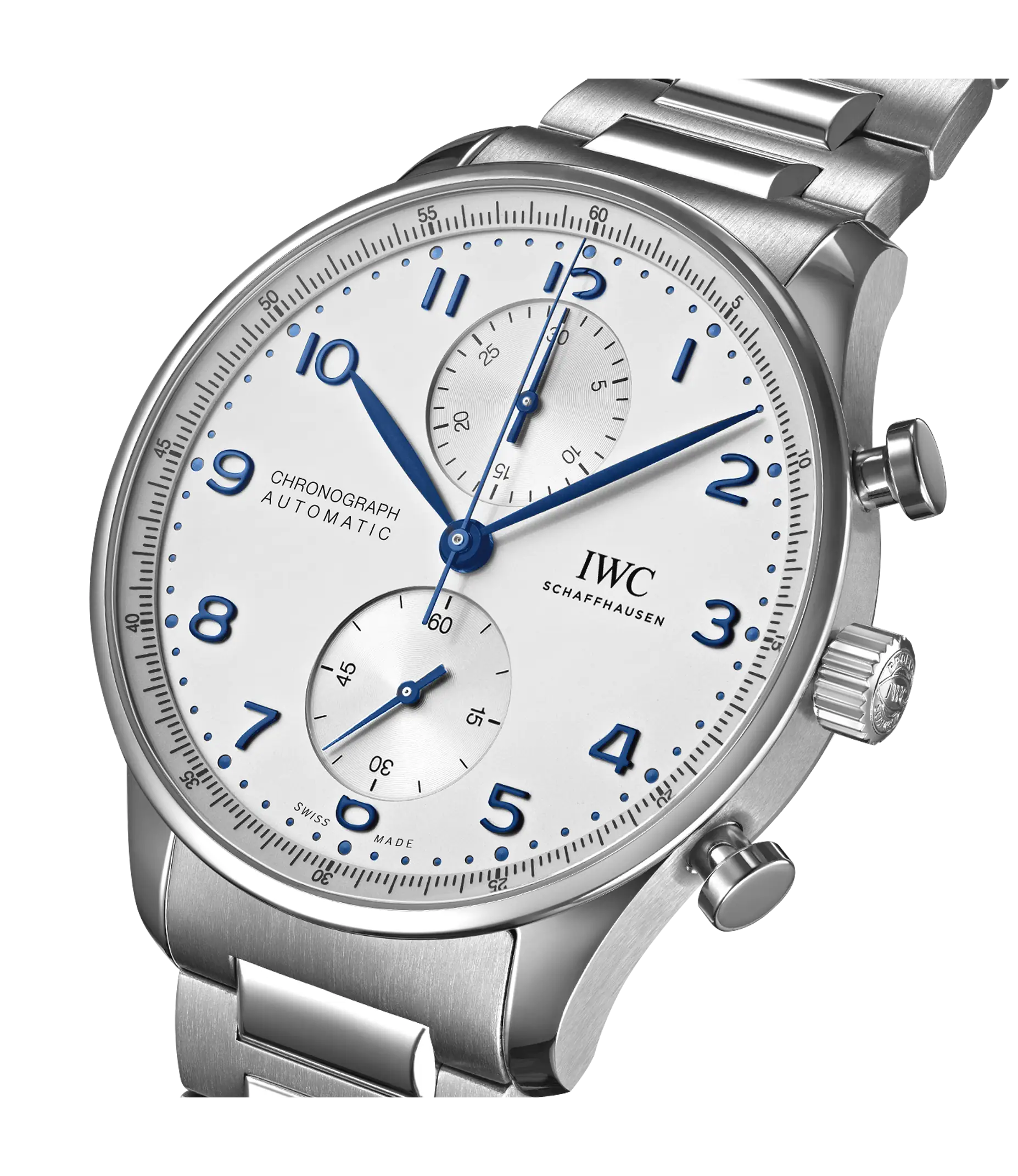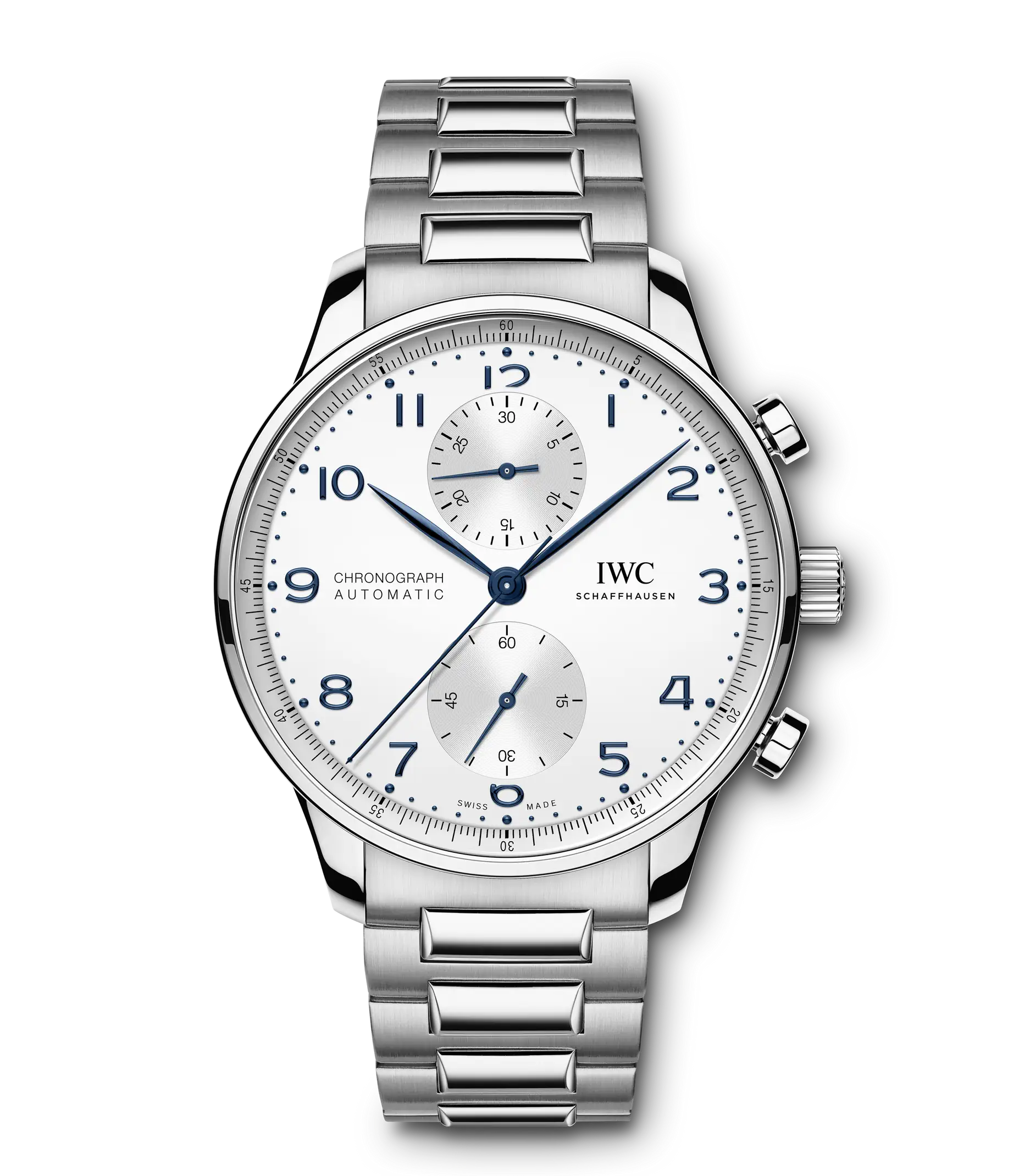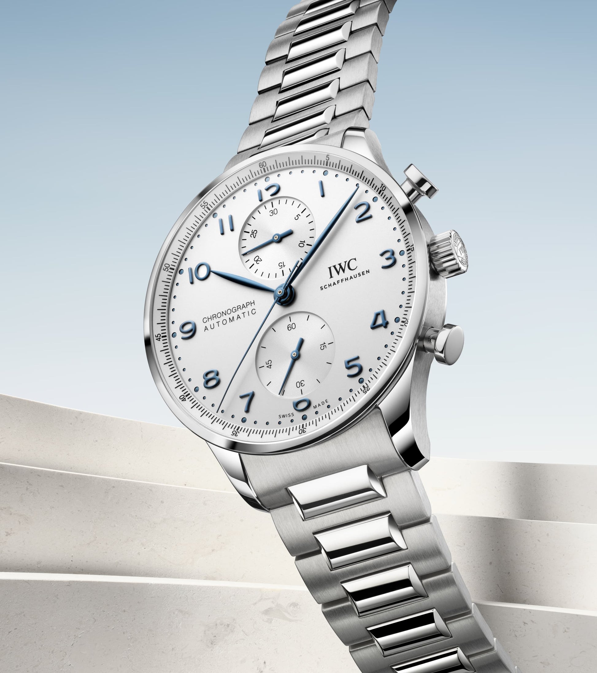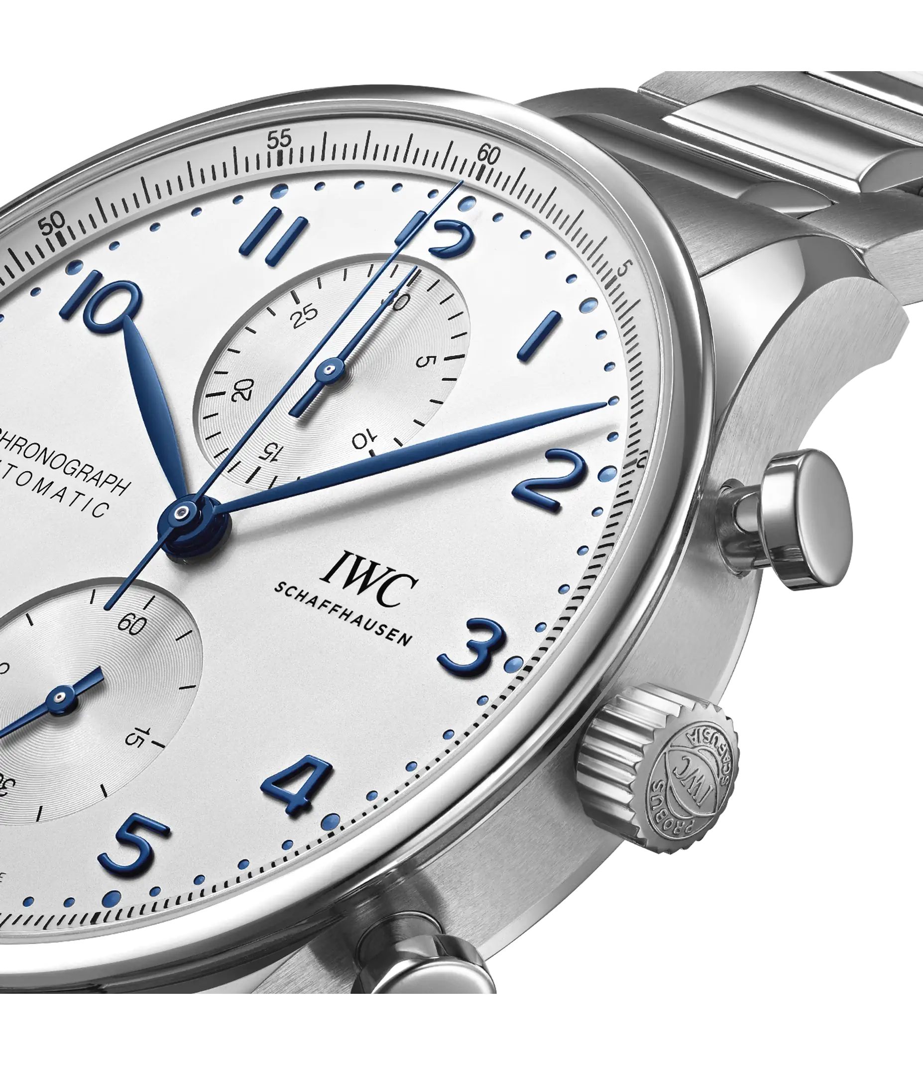 Zum ersten Mal präsentiert IWC die Portugieser Chronograph an einem Edelstahlarmband für einen ergonomischen Sitz am Handgelenk. Ein klares, offenes Zifferblatt mit zwei vertieften Totalisatoren sowie dem mit einer Viertelsekundenskala bedruckte Réhaut: Das ist die Erfolgsformel der Portugieser Chronograph, mit der IWC vor über 20 Jahren eine sportlichere Designvariante in der Portugieser-Familie etabliert hat. Jetzt ist der zeitlos moderne Chronograph zum ersten Mal mit einem Armband aus Edelstahl erhältlich. Es ist wunderschön detailliert und wurde aufwändig mit polierten und satinierten Oberflächen veredelt. Dank der Doppel-Faltschließe sitzt es ergonomisch am Handgelenk und bietet einen ausgezeichneten Tragekomfort. Mit dem robusten und korrosionsbeständigen Edelstahlband wird die Portugieser Chronograph zu einer noch vielseitigeren Begleiterin. Dieses Modell verfügt über ein Gehäuse aus Edelstahl, ein argentéfarbenes Zifferblatt sowie blaue Zeiger und Appliken. Im Inneren arbeitet das IWC-Manufakturkaliber 69355. Das robuste und präzise Chronographenwerk in klassischer Kolonnenradbauweise verfügt über einen automatischen Klinkenaufzug und lässt sich durch einen Sichtboden aus Saphirglas betrachten.